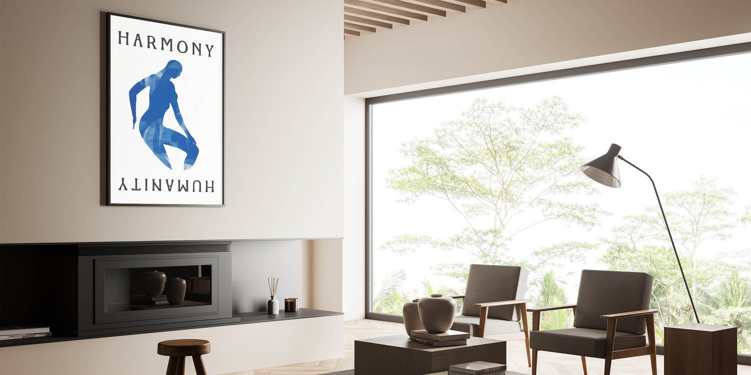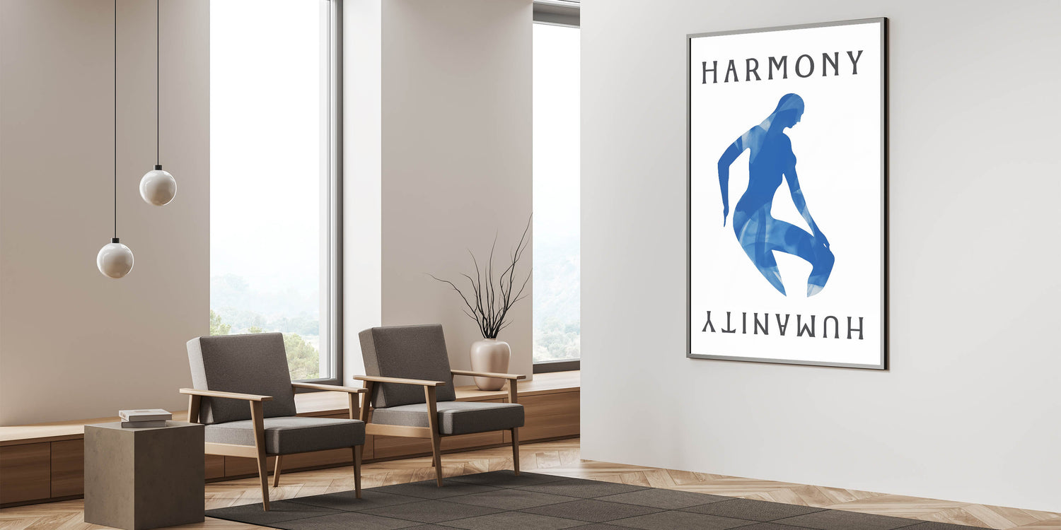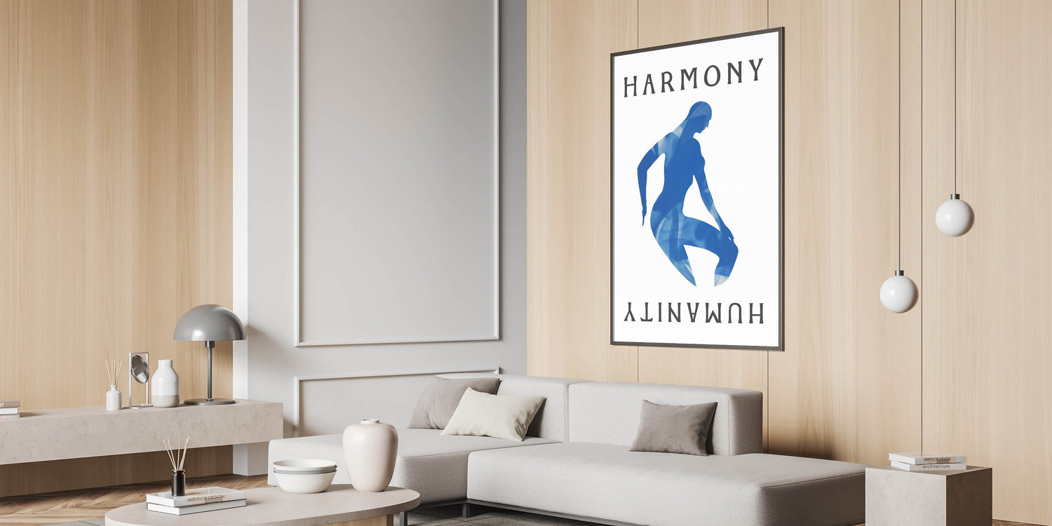 Introducing our Blue Harmony Silhouette, a striking piece that embodies simplicity and contemporary design. This abstract artwork features a serene blue silhouette with the words "Harmony" and "Humanity" on a neutral background, creating a captivating visual effect perfect for modern interiors.