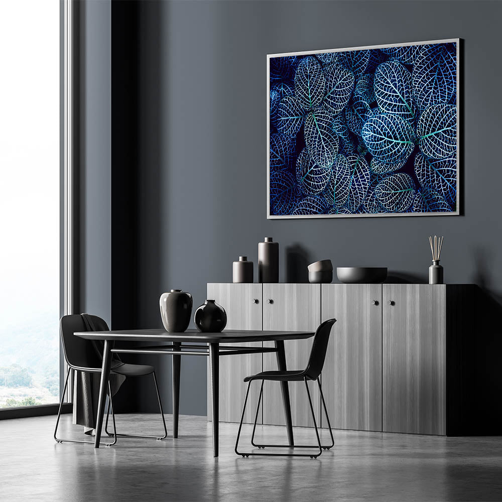 Add a touch of modern elegance to your space with this captivating blue leaf photography art. Featuring a detailed close-up of layered leaves with intricate vein patterns, this piece combines vibrant blue and white tones to create a mesmerizing visual. Perfect for nature lovers and modern art enthusiasts, this botanical leaf print is ideal for adding a contemporary yet organic feel to any room. Its bold contrast makes it a standout piece that enhances any living room, bedroom, or office space.