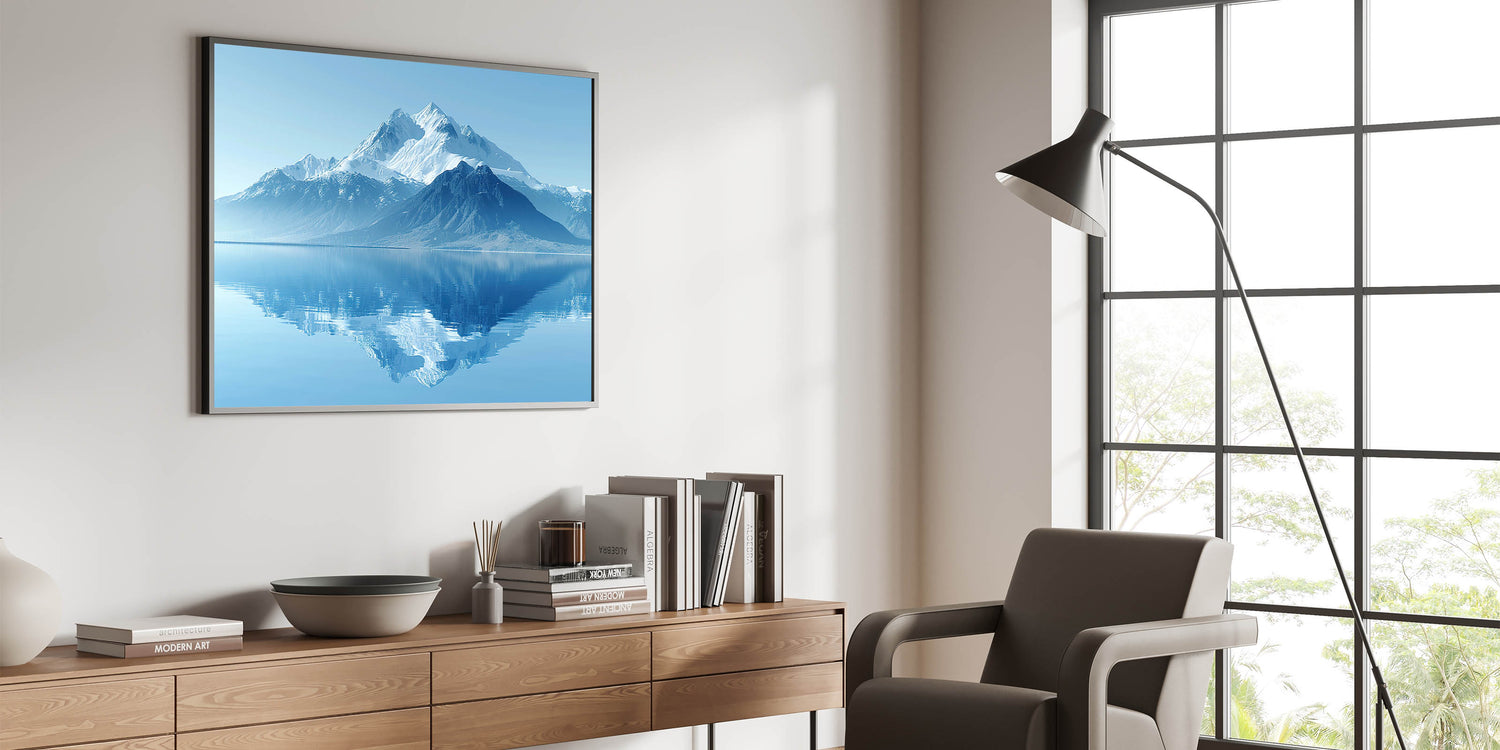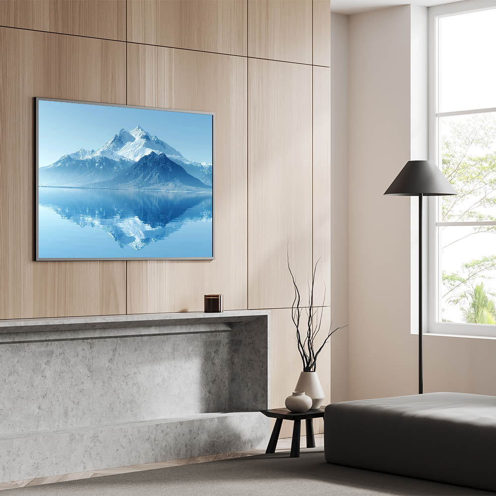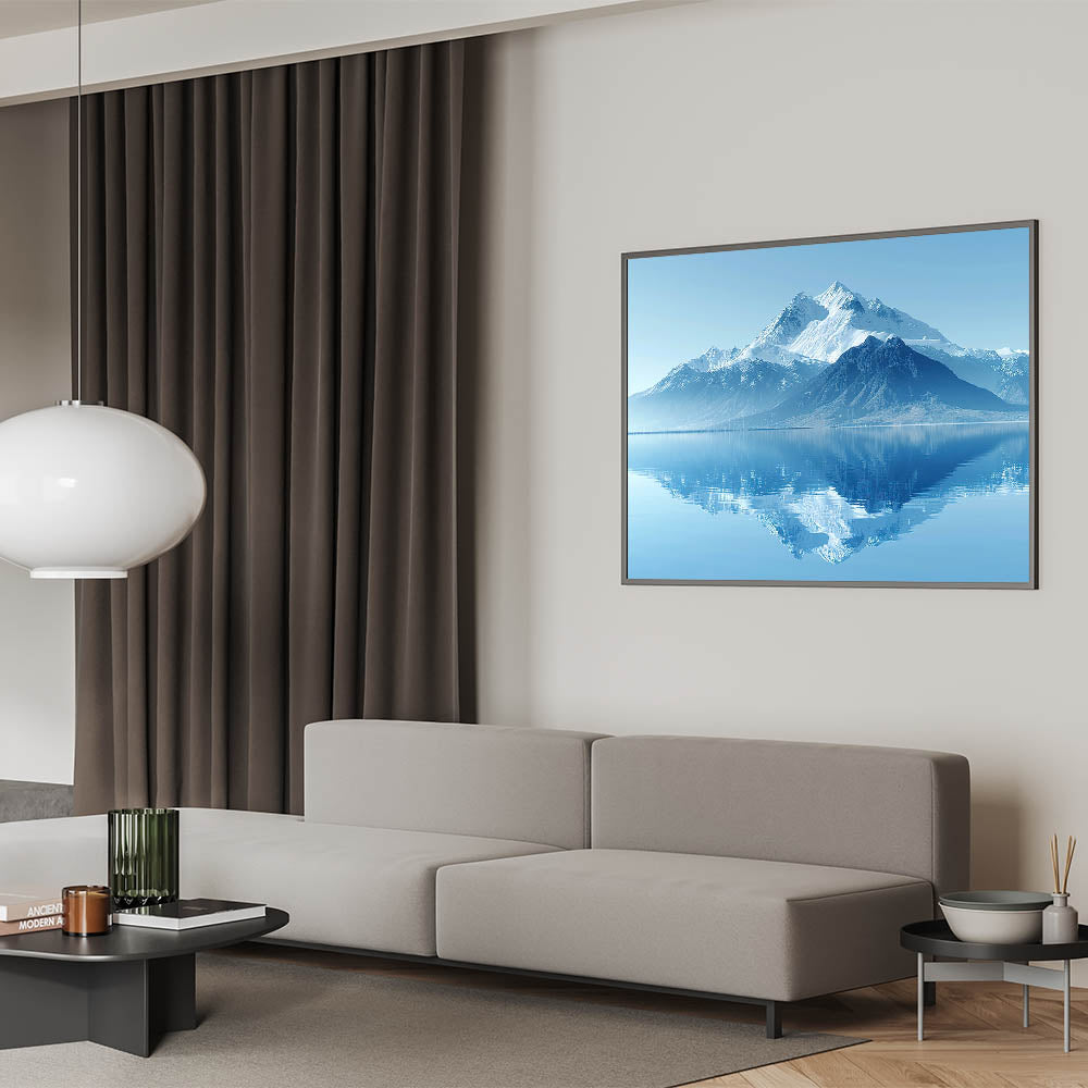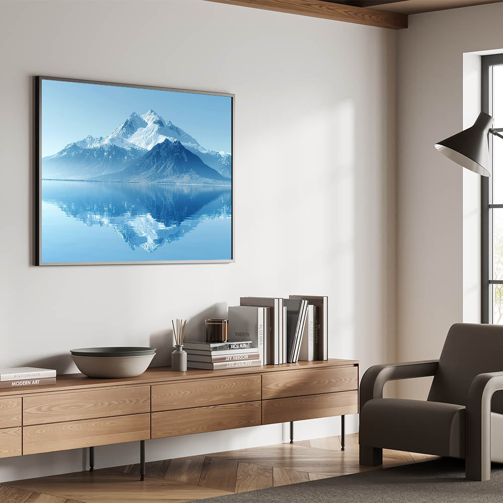This blue mountain reflection art piece is more than just decor; it’s a window into a peaceful and beautiful world, perfect for those who appreciate the tranquility of winter landscapes. Add this artwork to your collection to bring a touch of serene elegance into your home.