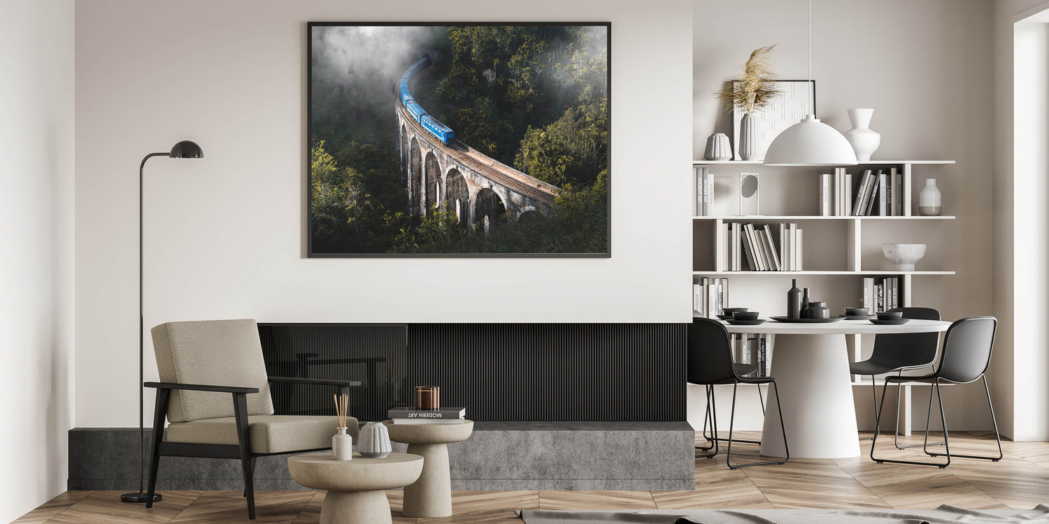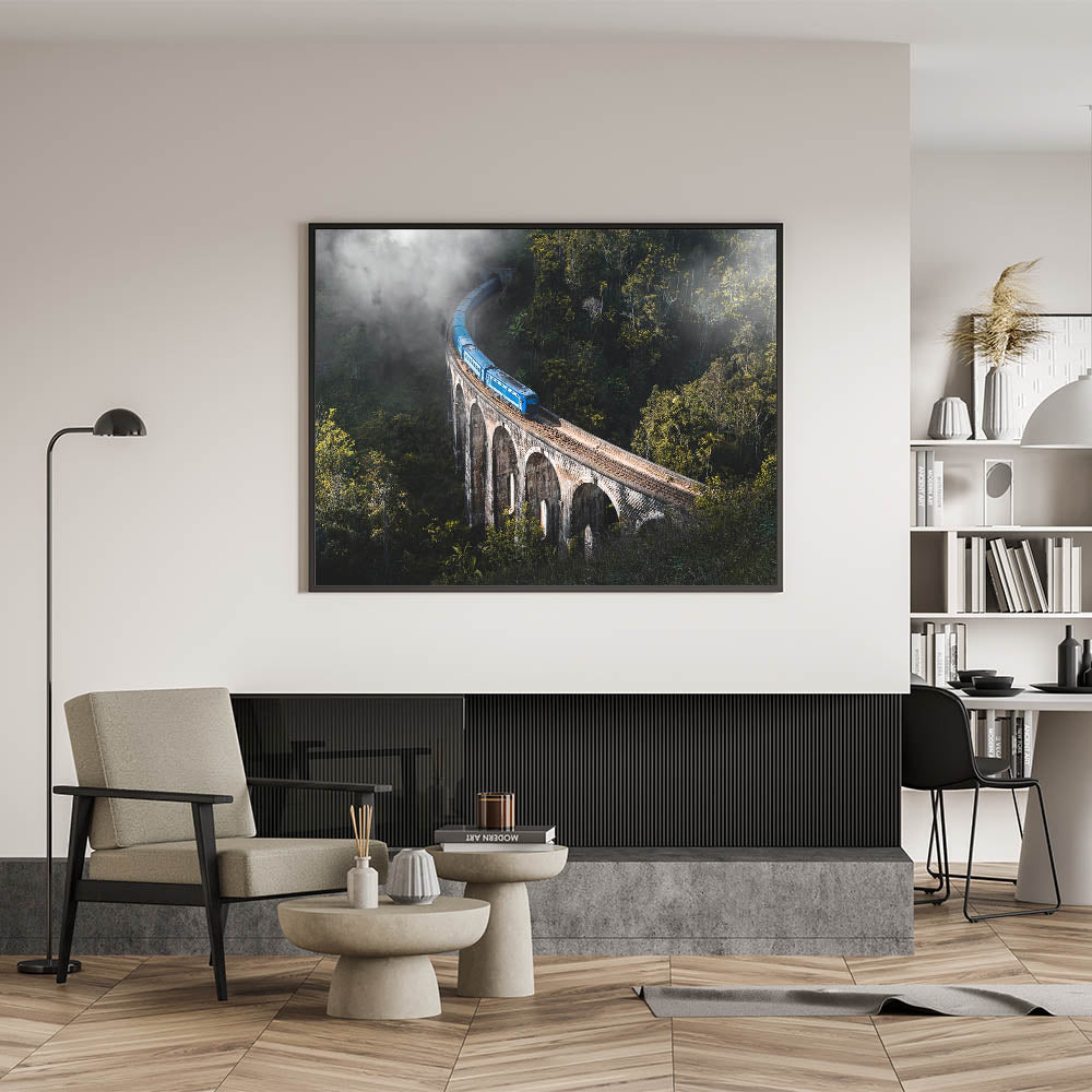 Transport yourself to a world of tranquility with this stunning Blue Train in Misty Forest Wall Art. This artwork captures the serene journey of a blue train as it winds through a lush, mist-covered forest on a majestic stone bridge. The soft mist and the deep green of the forest contrast beautifully with the vibrant blue of the train, creating a scene that is both peaceful and visually striking, perfect for any room in need of a calming touch.