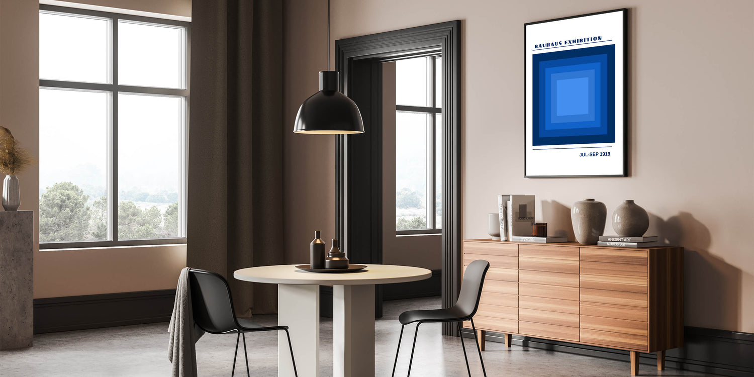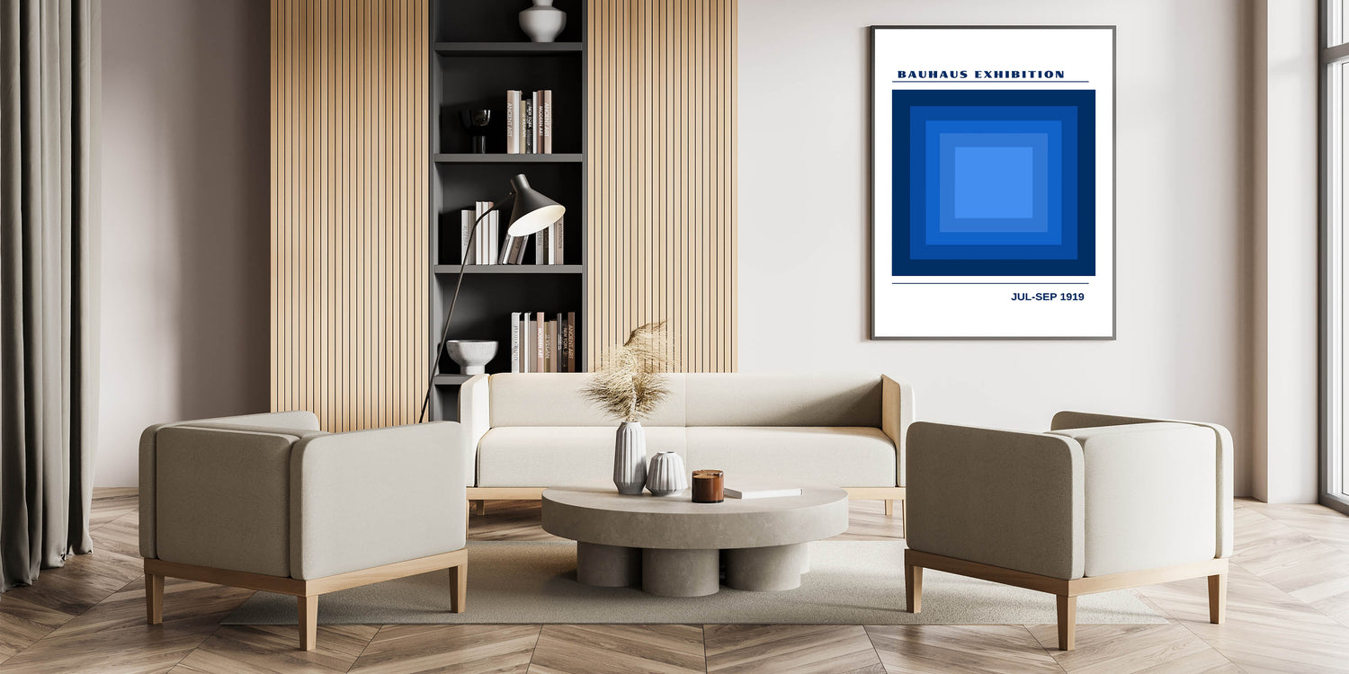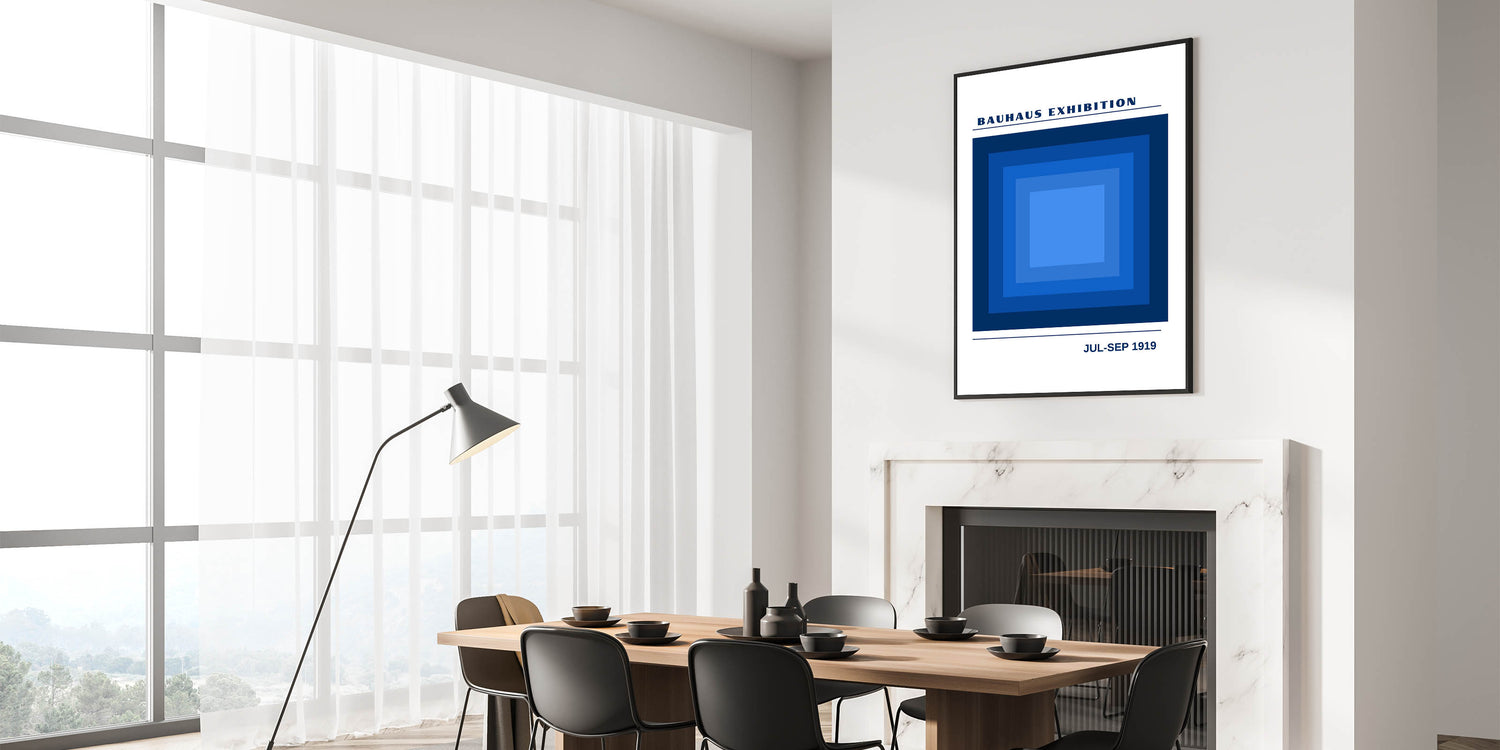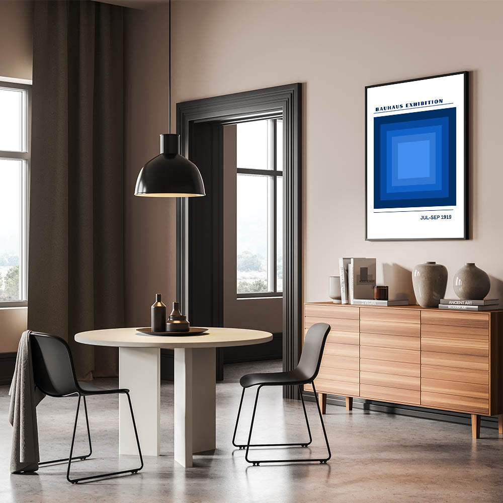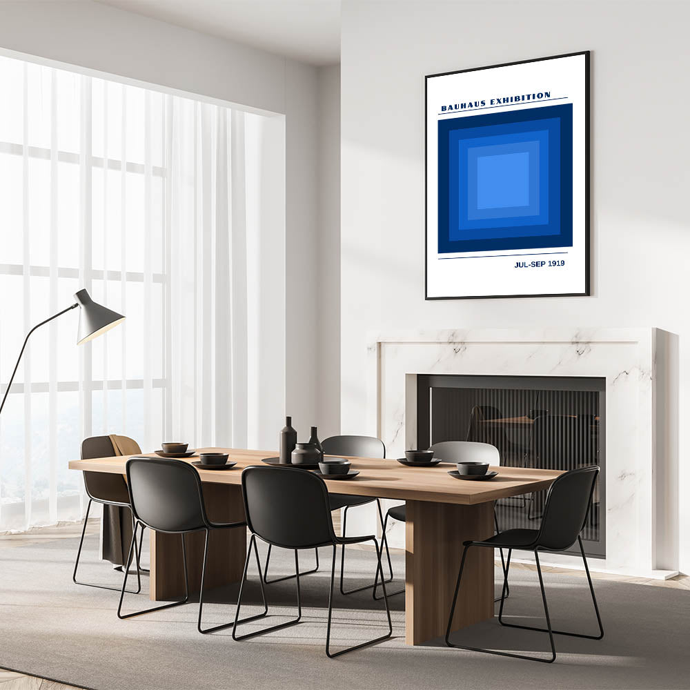 Transform your space with this striking unique bohemian artwork for modern spaces, inspired by the Bauhaus exhibition of 1919. Featuring a bold geometric design of layered blue squares, this piece uses shades of deep navy to light blue to create a sense of depth and movement. Ideal for any room needing a modern and artistic touch, this vibrant bohemian print adds both calm and energy to your décor. Whether in a living room, office, or bedroom, this eclectic boho wall art makes a statement with its minimalist geometric shapes.