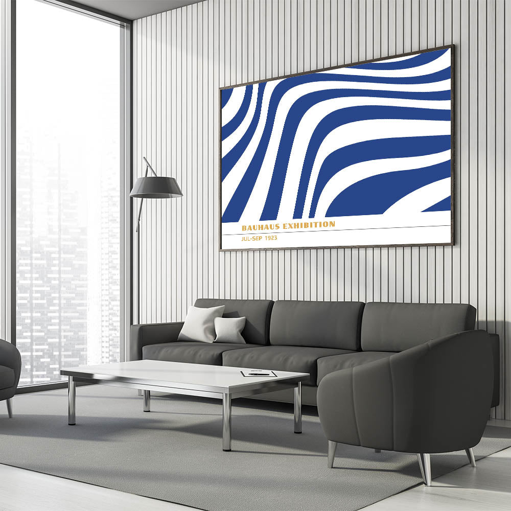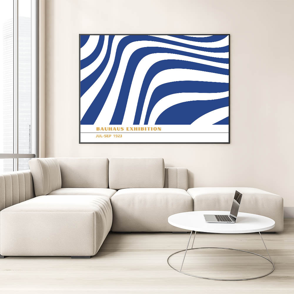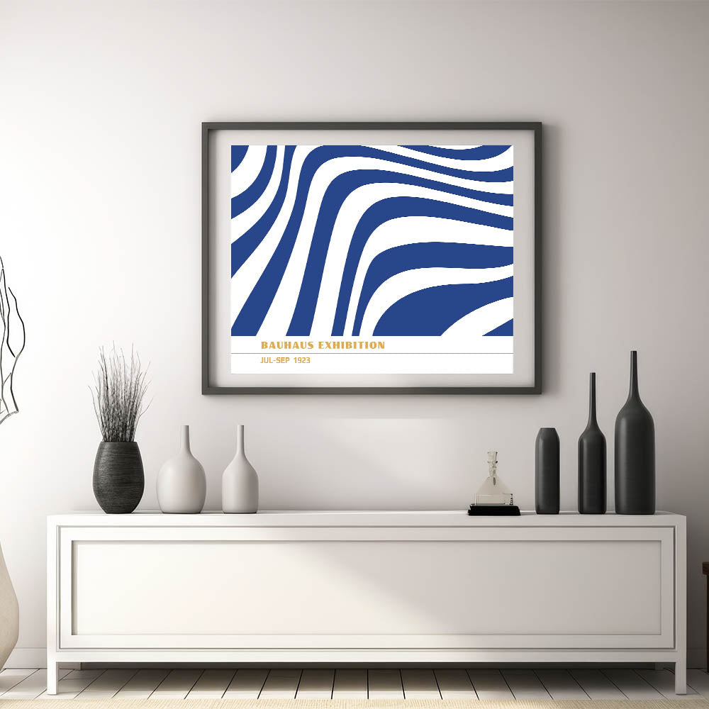 Infuse your living space with the elegance of this striking Bohemian wall art, featuring a flowing blue and white pattern inspired by the Bauhaus Exhibition of 1923. This artistic bohemian style print combines the fluidity of modern design with the boldness of boho decor, making it perfect for eclectic and contemporary spaces. The rich royal blue waves contrast beautifully with the white background, creating a sense of depth and movement that will transform any room into a stylish, dynamic space.