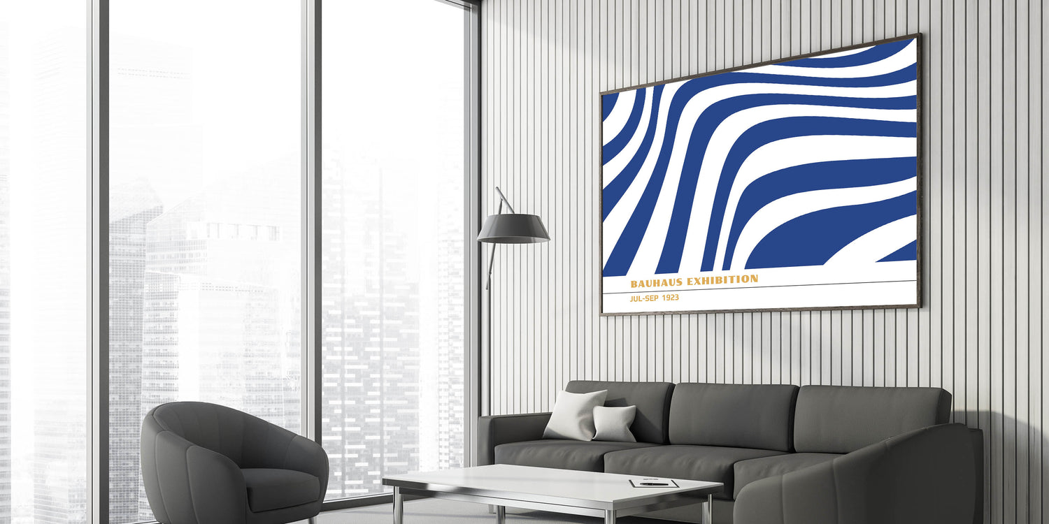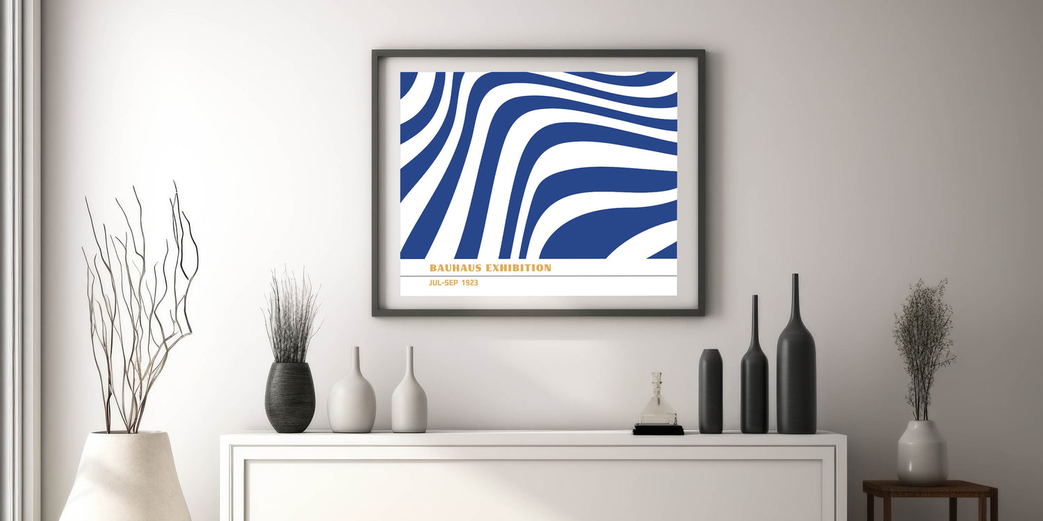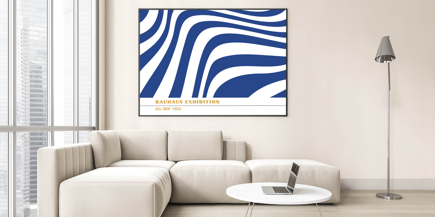 Infuse your living space with the elegance of this striking Bohemian wall art, featuring a flowing blue and white pattern inspired by the Bauhaus Exhibition of 1923. This artistic bohemian style print combines the fluidity of modern design with the boldness of boho decor, making it perfect for eclectic and contemporary spaces. The rich royal blue waves contrast beautifully with the white background, creating a sense of depth and movement that will transform any room into a stylish, dynamic space.