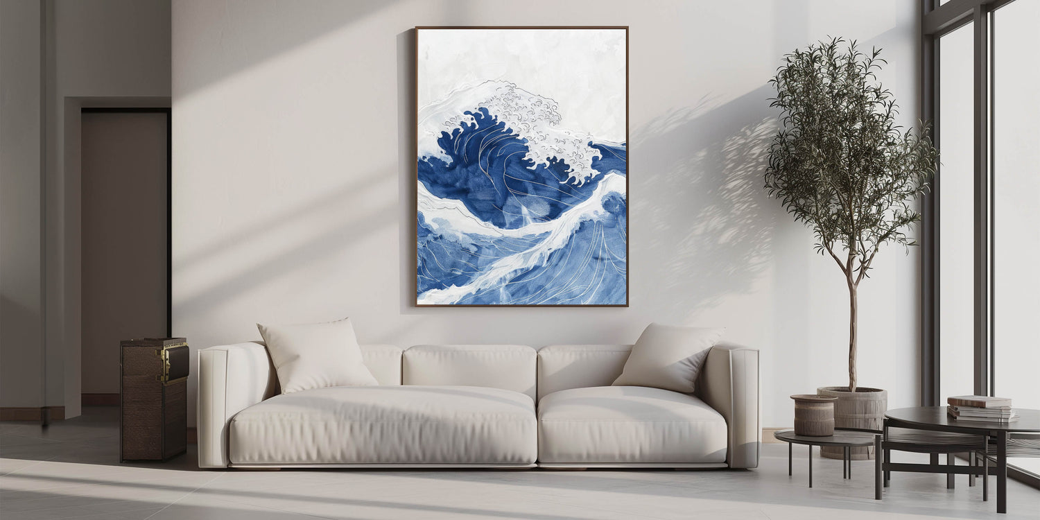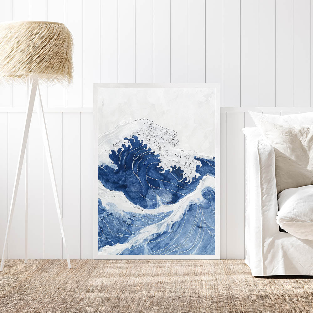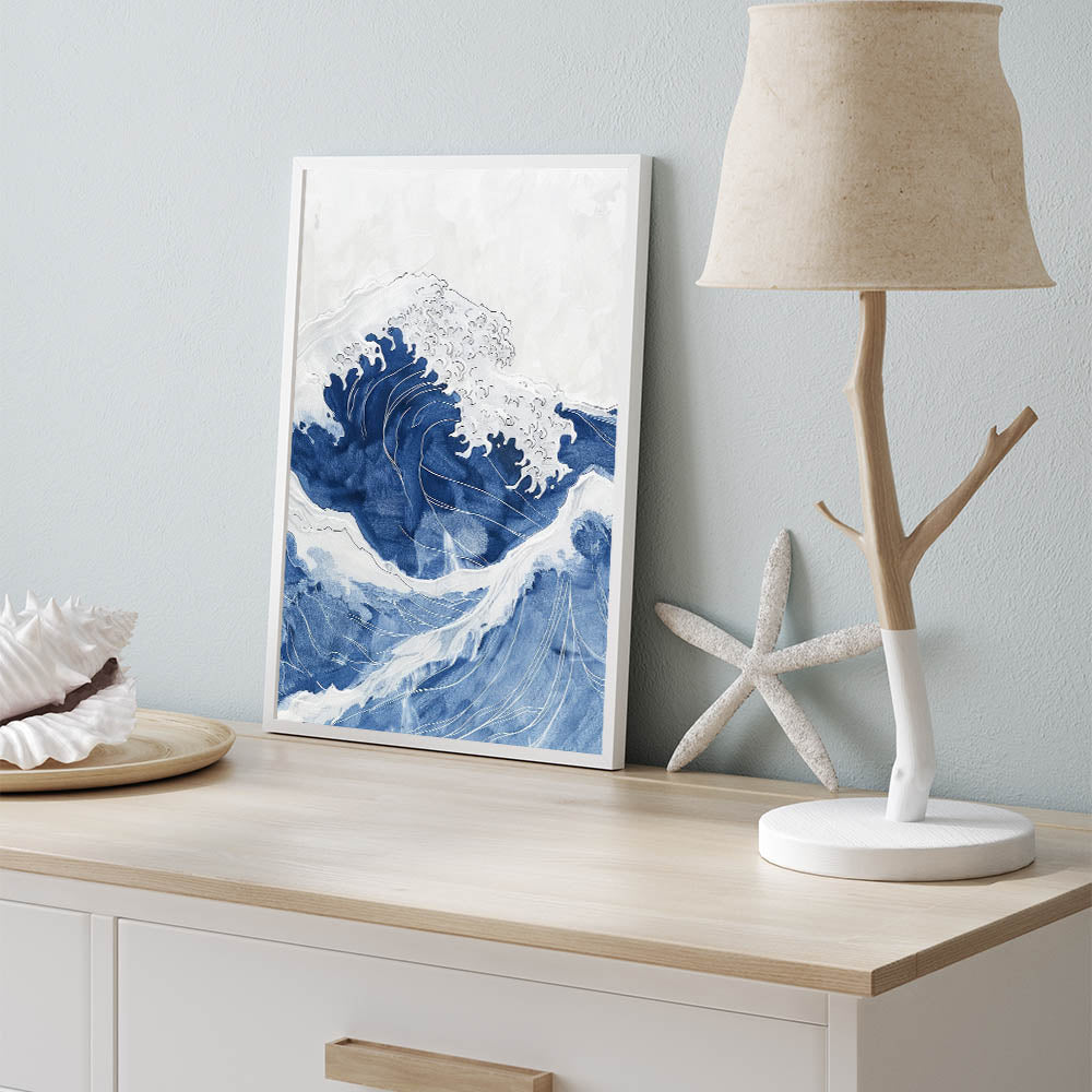 - High-resolution print guarantees that the rich blue tones and intricate wave patterns are vividly displayed.