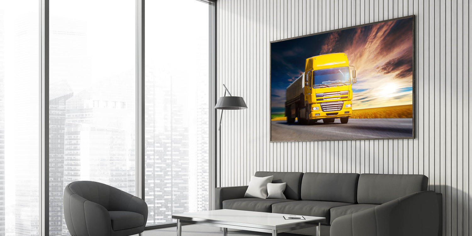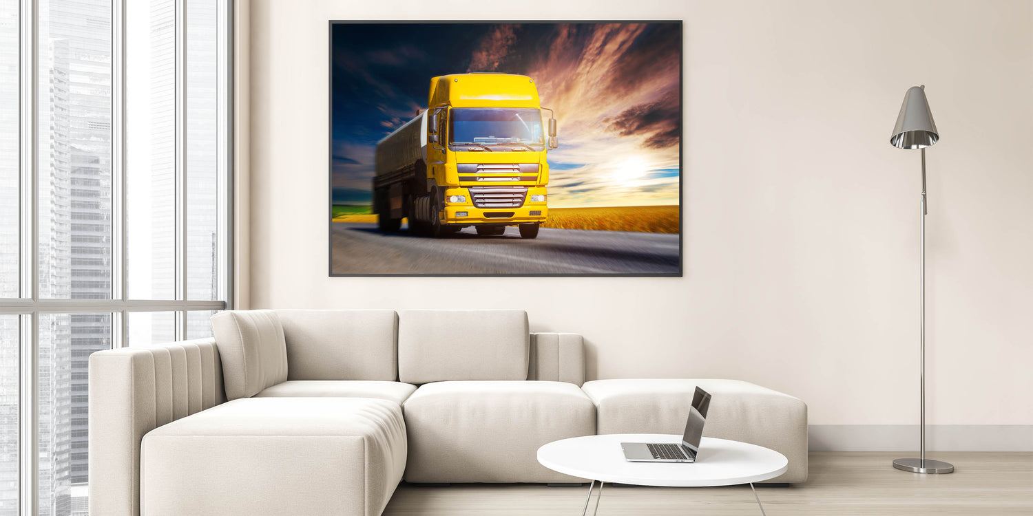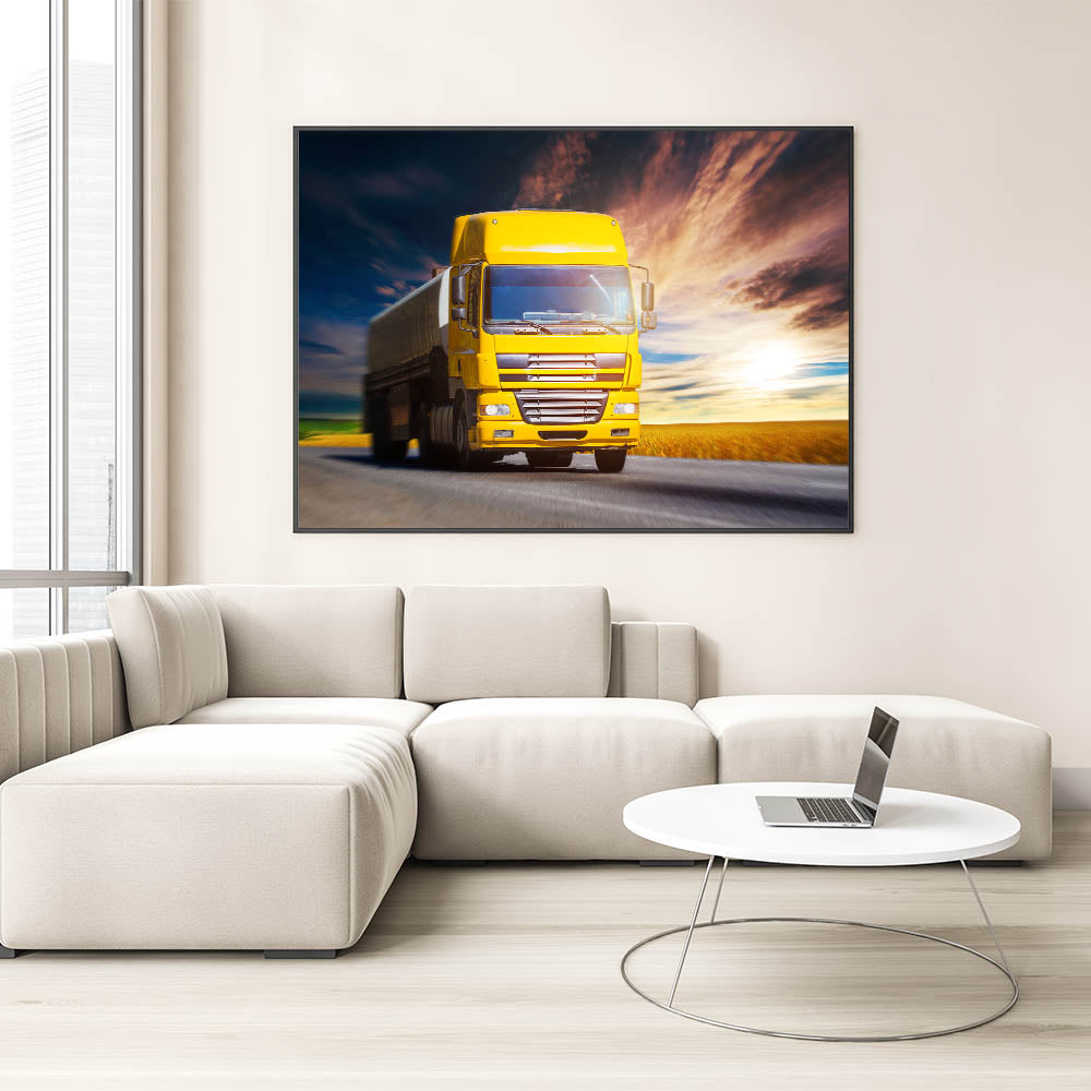 Add a burst of energy to your space with this striking wall art featuring a bold yellow truck speeding down a country road. The vibrant colors and dynamic composition make this piece a perfect focal point for any modern room. Capturing the power and motion of a truck in action, this artwork is ideal for those who appreciate both the beauty of transportation and the open road.