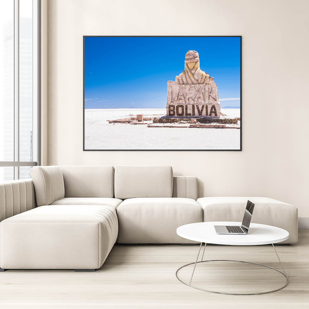 This stunning Bolivian landscape print captures the famous Dakar Monument in the heart of Bolivia's expansive Uyuni Salt Flats. The white salt flats stretch endlessly under a clear blue sky, highlighting the rugged texture of the monument. The simplicity and grandeur of the scene evoke a sense of timelessness and awe, making it an ideal piece for those who appreciate bold, minimalist landscapes and the cultural significance of Dakar's presence in Bolivia.