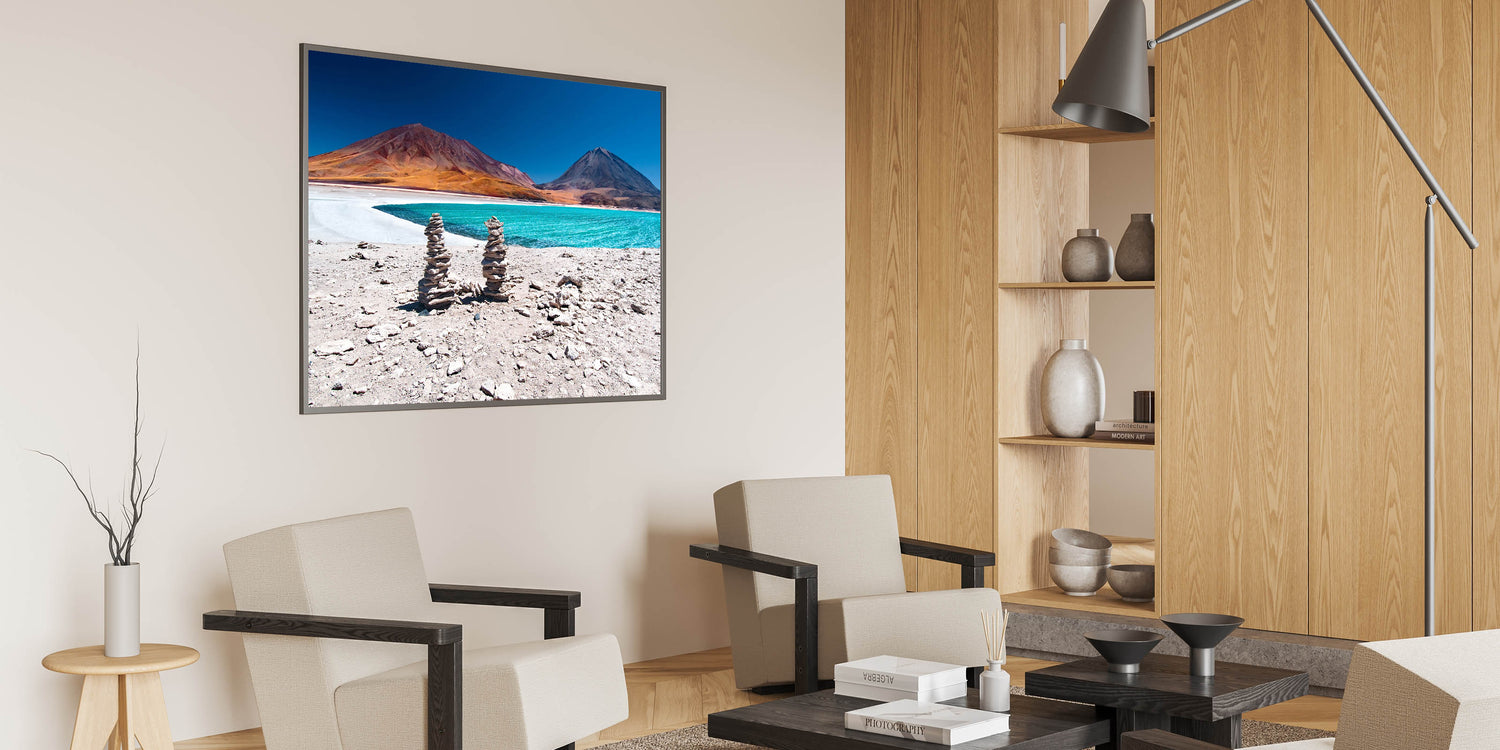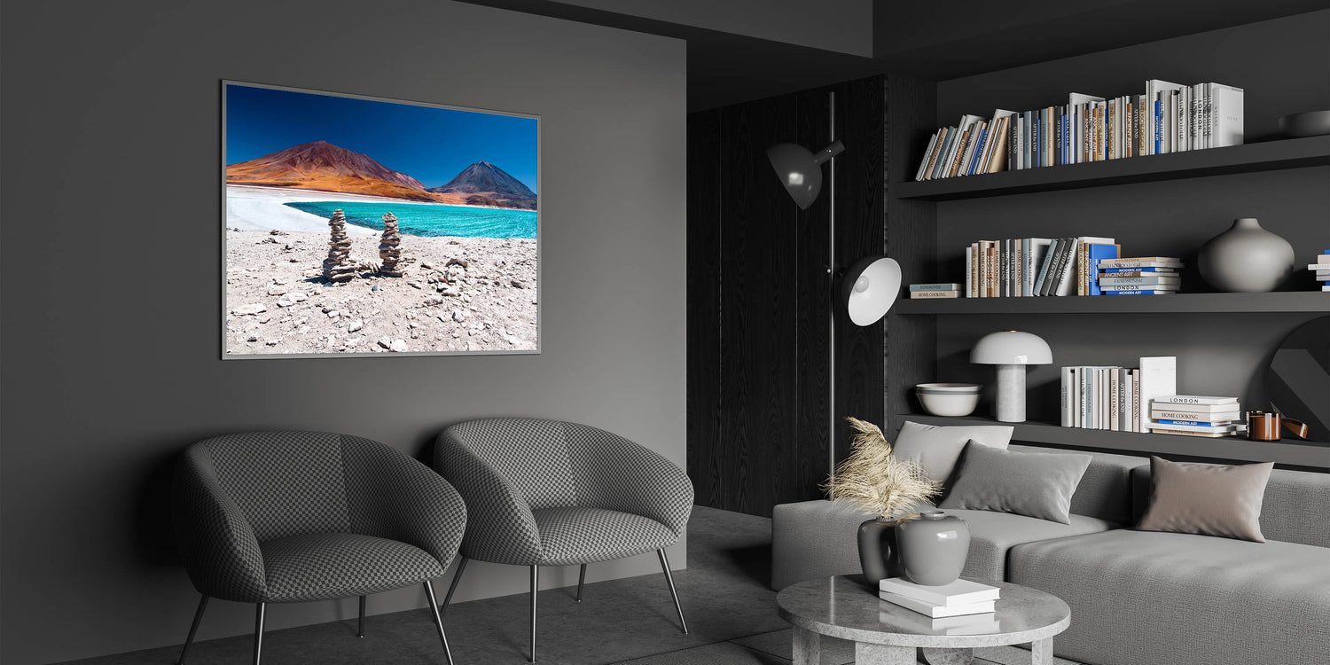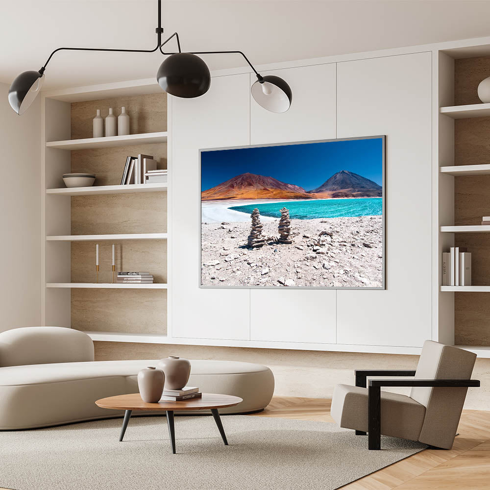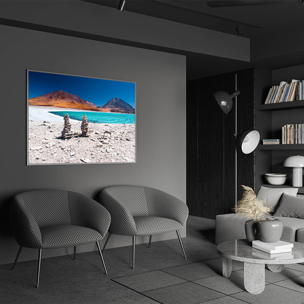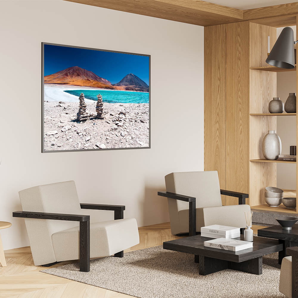 This stunning Bolivian landscape print captures the serene beauty of a turquoise lake framed by the towering Andes Mountains. The vibrant contrast of the bright lake water against the warm, earthy tones of the mountains creates a striking visual experience. The carefully stacked stone cairns in the foreground add a touch of human presence to this breathtaking natural setting, making it perfect for those who appreciate the raw beauty of South American scenery.