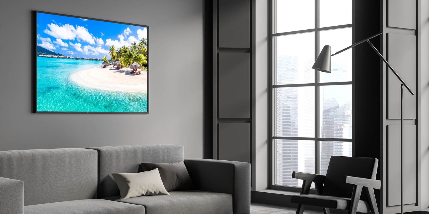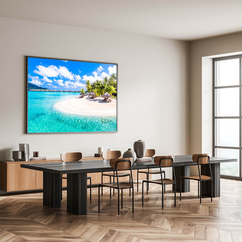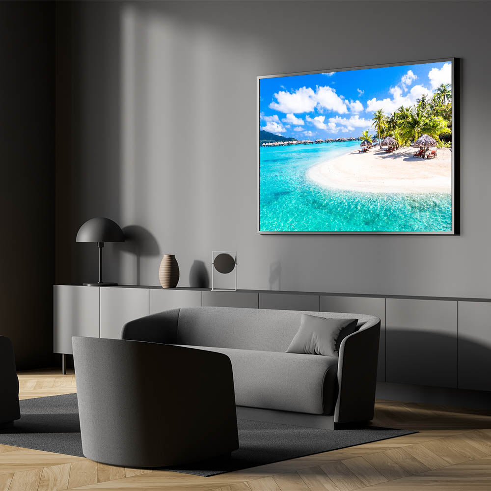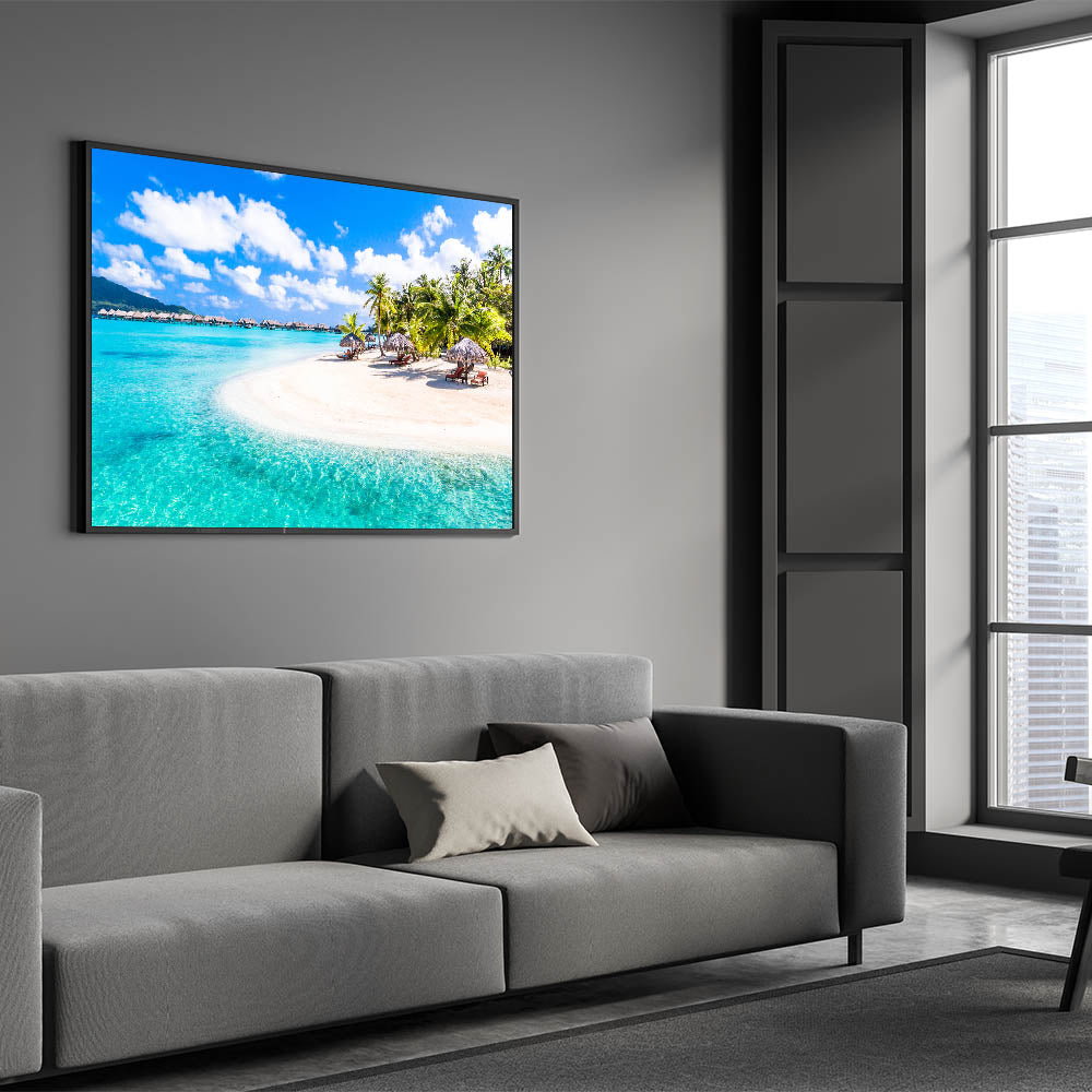 Immerse yourself in the paradise of Bora Bora with our "Tropical Resort Art" canvas. This stunning print features a pristine beach with crystal-clear waters, lined with thatched-roof bungalows and lush palm trees, epitomizing the essence of a luxury tropical getaway.