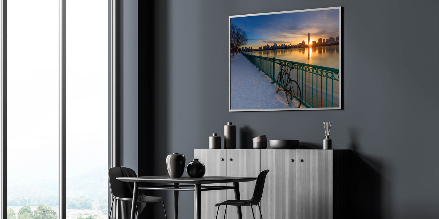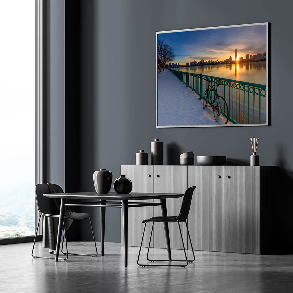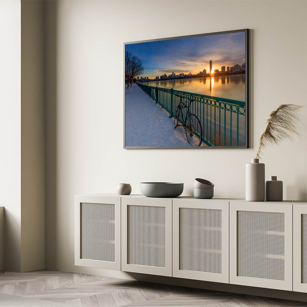 This stunning Boston Wall Art captures the beauty of a serene winter morning as the sun rises over the city skyline. The golden light reflects on the calm water and snow-covered path, creating a peaceful yet striking scene. The bicycle leaning against the railing adds a touch of stillness to the image, perfectly balancing the glow of the sunrise. This Massachusetts Wall Art brings the beauty of the Boston waterfront into your space, ideal for adding warmth and elegance to any room. Whether you’re decorating your home or office, this Boston Canvas Print is a timeless piece of Artistic Boston Scenery.