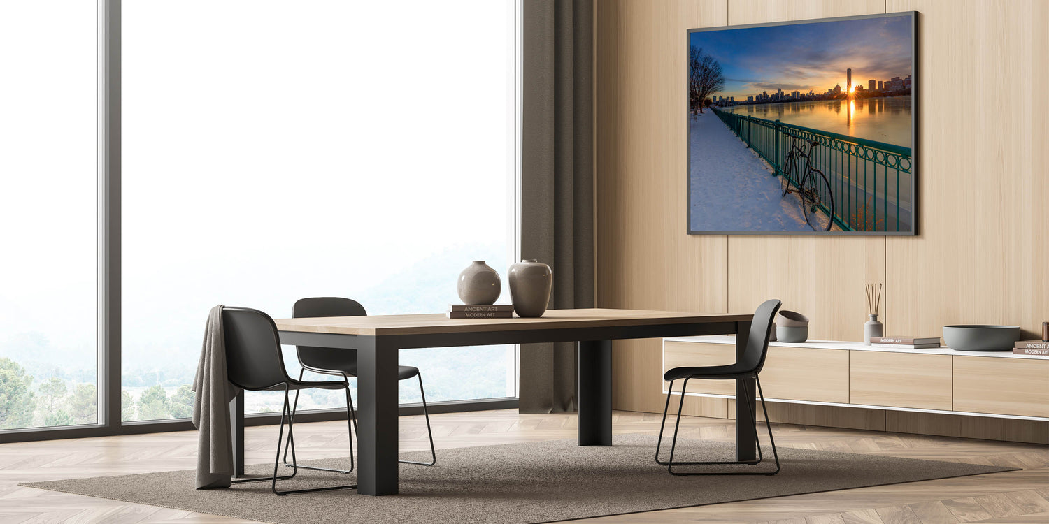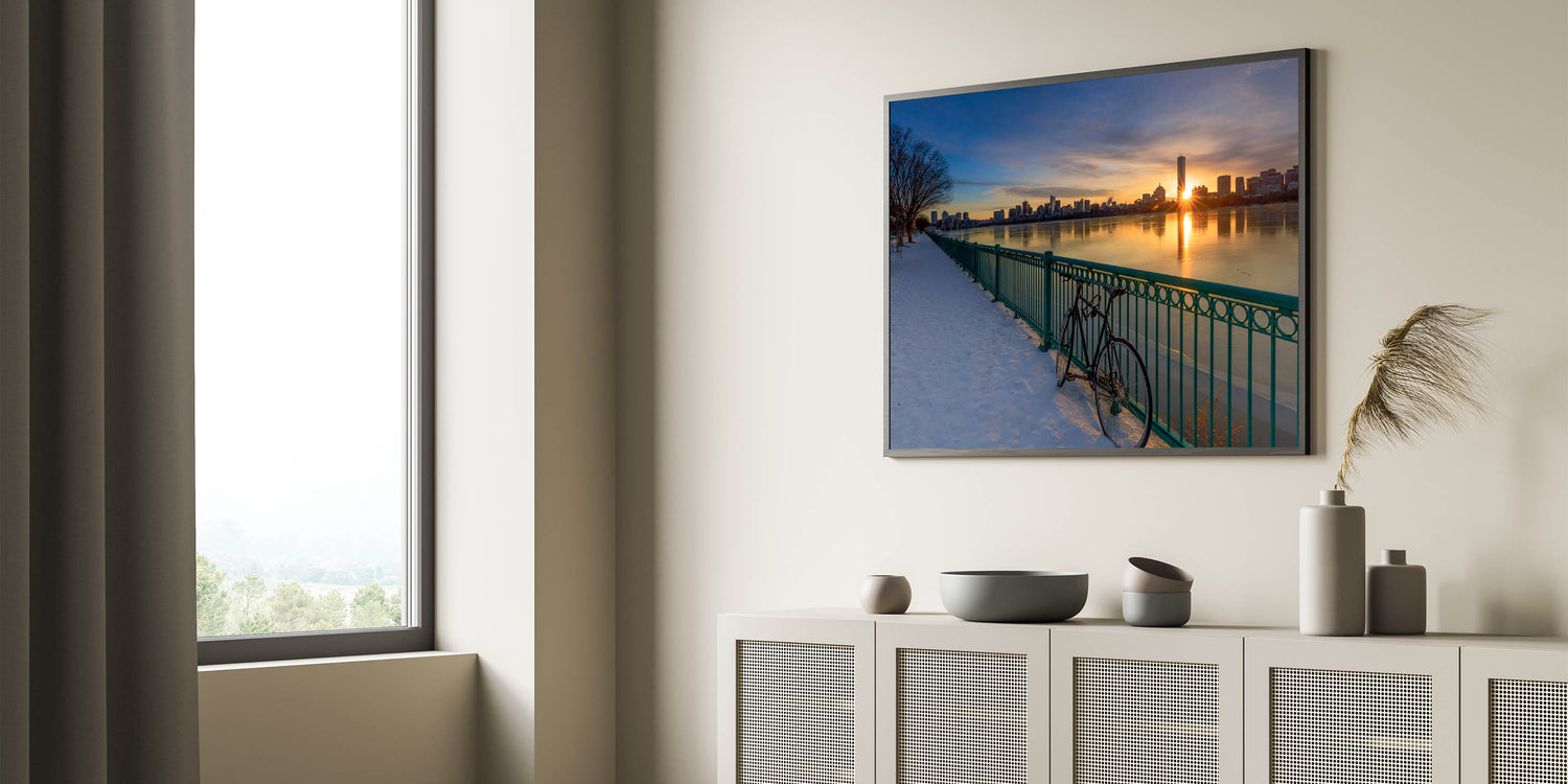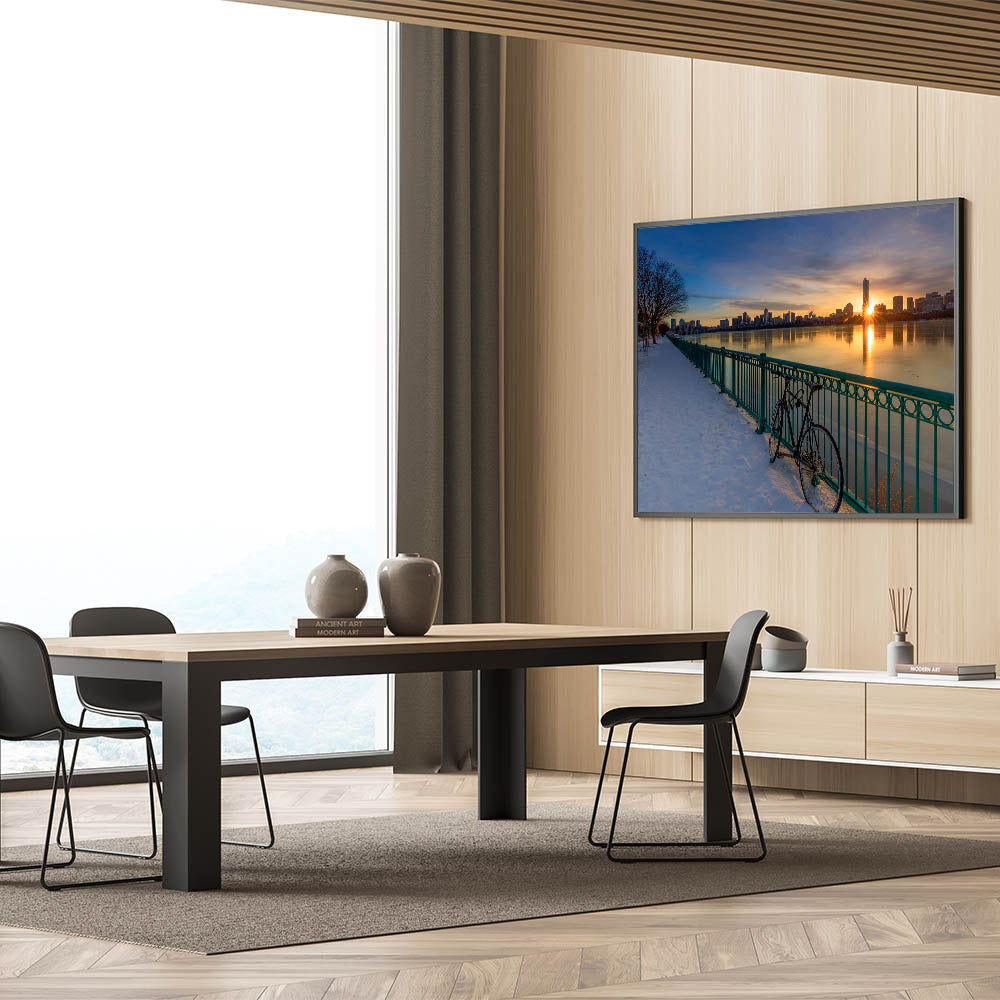 This stunning Boston Wall Art captures the beauty of a serene winter morning as the sun rises over the city skyline. The golden light reflects on the calm water and snow-covered path, creating a peaceful yet striking scene. The bicycle leaning against the railing adds a touch of stillness to the image, perfectly balancing the glow of the sunrise. This Massachusetts Wall Art brings the beauty of the Boston waterfront into your space, ideal for adding warmth and elegance to any room. Whether you’re decorating your home or office, this Boston Canvas Print is a timeless piece of Artistic Boston Scenery.