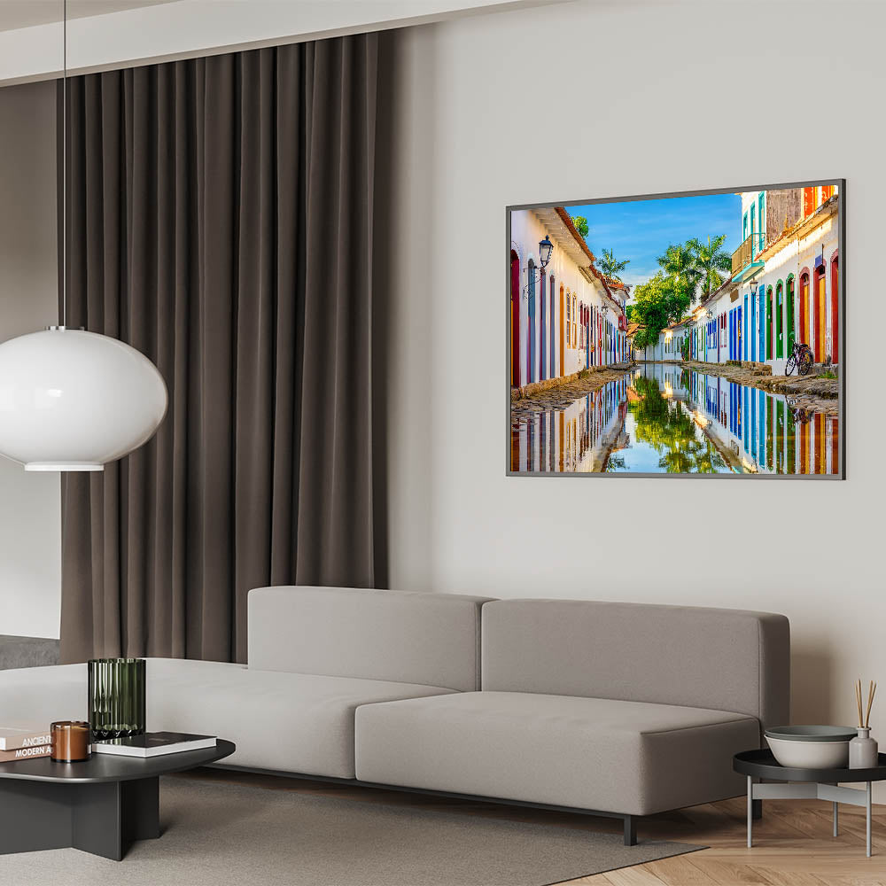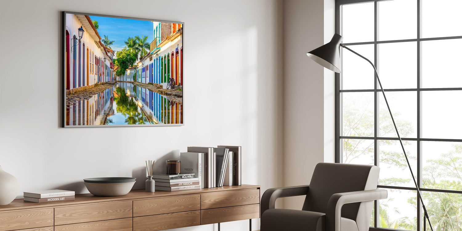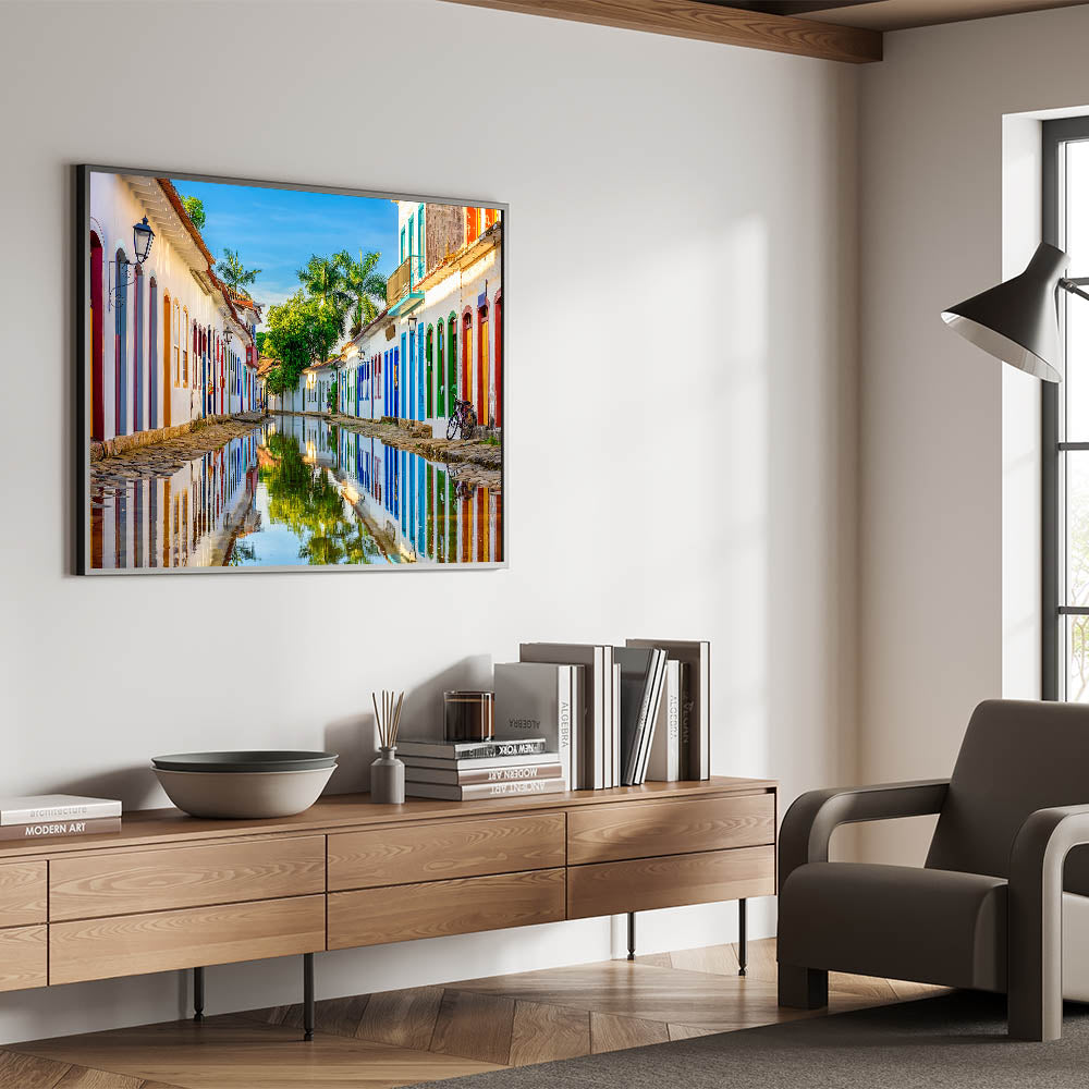 Bring the charm of historic Paraty into your space with this vibrant Brazil wall art. Capturing the reflective beauty of the colonial streets of this stunning Brazilian town, this piece of Brazilian landscape art effortlessly combines color, culture, and natural scenery. The serene waters mirror the colorful facades of traditional buildings, making this a perfect statement piece for your home or office.