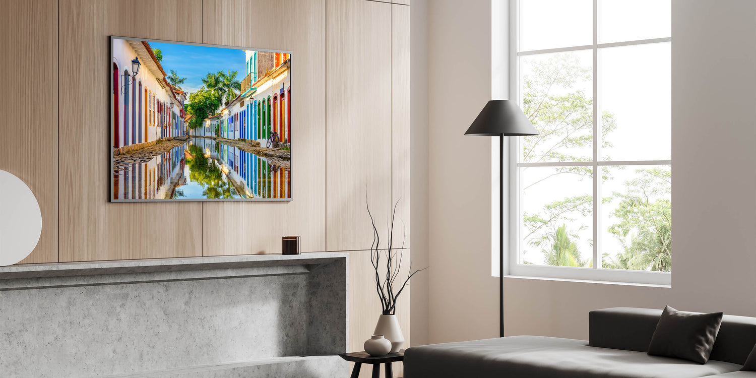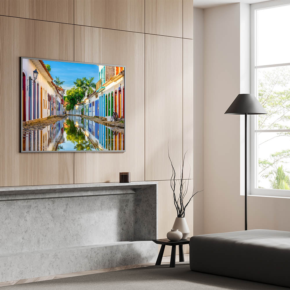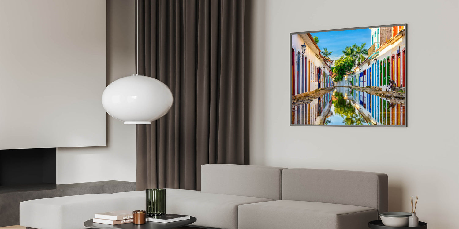 Bring the charm of historic Paraty into your space with this vibrant Brazil wall art. Capturing the reflective beauty of the colonial streets of this stunning Brazilian town, this piece of Brazilian landscape art effortlessly combines color, culture, and natural scenery. The serene waters mirror the colorful facades of traditional buildings, making this a perfect statement piece for your home or office.