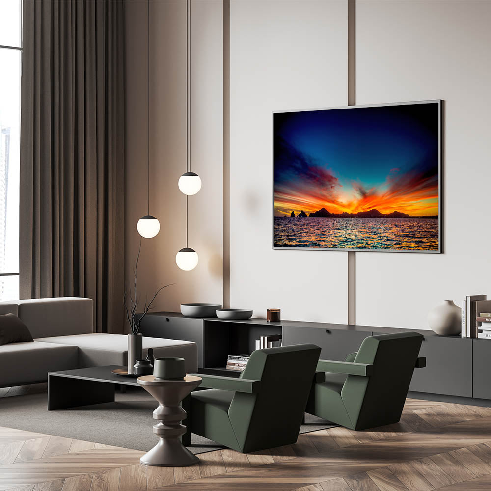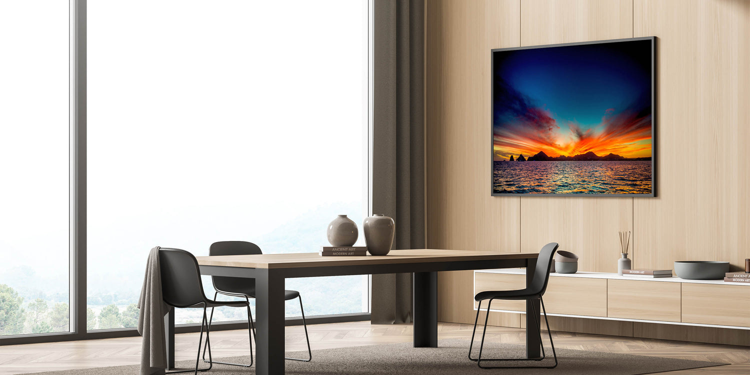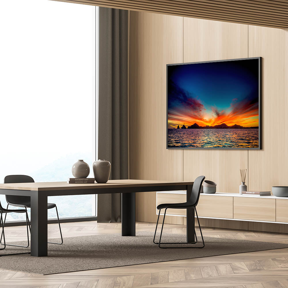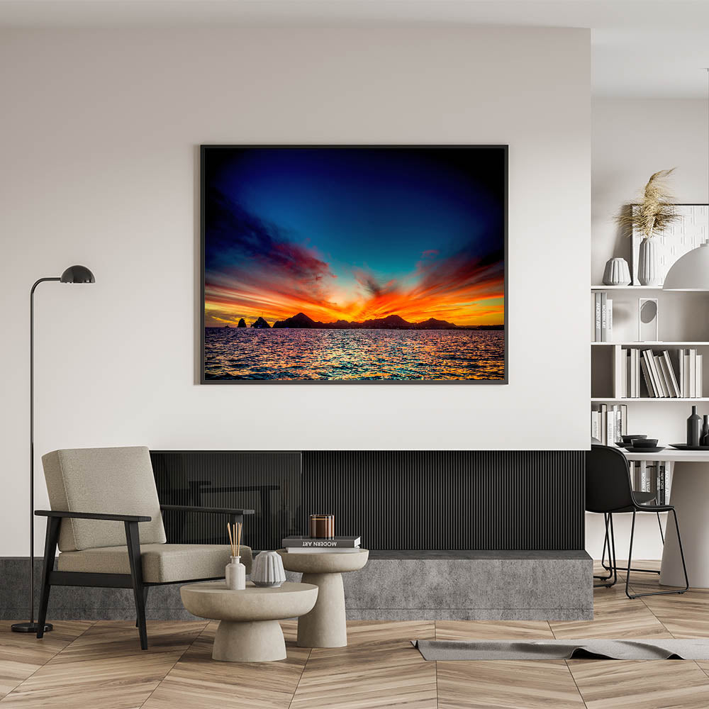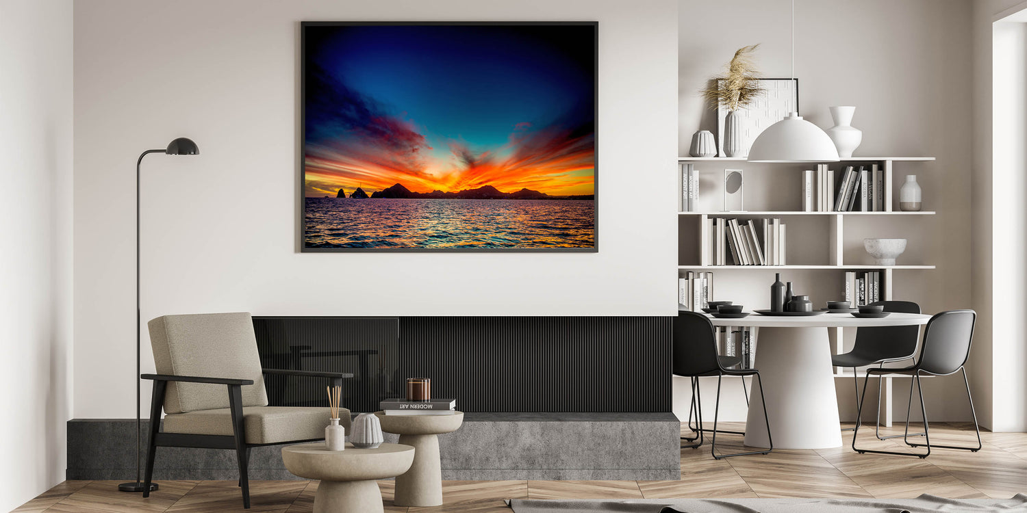 Bring the vibrant beauty of Cabo San Lucas sunsets into your home with this breathtaking wall art. Featuring a stunning mix of fiery reds, oranges, and deep blues as the sun sets over the ocean, this piece captures the essence of coastal tranquility and the natural wonders of Baja California. Perfect for those looking to add a dramatic yet calming touch to their space, this sunset wall art will make a statement in any room.