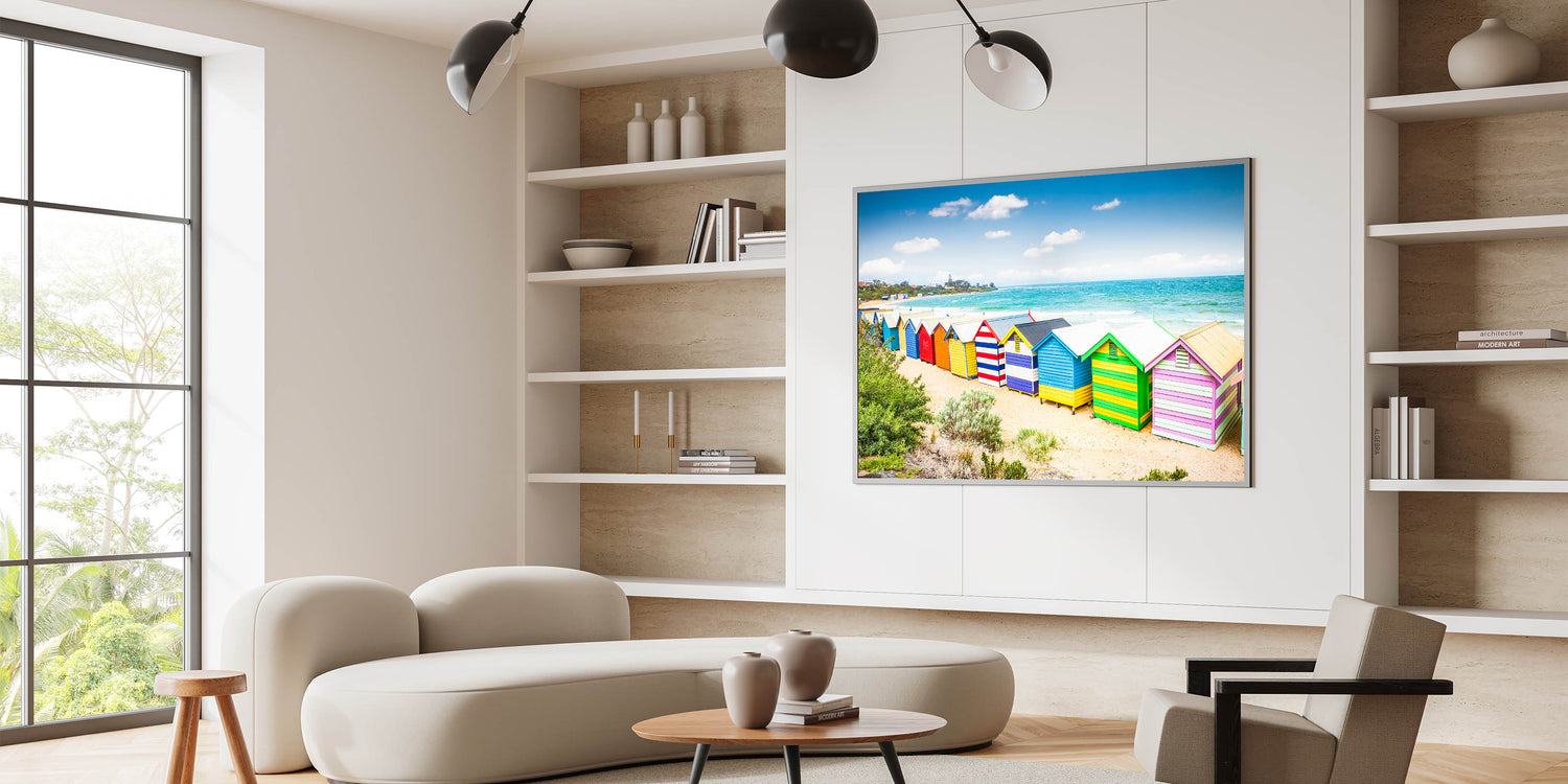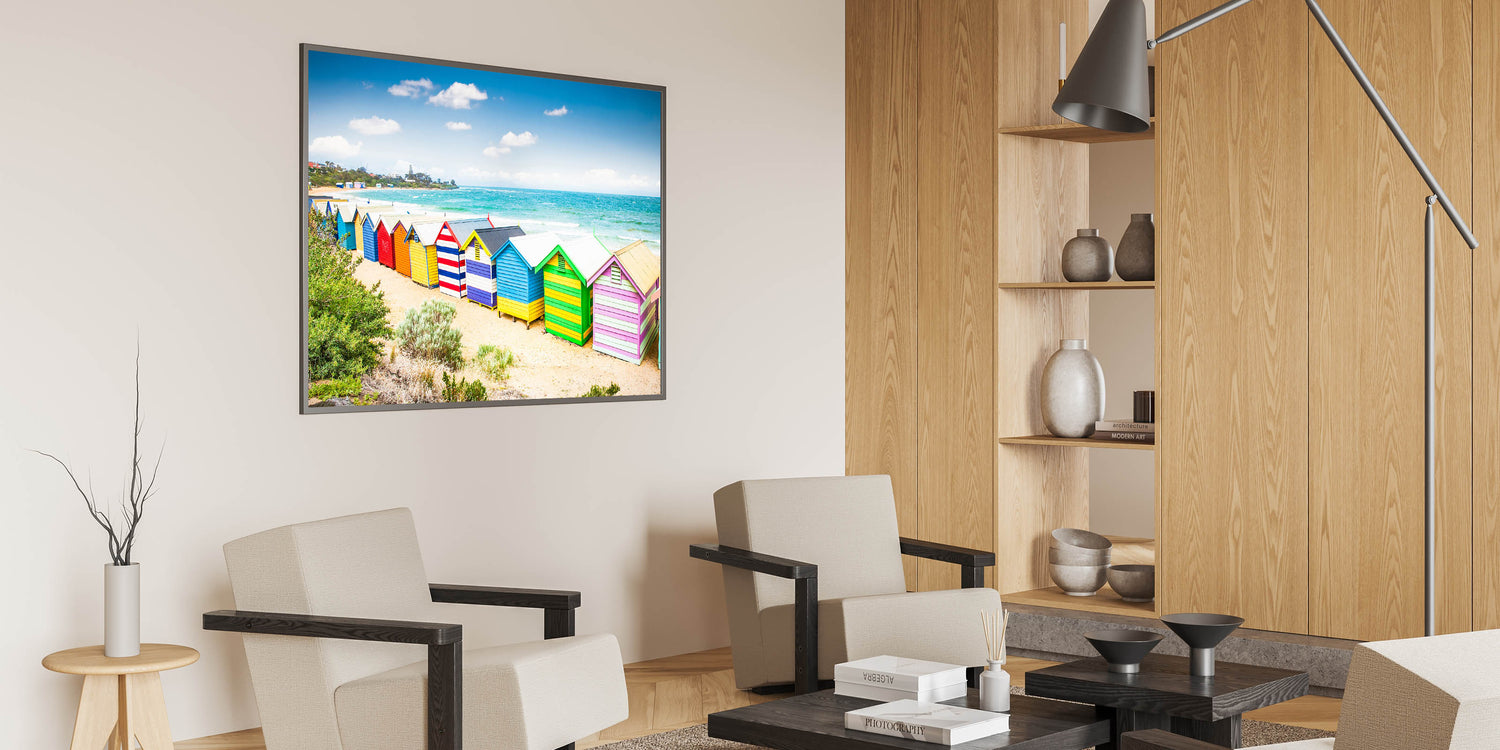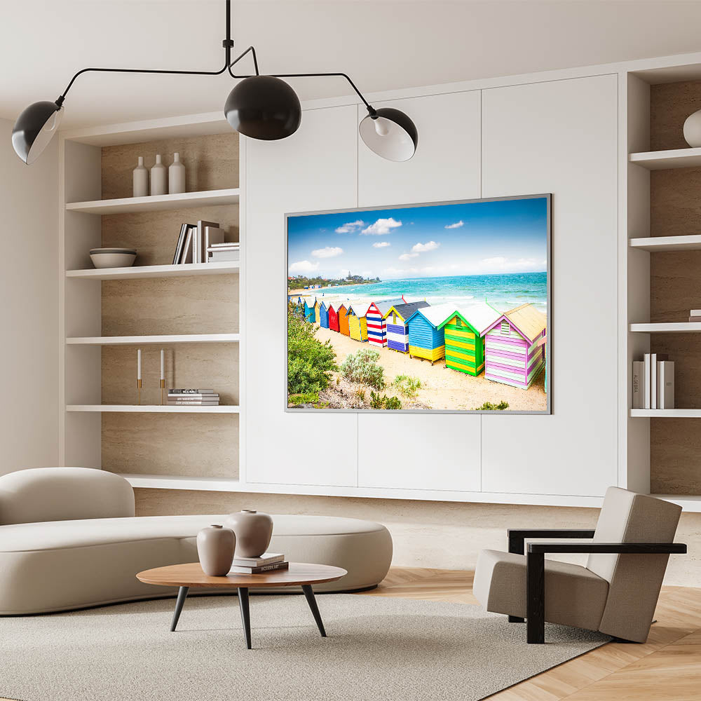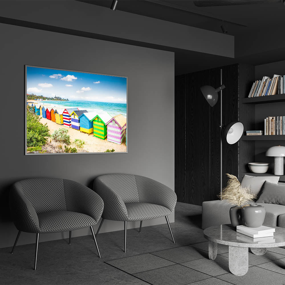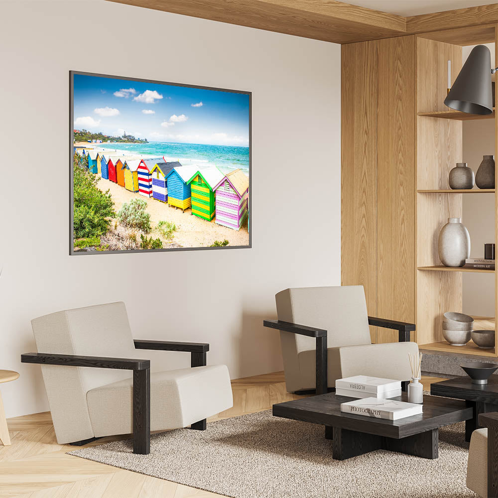 Transform your home with this delightful Melbourne beach scene. The bright colors of the huts and the serene seaside will add a joyful and refreshing vibe to your interior, making it a standout piece in any collection.