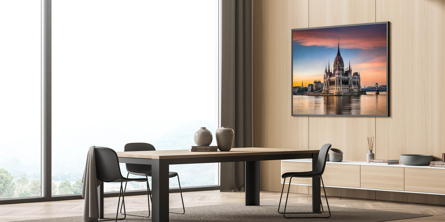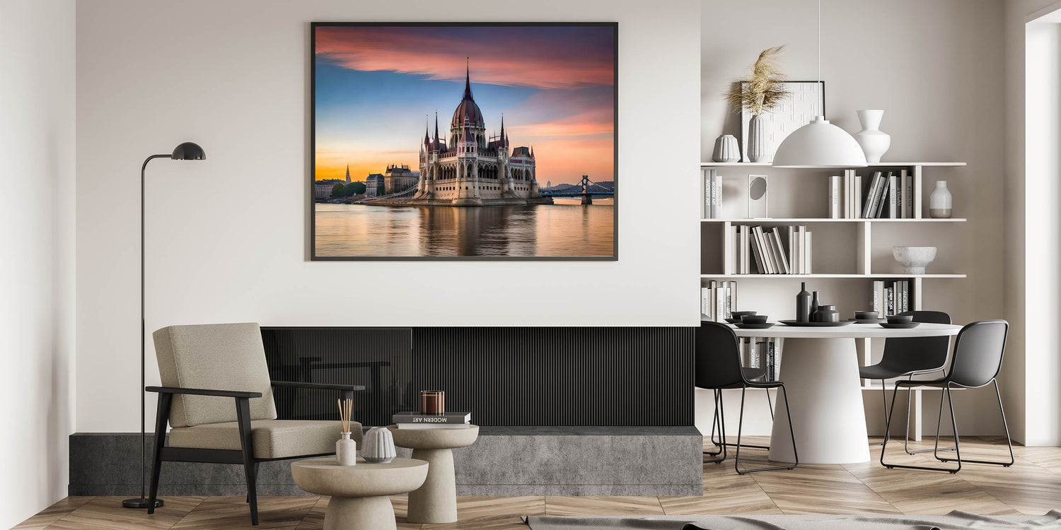 Add a touch of elegance to your home with this breathtaking Budapest canvas print, featuring the iconic Hungarian Parliament at sunrise. The soft hues of the morning sky reflect beautifully off the calm waters of the Danube River, creating a serene and captivating composition. The grandeur of the Parliament building, with its intricate architectural details, stands out against the glowing colors of the dawn, making this artwork a perfect centerpiece for any room.