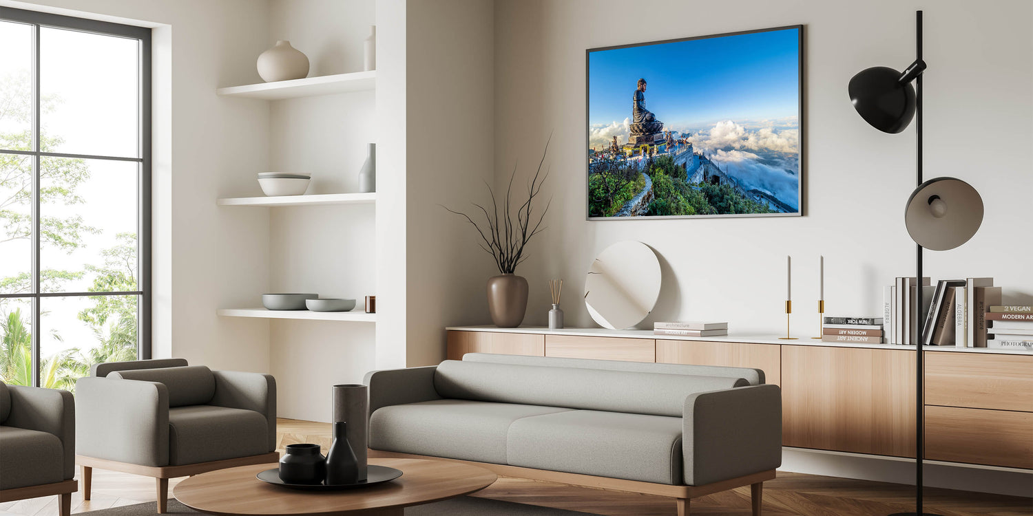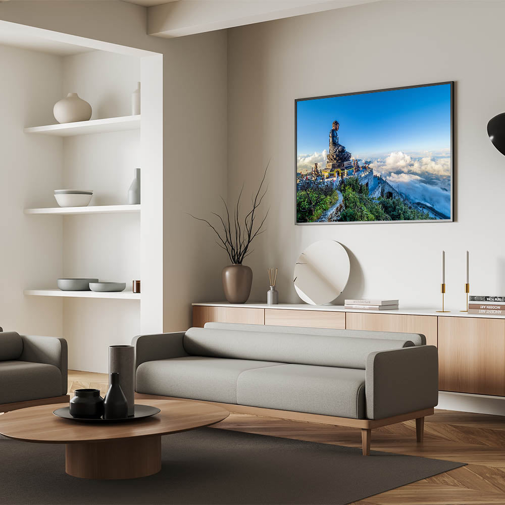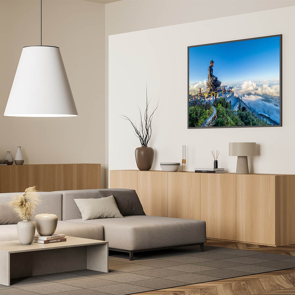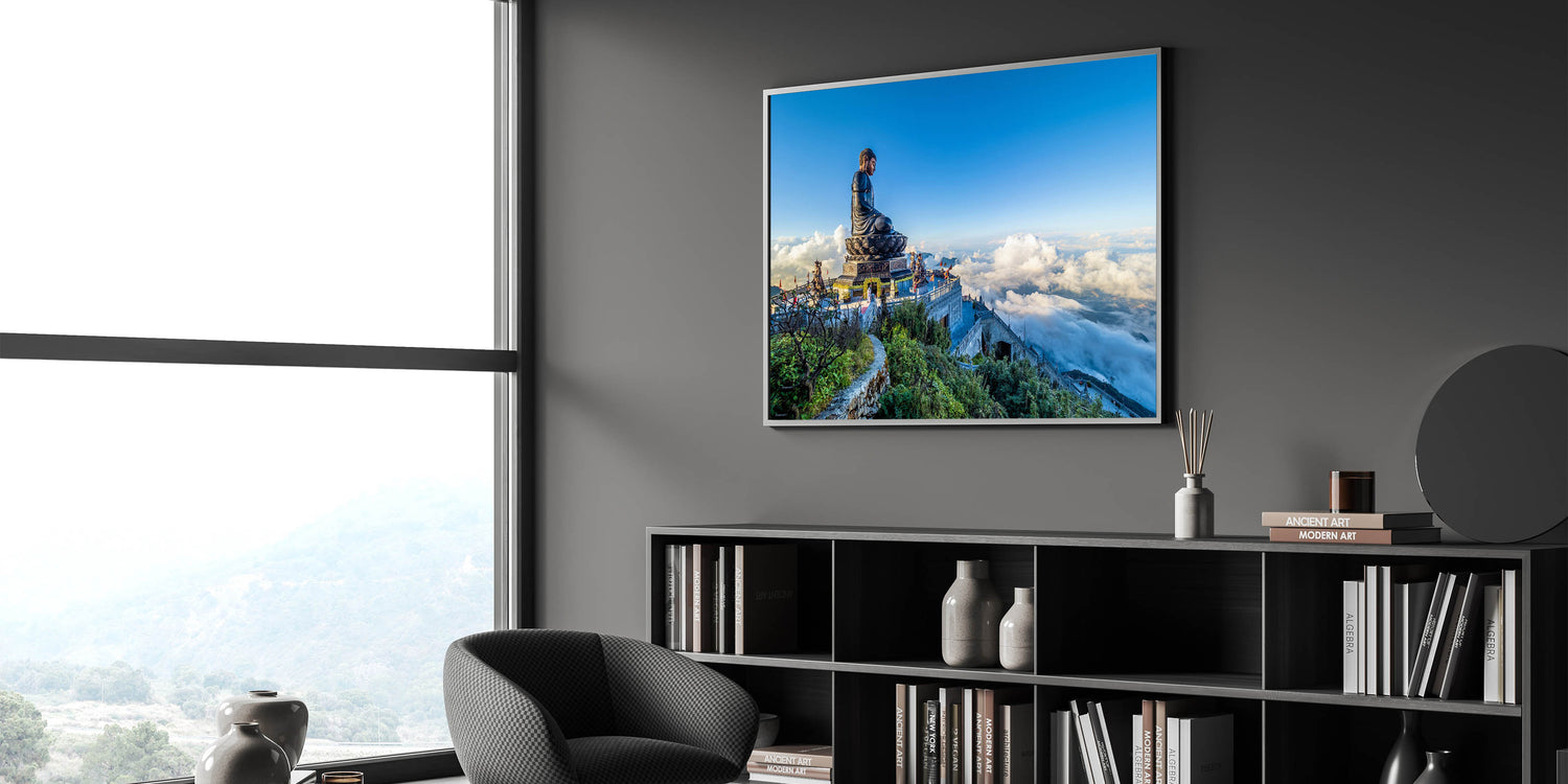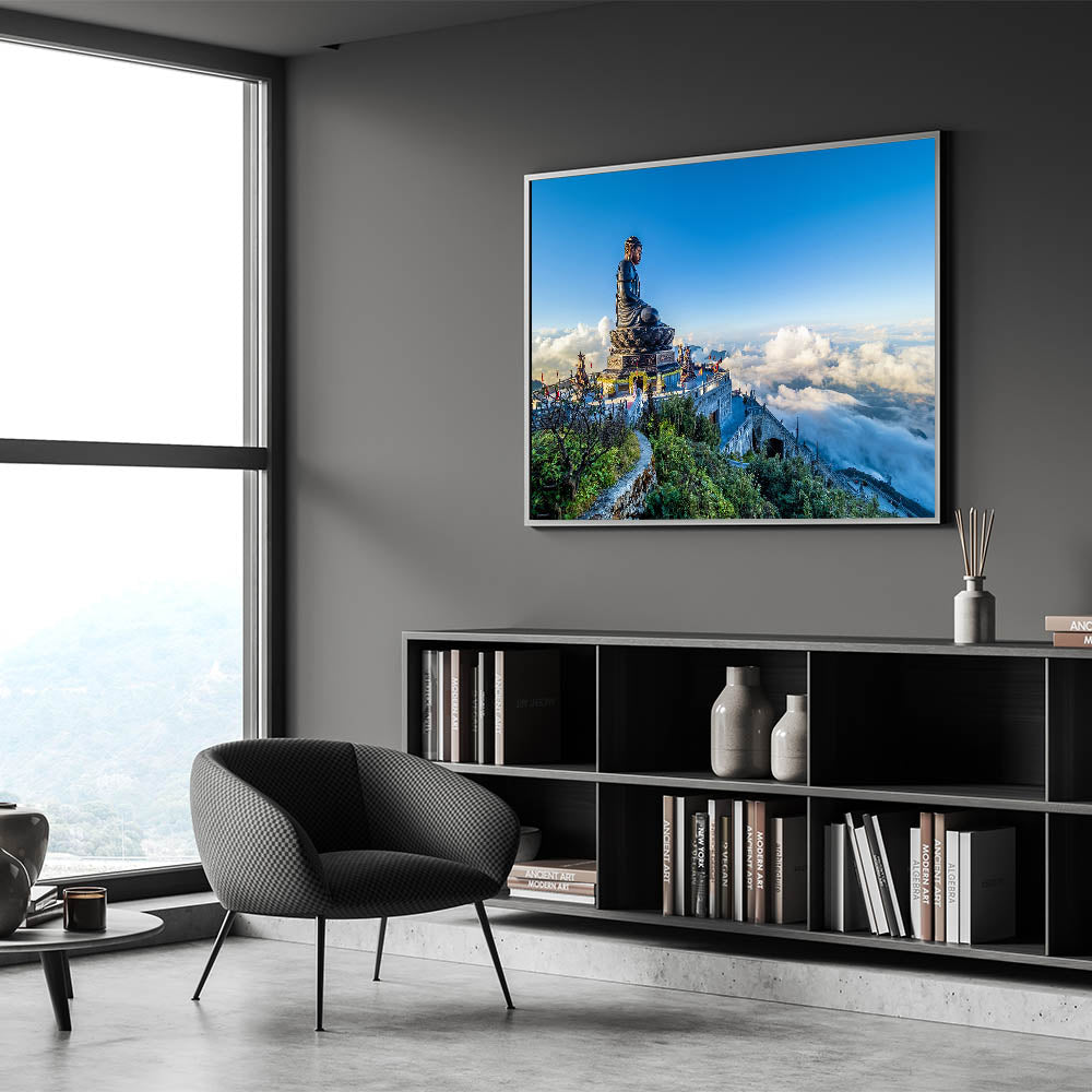 Elevate your space with our "Buddha Above the Clouds" wall art, capturing the serene majesty of a towering Buddha statue perched high above the clouds. This awe-inspiring print presents a peaceful figure gazing out over a breathtaking landscape, symbolizing tranquility and spiritual elevation.