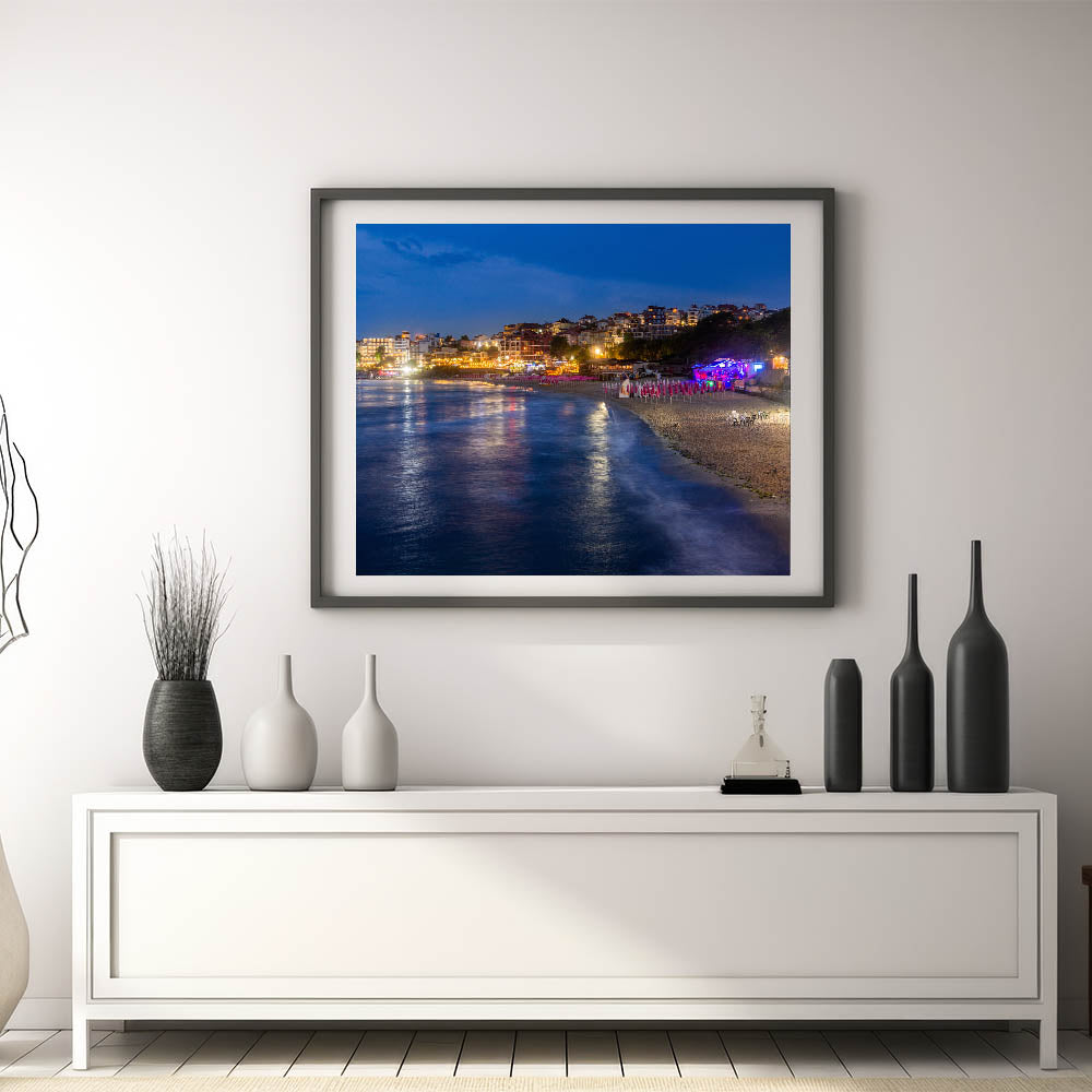 Explore the dynamic nightlife along the Bulgarian Black Sea with our "Bulgaria Travel Posters." This print captures the lively atmosphere of a bustling beachside promenade, illuminated under the starry night sky, making it a stunning addition to any collection.