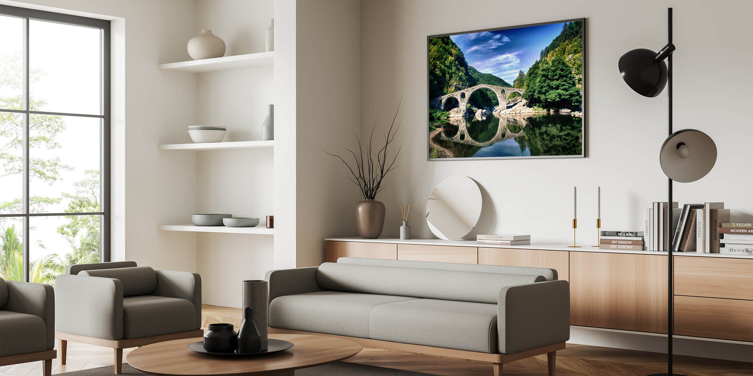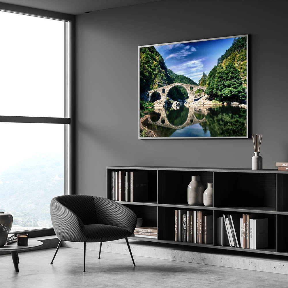 Capture the breathtaking beauty of Bulgaria’s historic landscapes with this stunning Bulgaria wall art piece. Featuring an iconic stone arch bridge set amidst the lush greenery of the Rhodope Mountains, this artwork is the perfect addition to your home or office decor. Ideal for lovers of Bulgarian landscape art, this print transports you to a tranquil riverside scene where history and nature come together.