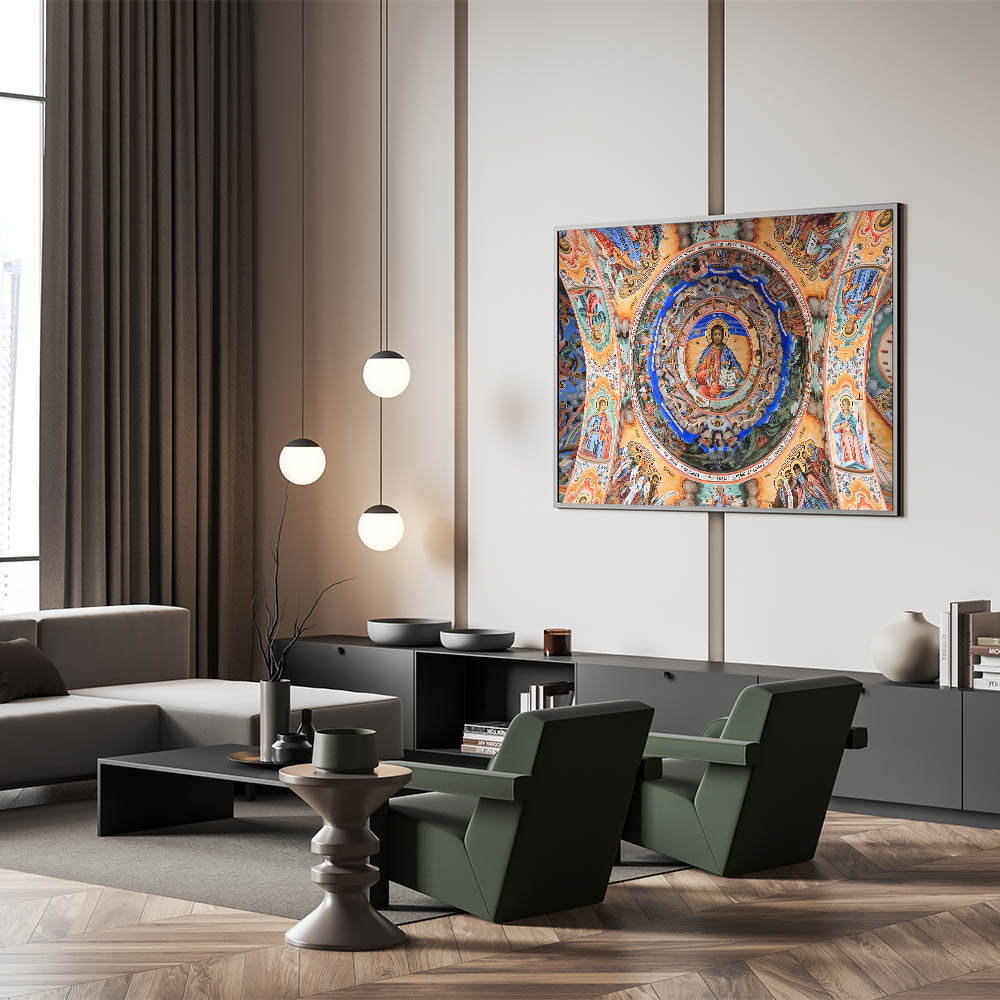 Celebrate the intricate beauty of Bulgaria’s rich cultural and religious heritage with this stunning print of the ceiling fresco from Rila Monastery. Known for its vibrant colors and detailed artistry, this fresco is a masterpiece that reflects the deep spiritual history of Bulgaria. Perfect for adding a touch of sacred beauty and Bulgarian cultural heritage decor to your home or office.