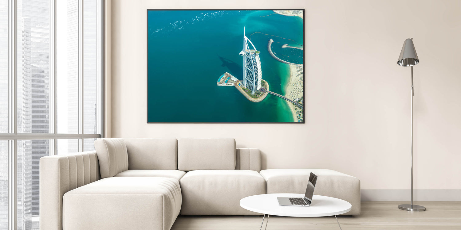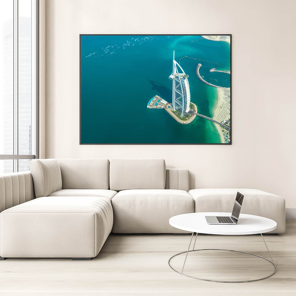 Bring the elegance and architectural brilliance of Dubai's most iconic landmark, the Burj Al Arab, into your space with this stunning wall art. The Burj Al Arab is a symbol of modern luxury and innovation, perfectly captured in this breathtaking aerial view. Ideal for adding a touch of sophistication to any room, this exclusive Dubai luxury art piece is available in multiple formats to suit your needs, including stretched canvas, acrylic glass, and framed prints.