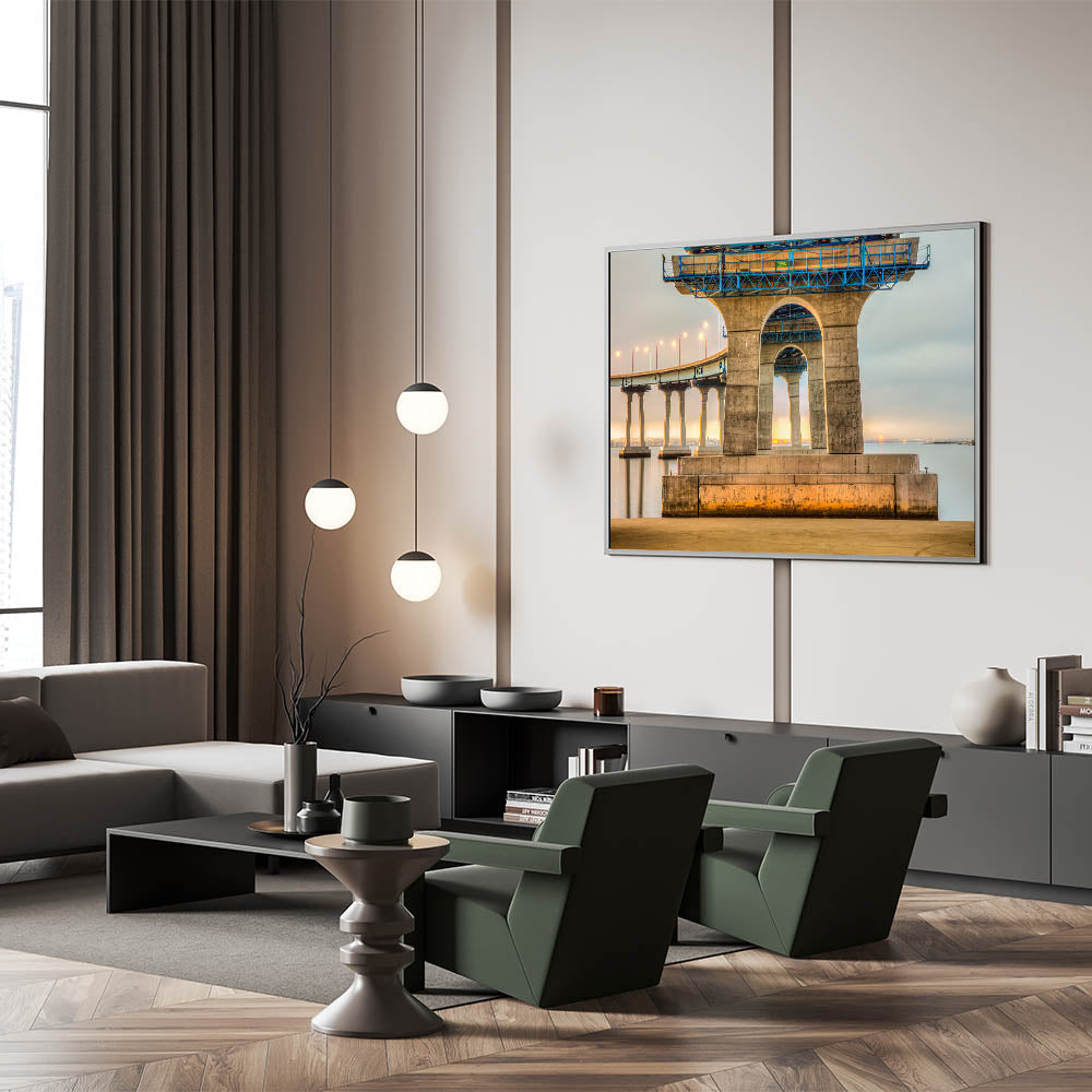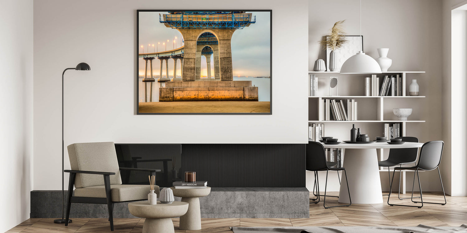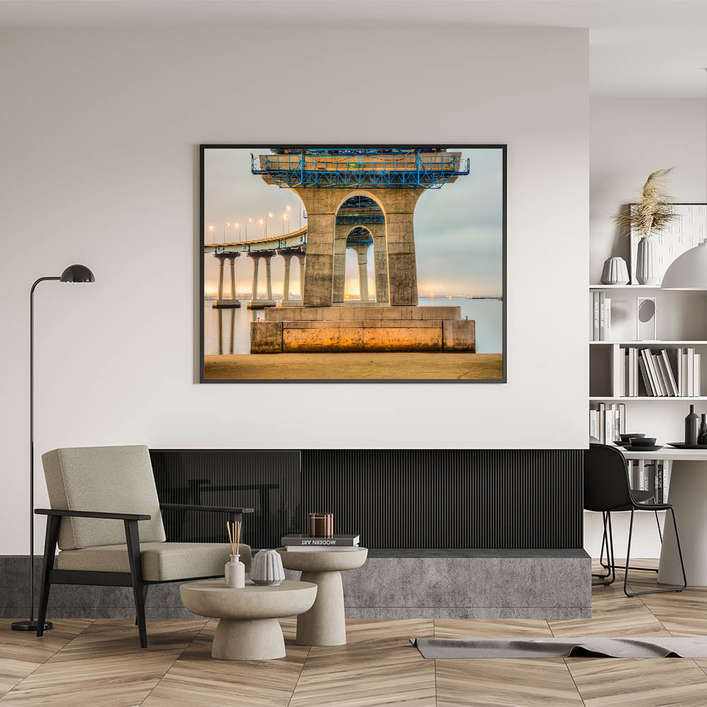- Features a detailed view of the Coronado Bridge’s architectural structure, ideal for modern decor.