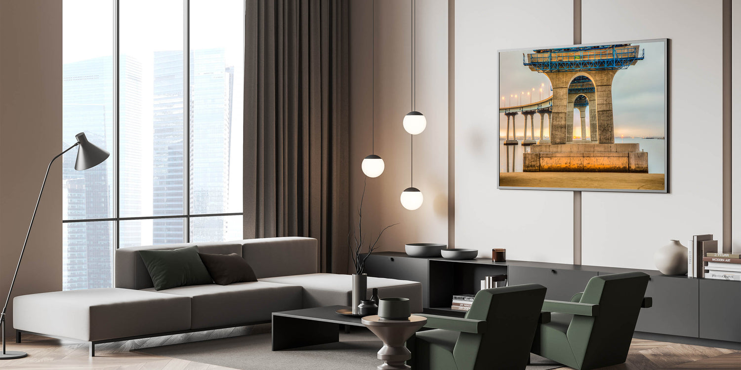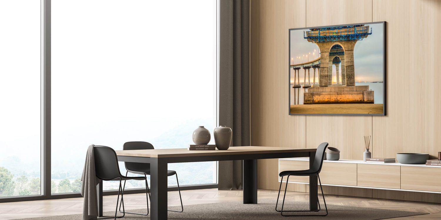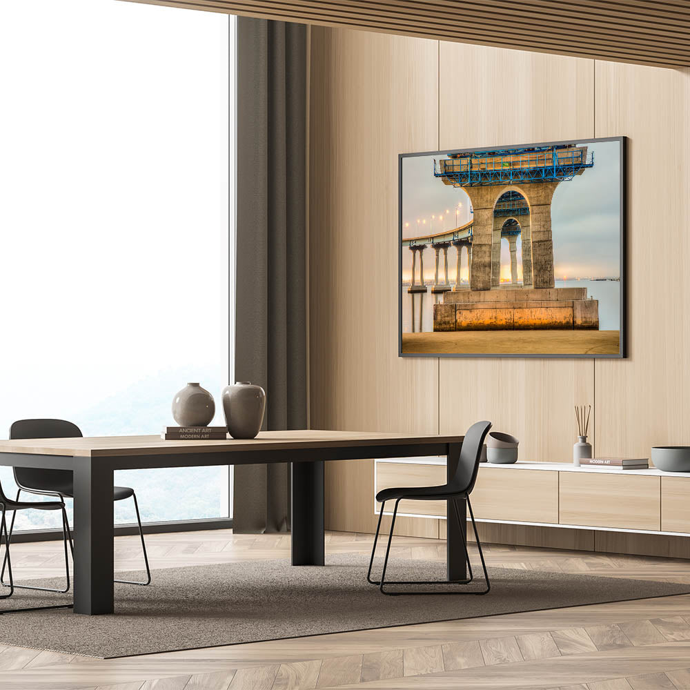 - Features a detailed view of the Coronado Bridge’s architectural structure, ideal for modern decor.