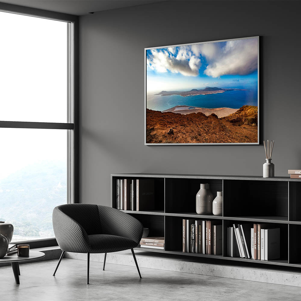 Explore the natural beauty of the Canary Islands with this breathtaking landscape art. Capturing an expansive view of the coastline and mountains, this artwork showcases the islands' rugged terrain and stunning blue waters under a dramatic sky. Perfect for nature lovers and those who appreciate panoramic vistas, this piece brings the wide-open spaces of the Canary Islands into your home, creating a sense of peace and wonder.