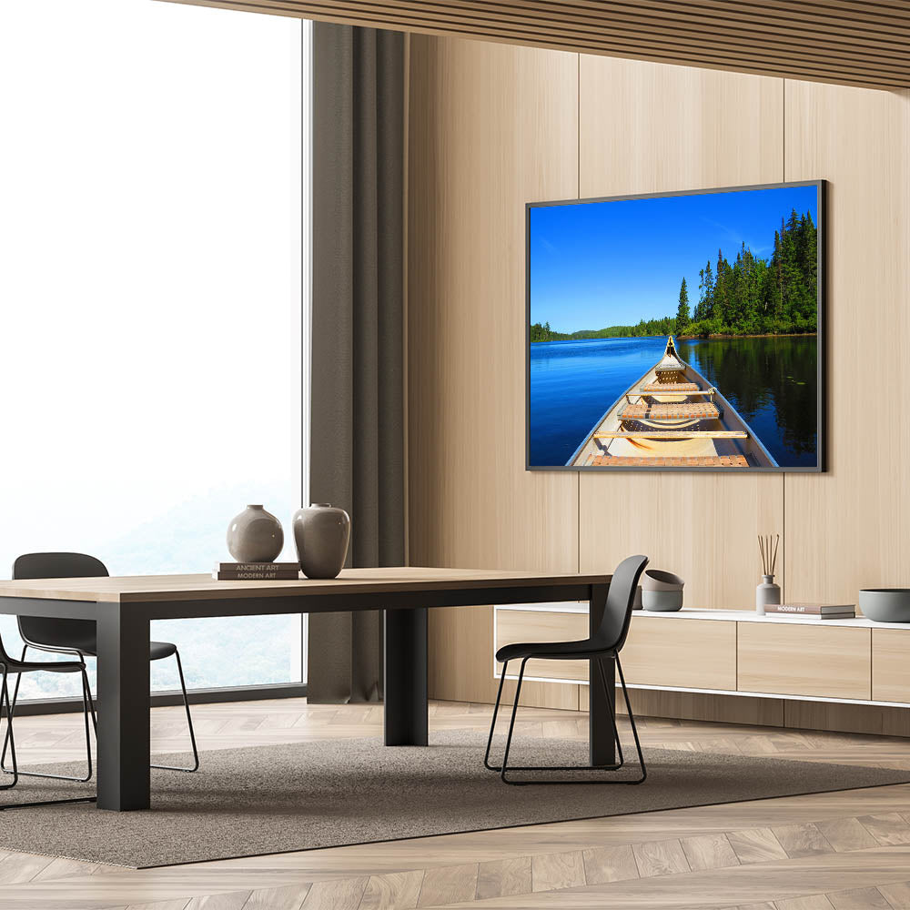Capture the tranquility of Quebec’s pristine wilderness with this stunning wall art featuring a serene canoe ride on a calm lake. This breathtaking artwork transports you to the heart of Quebec’s natural beauty, where the deep blue waters meet lush green forests, creating a peaceful and inviting atmosphere. The perspective from the canoe adds a sense of adventure, making this piece perfect for those who love the outdoors.
