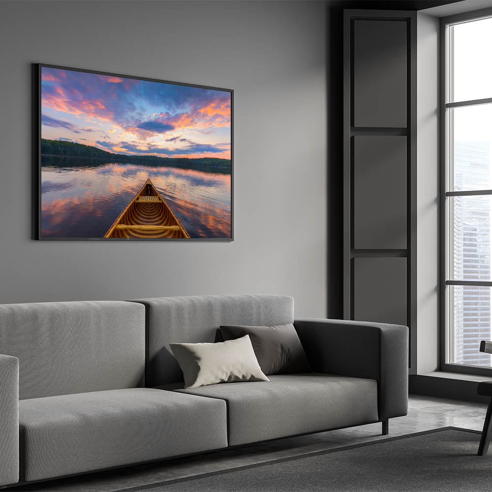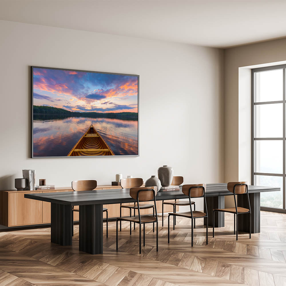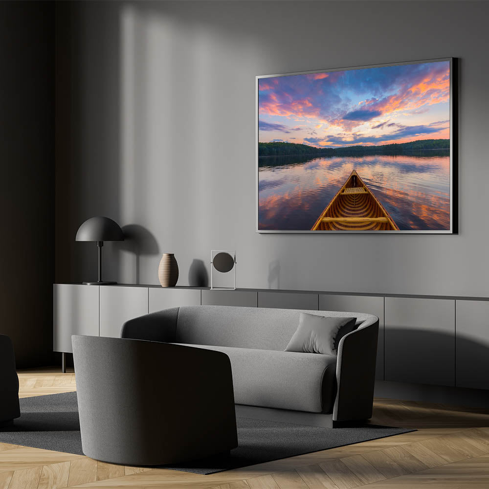 Experience the peaceful beauty of an Ontario sunset with this stunning Canoe at Sunset wall art. Featuring a calm lake framed by lush forests, this Ontario Landscape Print perfectly captures the tranquility of nature. The view from the canoe gently floating on the still water evokes a sense of serenity and calm, while the vibrant sunset paints the sky with soft hues of orange, pink, and purple.