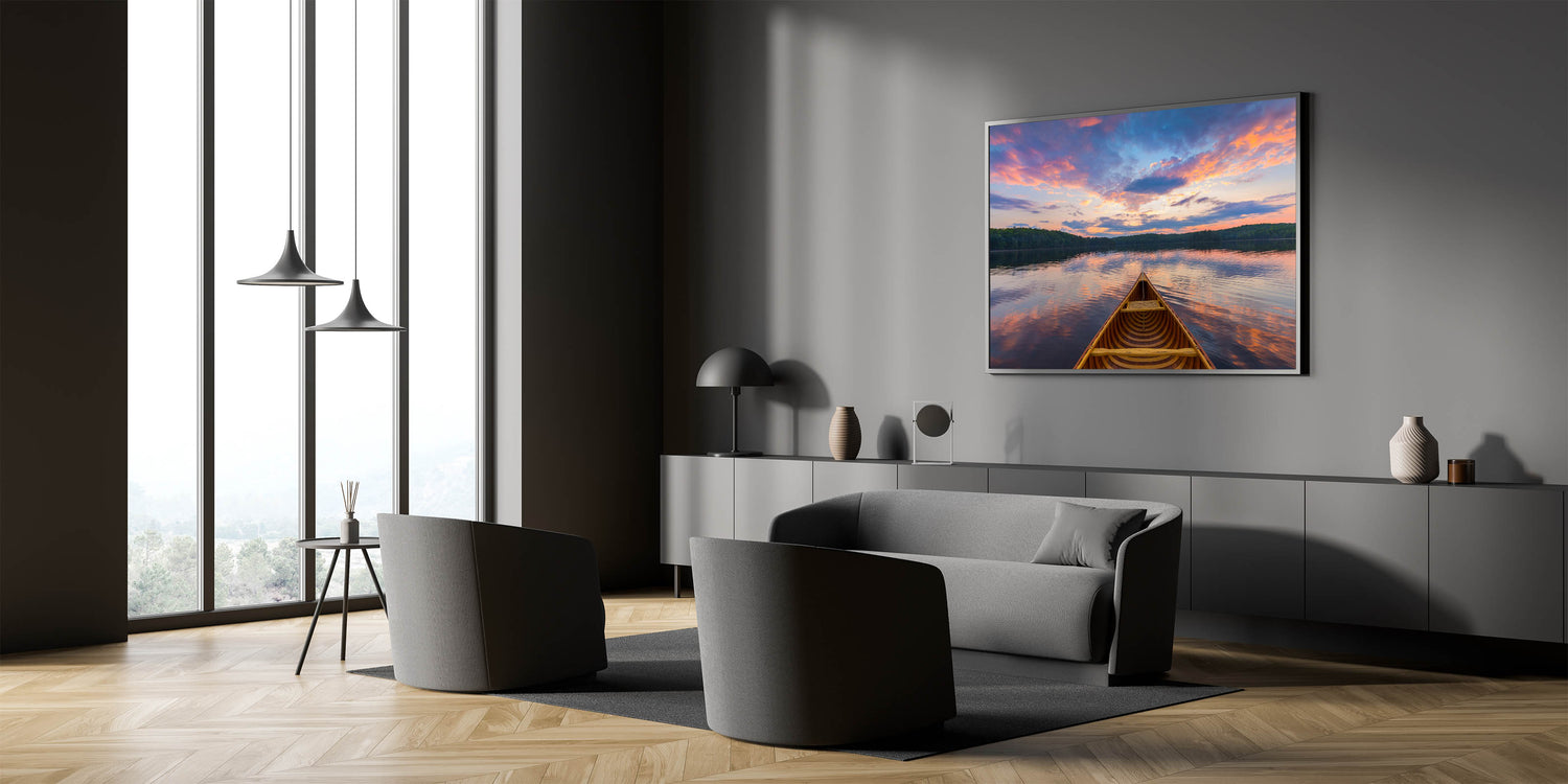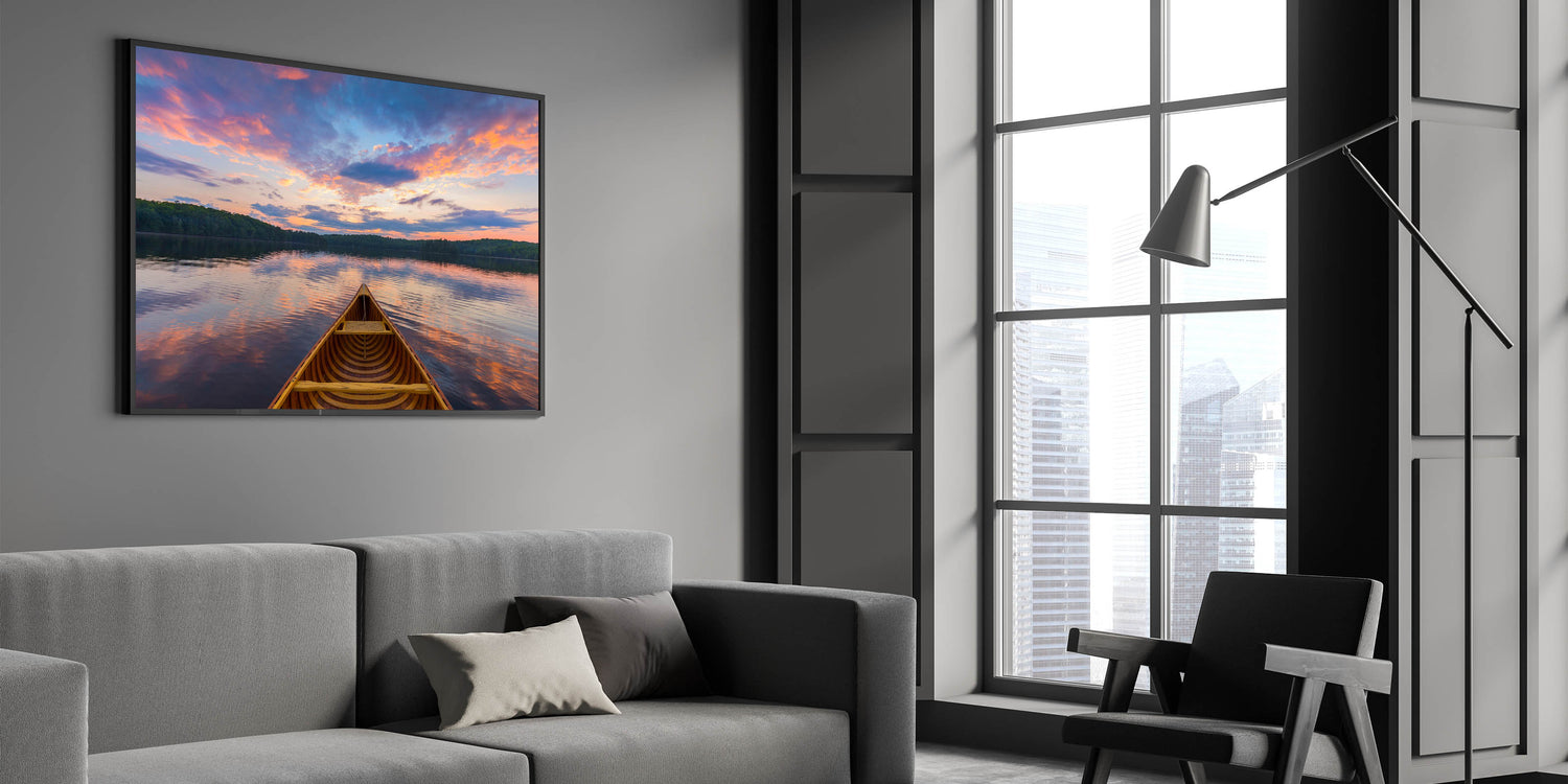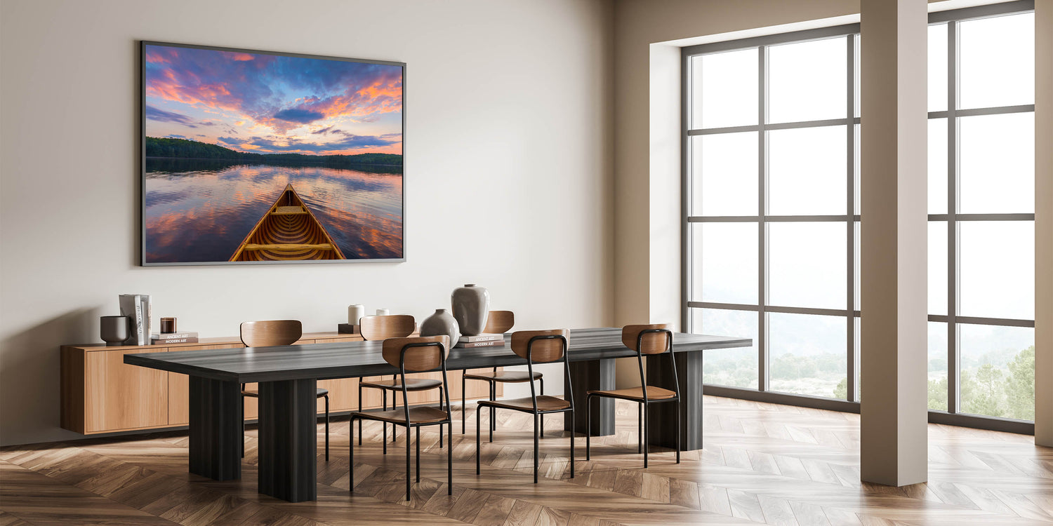 Experience the peaceful beauty of an Ontario sunset with this stunning Canoe at Sunset wall art. Featuring a calm lake framed by lush forests, this Ontario Landscape Print perfectly captures the tranquility of nature. The view from the canoe gently floating on the still water evokes a sense of serenity and calm, while the vibrant sunset paints the sky with soft hues of orange, pink, and purple.