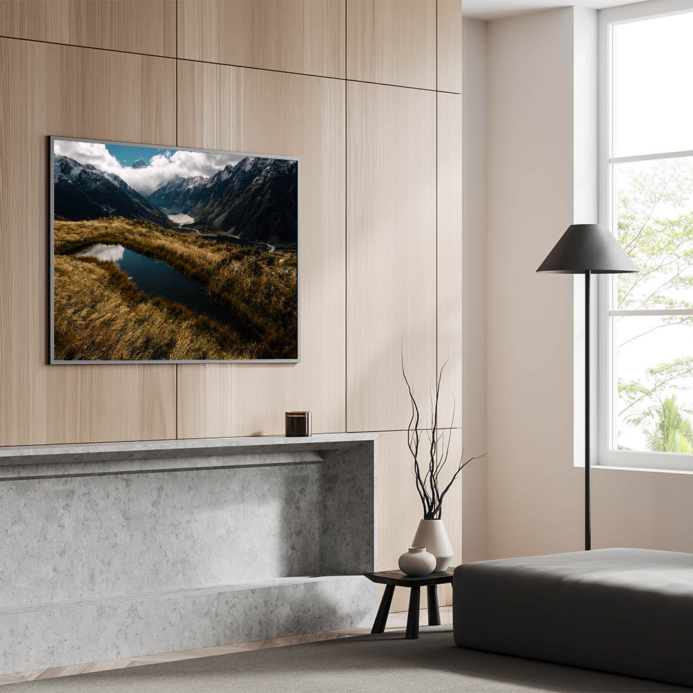 Experience the raw beauty of New Zealand’s Canterbury region with this captivating Canterbury Mountain Wilderness Art. This New Zealand Scenery Print captures the rugged landscape of towering mountains and serene reflective waters, surrounded by golden grasses. The dramatic lighting and natural beauty make this piece perfect for anyone who appreciates New Zealand Nature Wall Decor and the power of untouched wilderness.