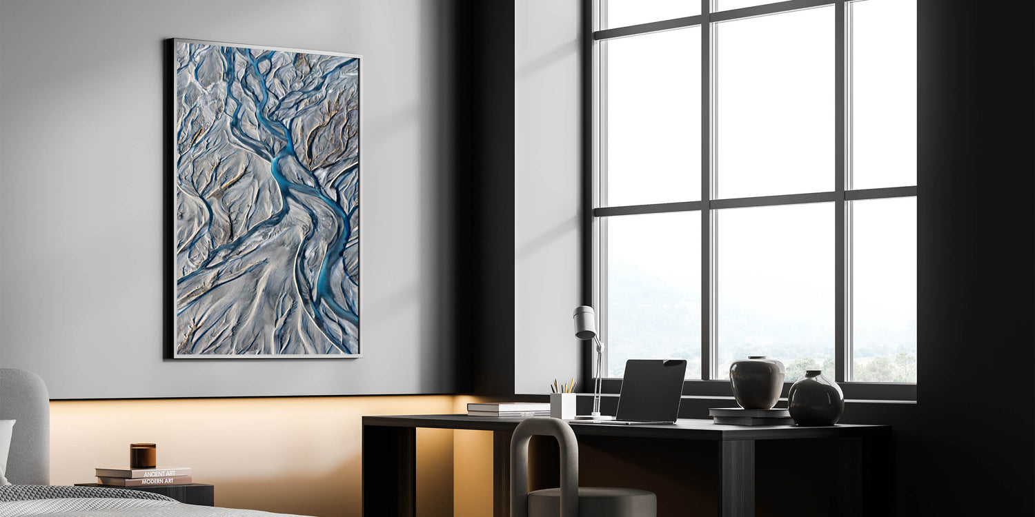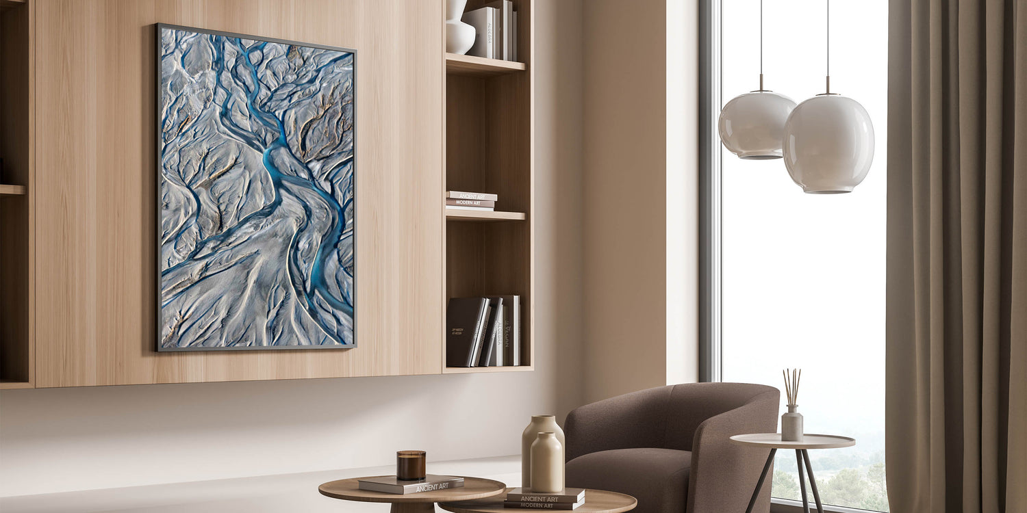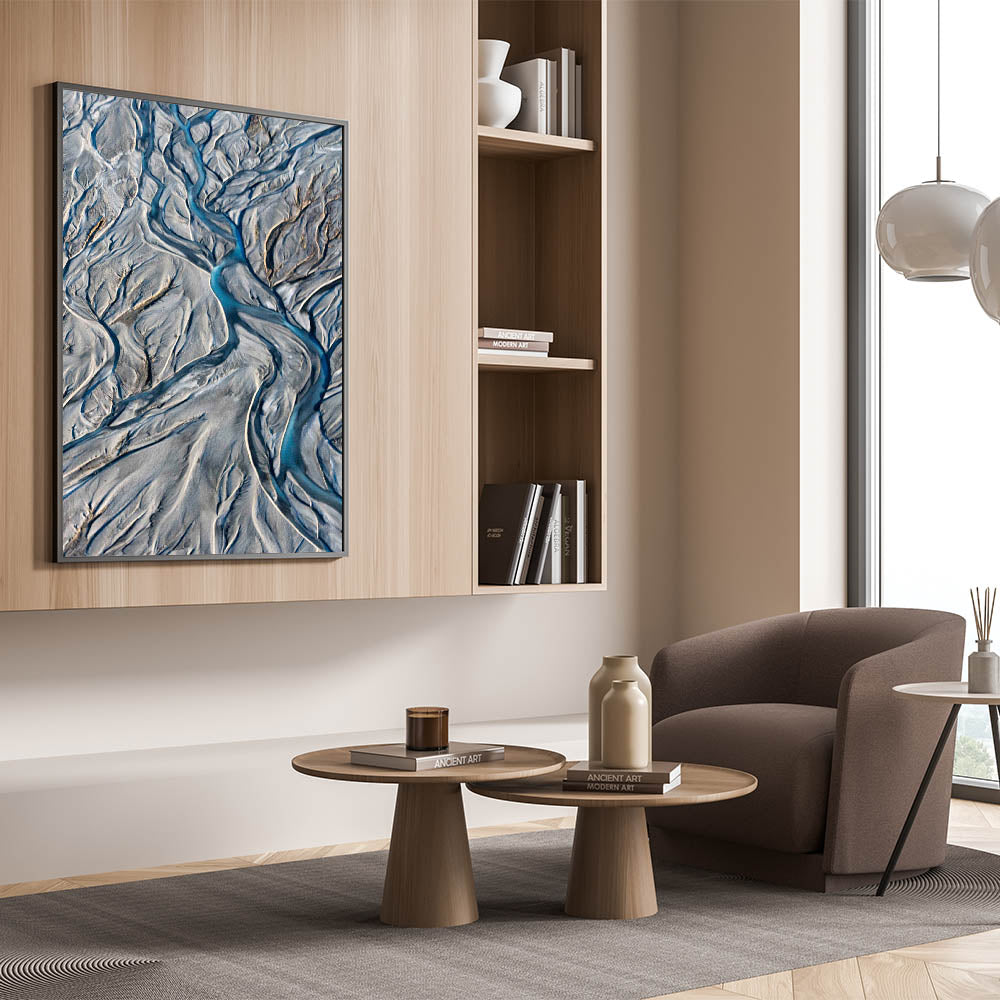 This striking Canterbury Wall Art offers a unique perspective on New Zealand’s natural beauty, capturing the intricate patterns of braided rivers from an aerial view. The soft blues and grays create a flowing abstract design, making it a stunning centerpiece for any modern space. Our New Zealand Scenery Prints are meticulously crafted to highlight the beauty of nature’s forms and textures, bringing a contemporary touch to your home or office.