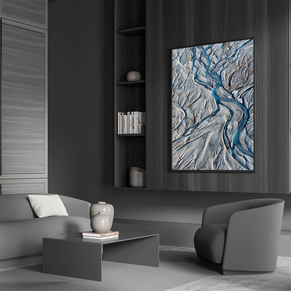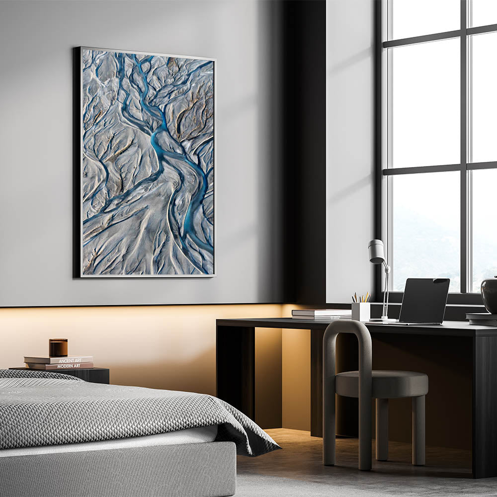 - Premium Canterbury Wall Art featuring an abstract aerial view of braided rivers in New Zealand
