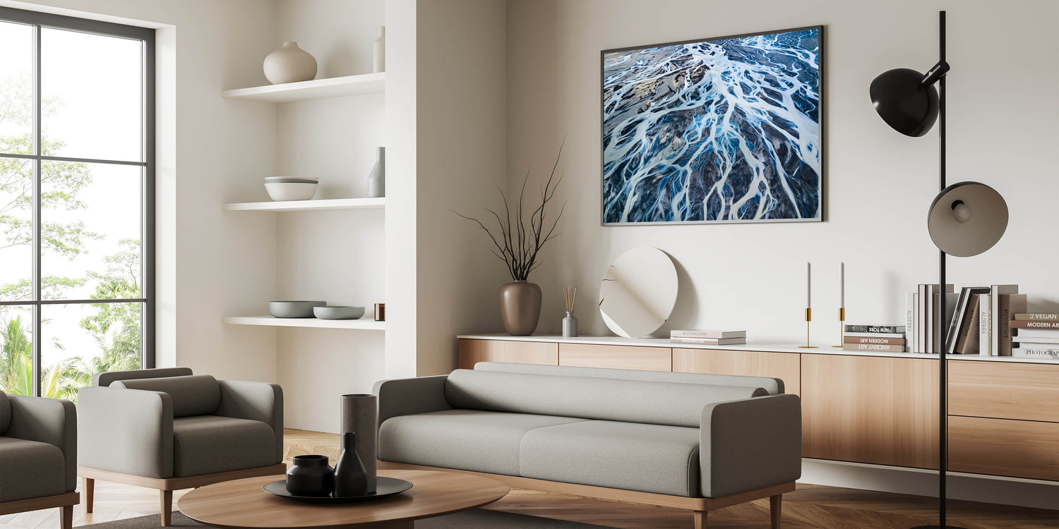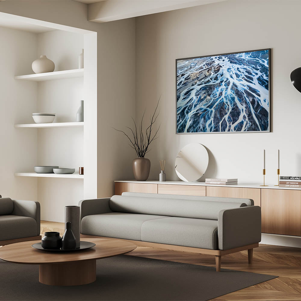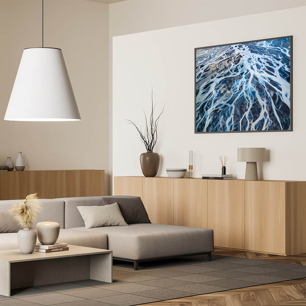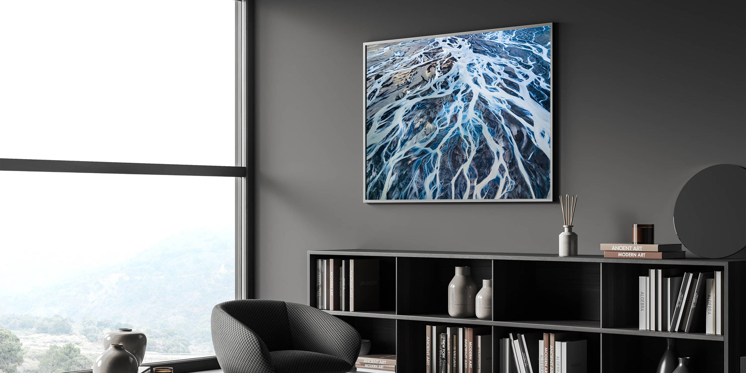 This mesmerizing Canterbury Wall Art captures the intricate and awe-inspiring patterns of New Zealand's braided rivers from a stunning aerial perspective. The flowing water channels create an abstract network of white and blue hues, making it an ideal piece for those who appreciate nature’s artistic beauty. Our New Zealand Scenery Prints are expertly crafted to showcase the organic and breathtaking formations of the Canterbury landscape, perfect for adding a modern, nature-inspired touch to any space.