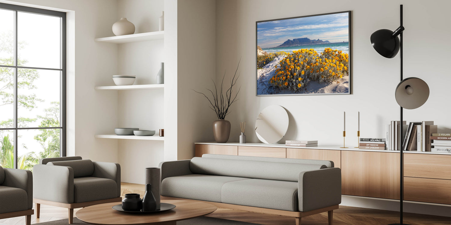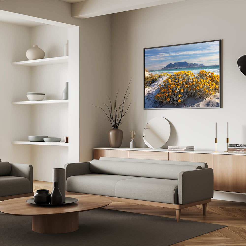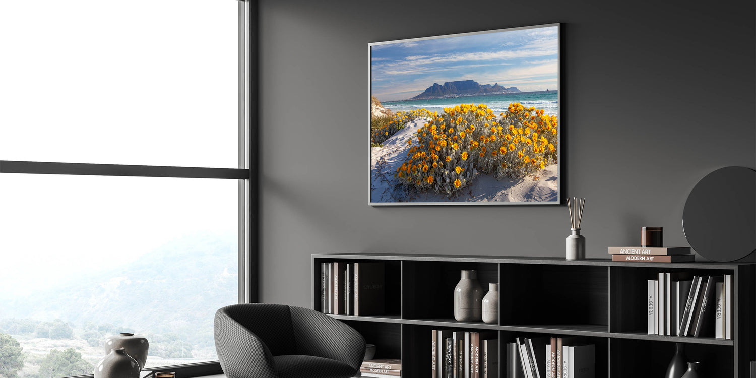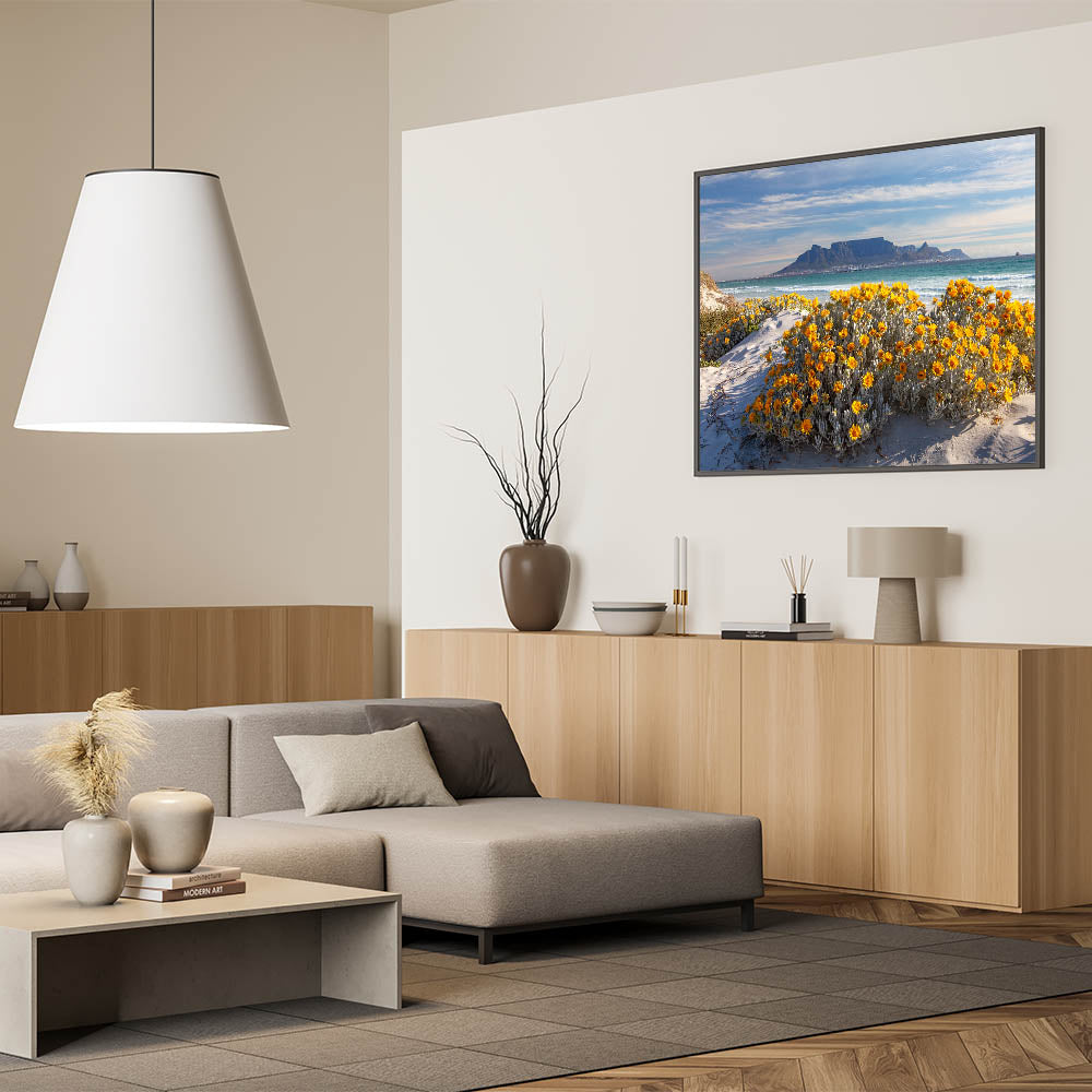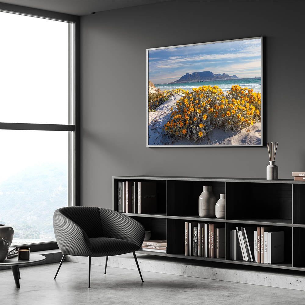 Capture the stunning beauty of Cape Town’s iconic landscape with this vibrant canvas art featuring a colorful beach scene framed by the majestic Table Mountain. Bright yellow flowers bloom against the sandy shores, with the crystal blue waters of the ocean creating a serene and captivating backdrop. This artwork perfectly embodies the charm and tranquility of Cape Town’s natural surroundings, making it an ideal addition to your home or office decor.