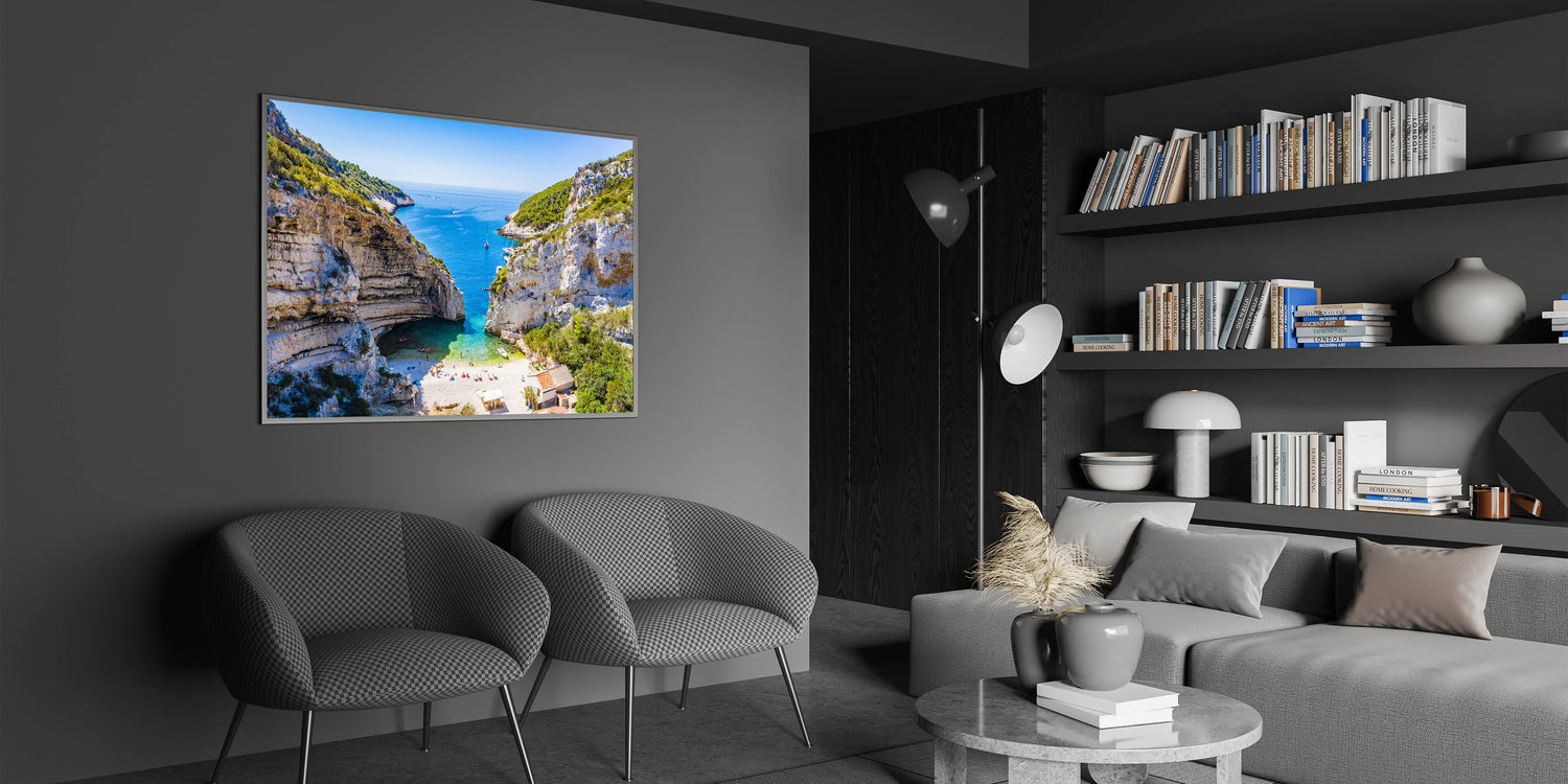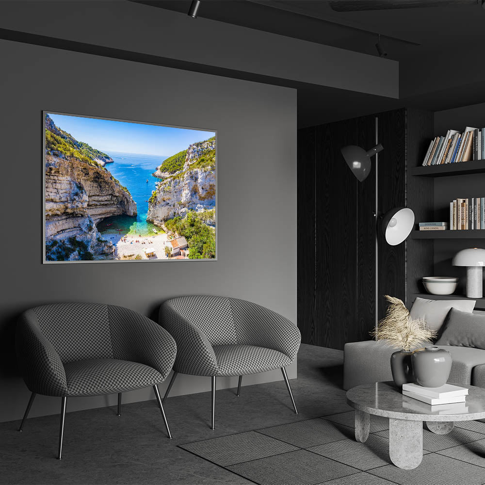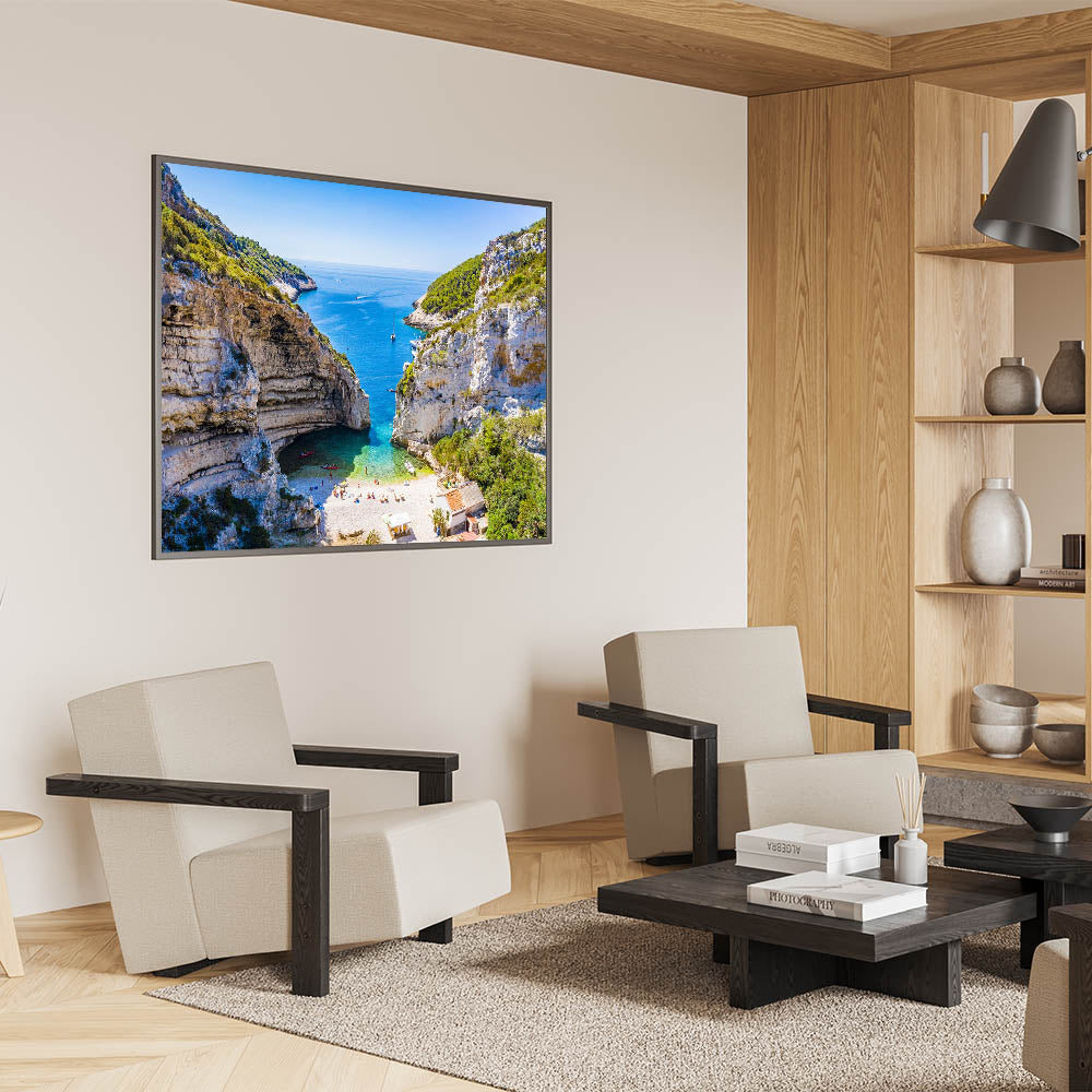 Bring the serene beauty of the Capri coastline into your home with this stunning piece of Capri coastal art. This artwork captures the natural wonder of a hidden beach cove, nestled between towering cliffs and the azure waters of the Mediterranean Sea. Perfect for anyone who loves Italian landscape art and wants to add a touch of Mediterranean decor to their living space.