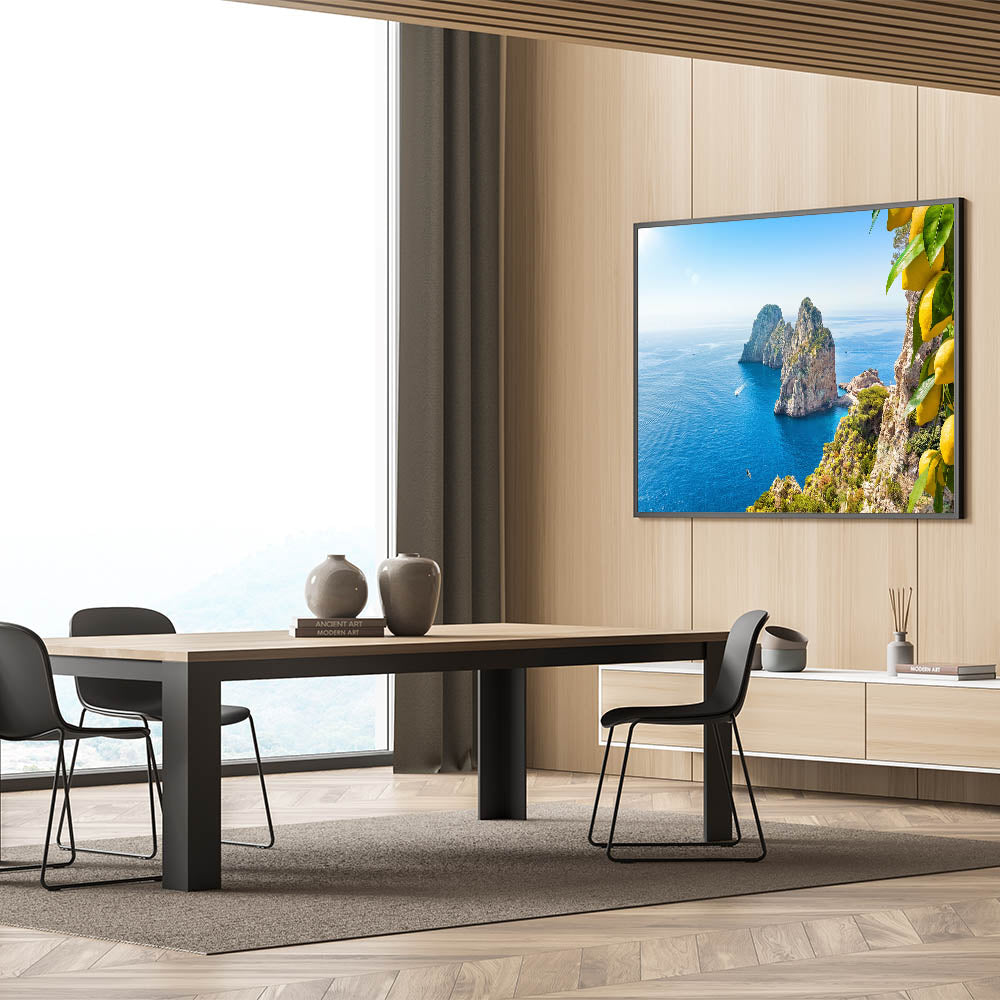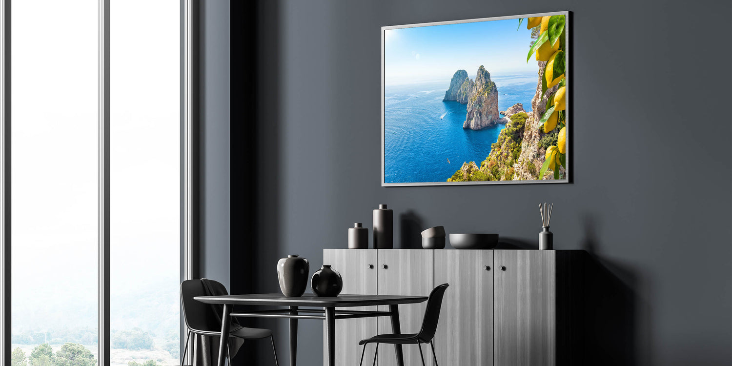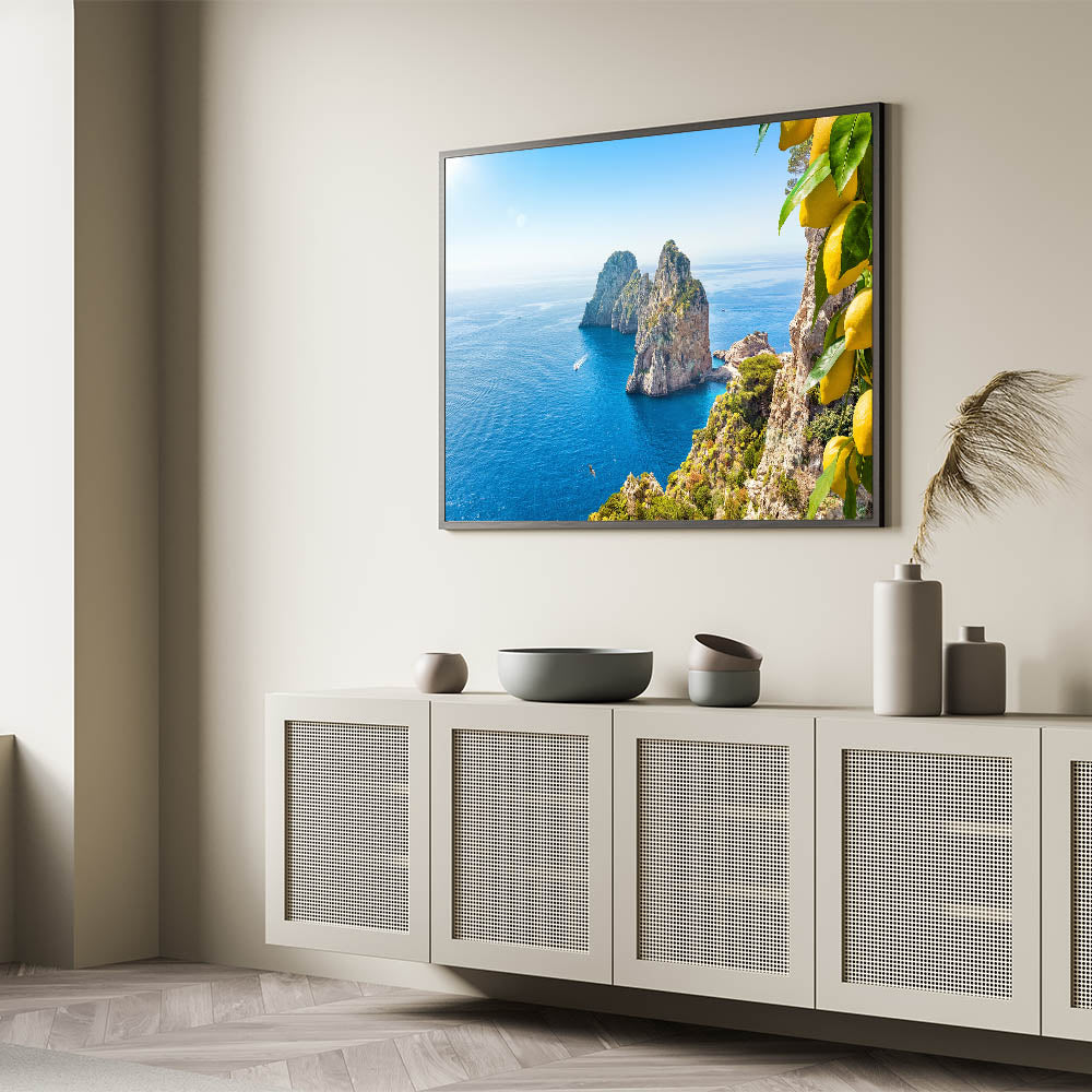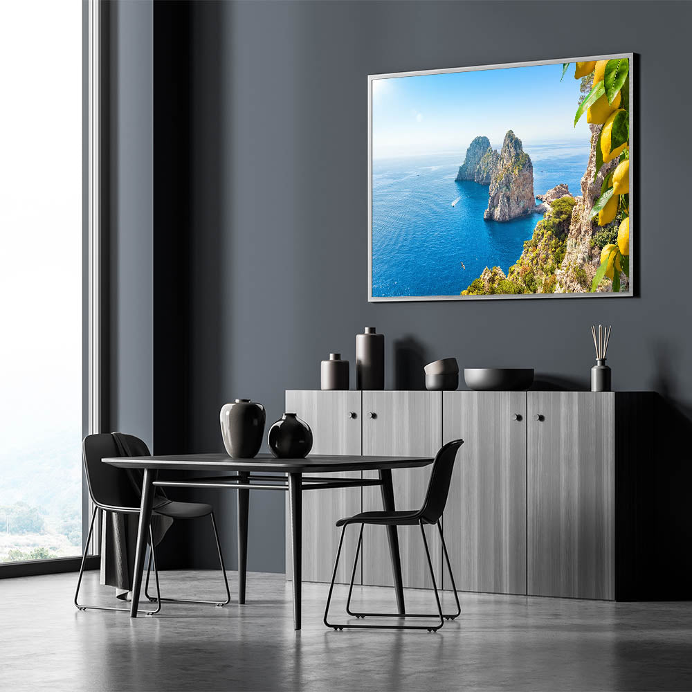 Bring the refreshing beauty of Capri into your home with this Capri Wall Art. Featuring the iconic Faraglioni rocks surrounded by the sparkling blue Mediterranean waters, this artwork is a perfect example of Italian Landscape Art. With bright lemon trees framing the scene, the piece captures the essence of the Mediterranean lifestyle, making it a vibrant addition to any room.