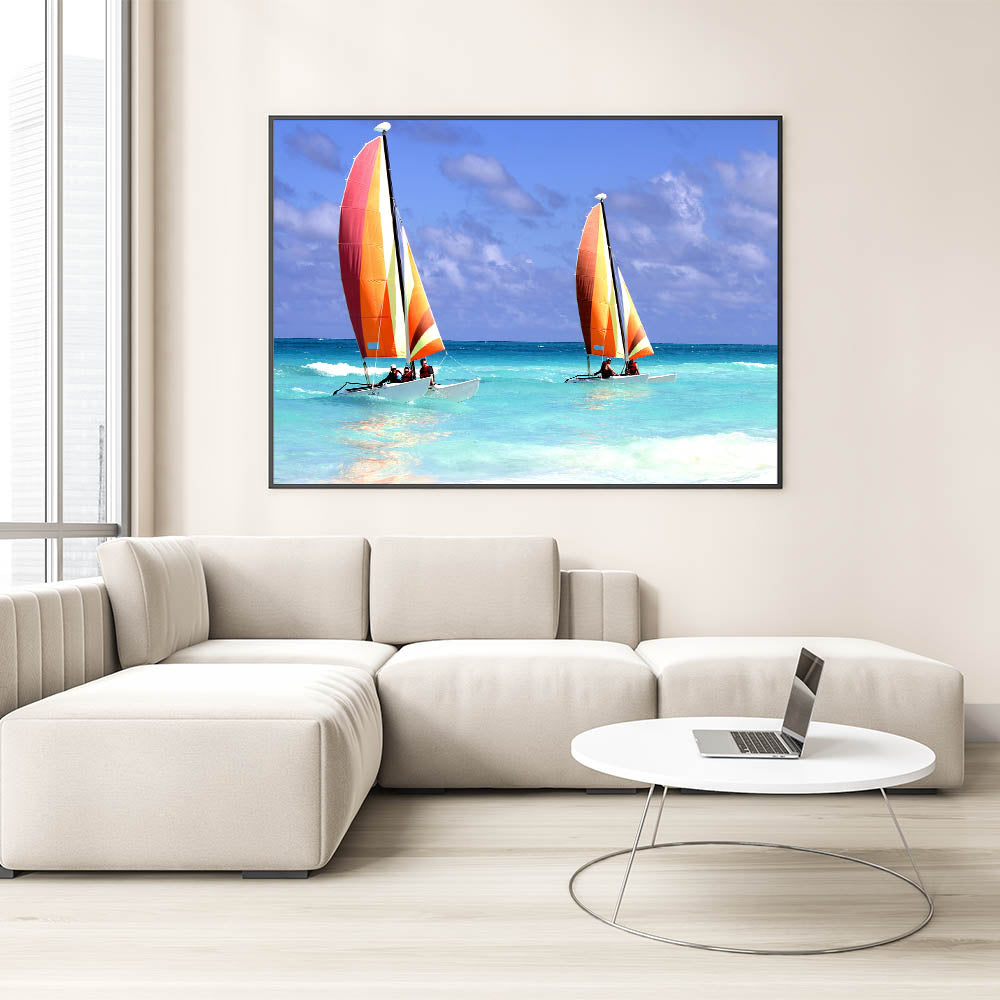 Add a splash of color and movement to your decor with this vibrant Barbados wall art, featuring two colorful sailboats skimming across the crystal-clear turquoise waters of the Caribbean. The bright orange and yellow sails contrast beautifully against the serene blue sky and water, creating a dynamic and energizing scene that instantly uplifts any room. Perfect for coastal, tropical, or nautical-themed spaces, this artwork is a true representation of the joy and adventure of island life.