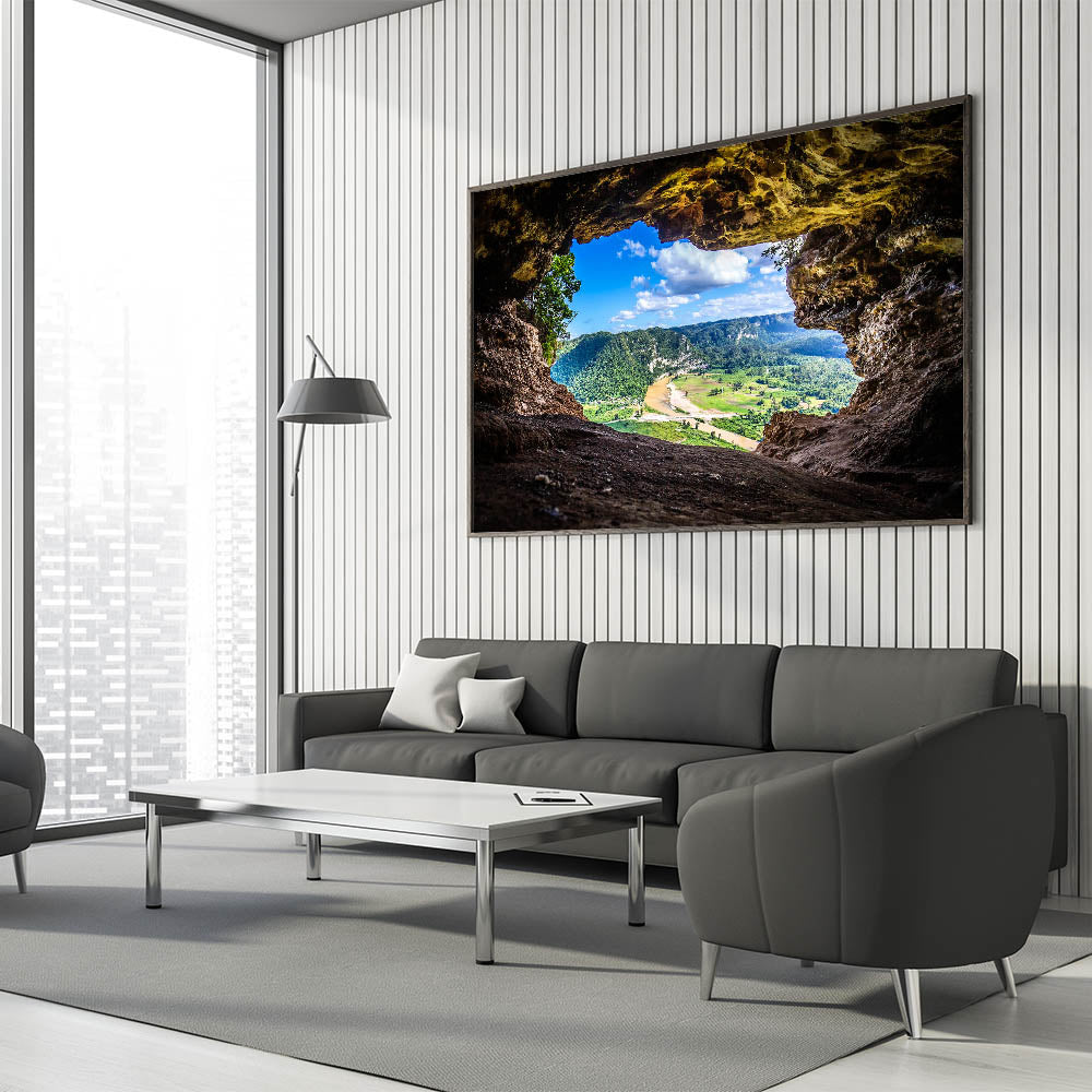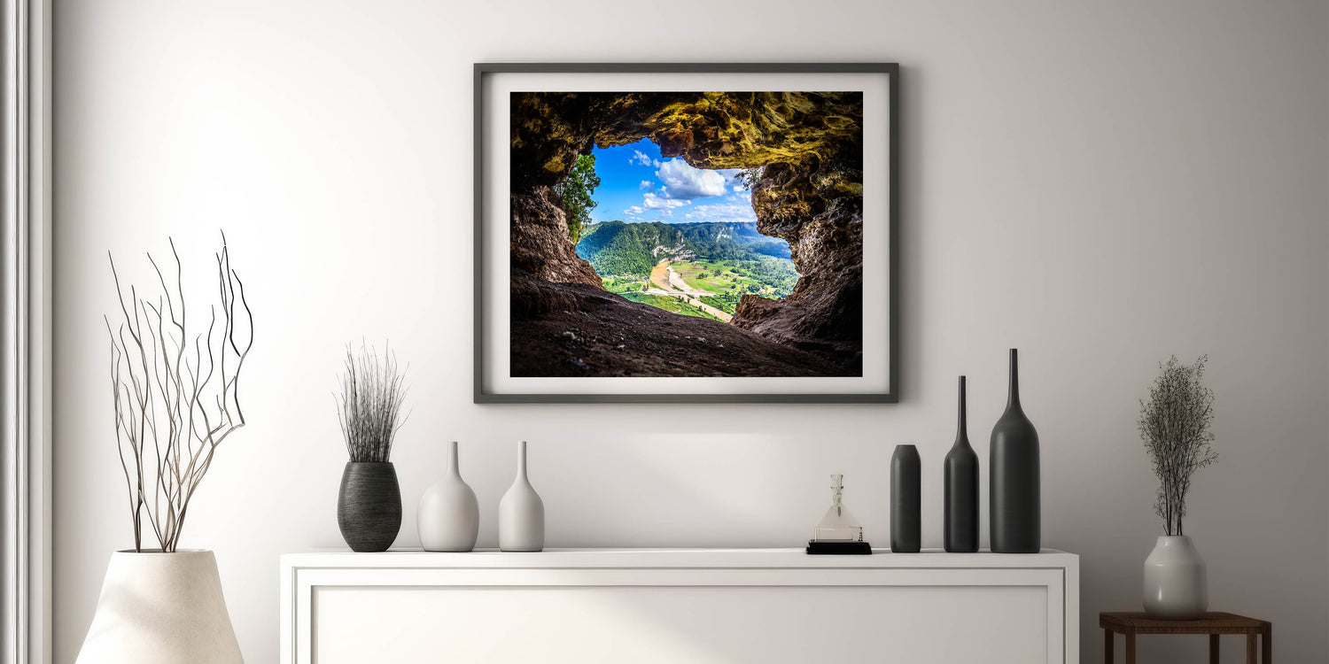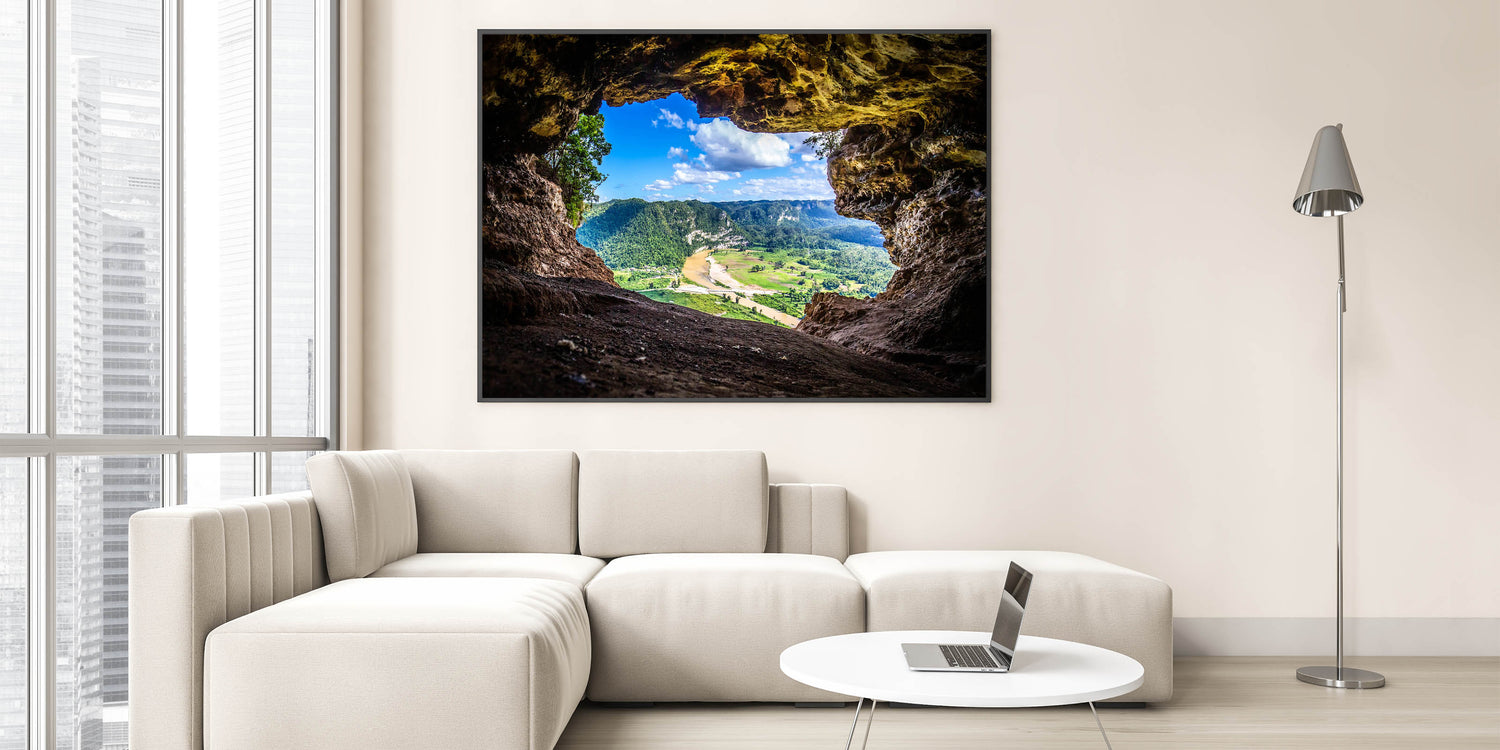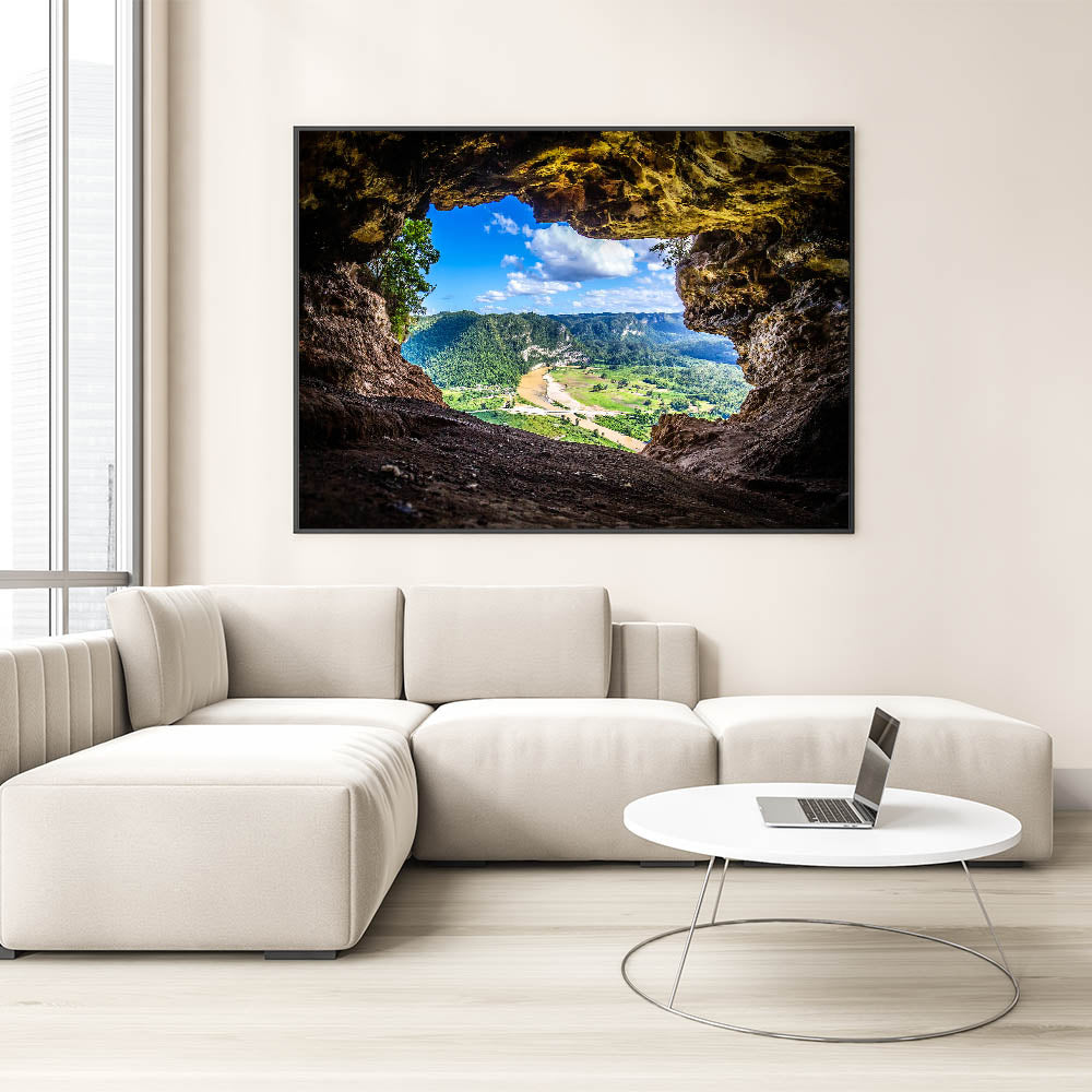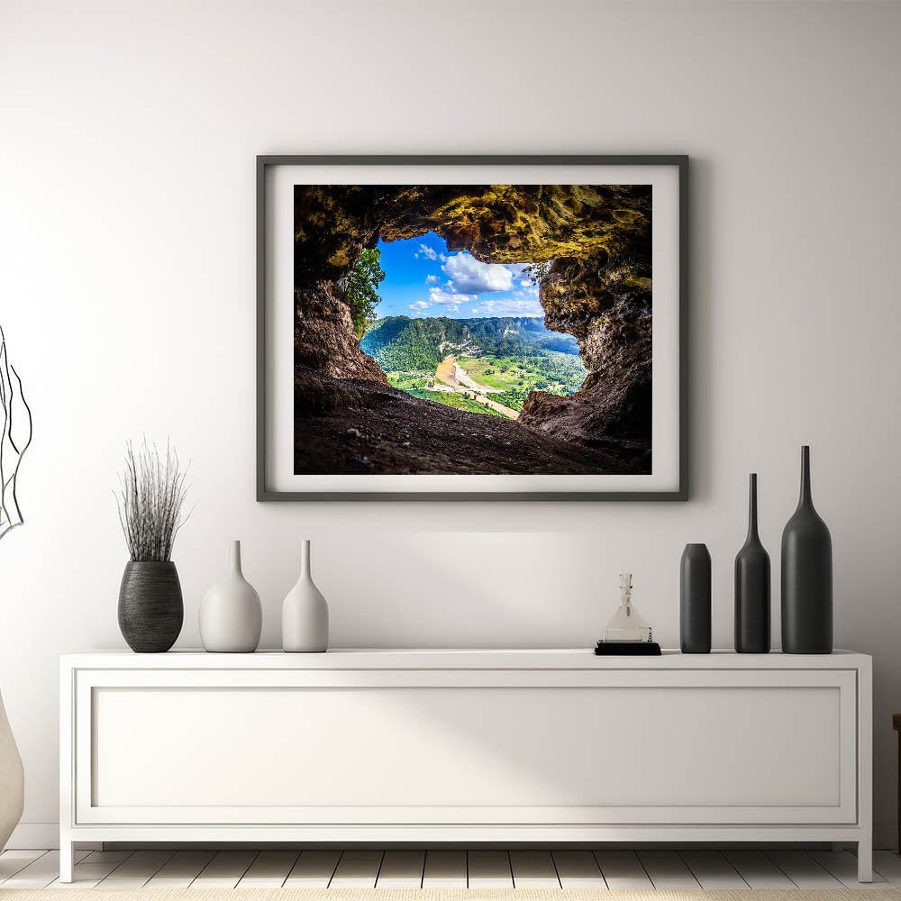Experience the breathtaking view from Cueva Ventana with this vibrant Puerto Rico Photography. This striking piece captures the stunning natural landscape framed by the cave's rugged opening, revealing lush greenery, flowing rivers, and bright blue skies. This Caribbean Canvas Print is perfect for adding a touch of adventure and serenity to any room, showcasing the unspoiled beauty of Puerto Rican Scenery.