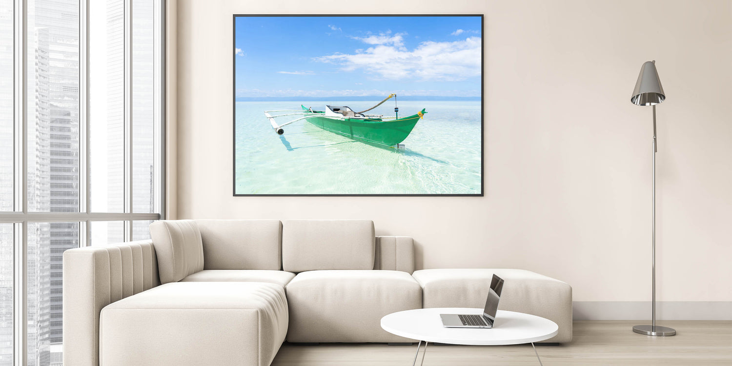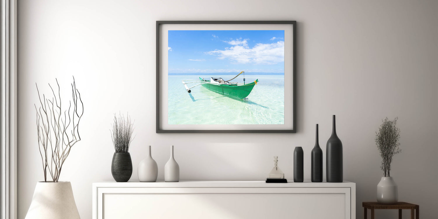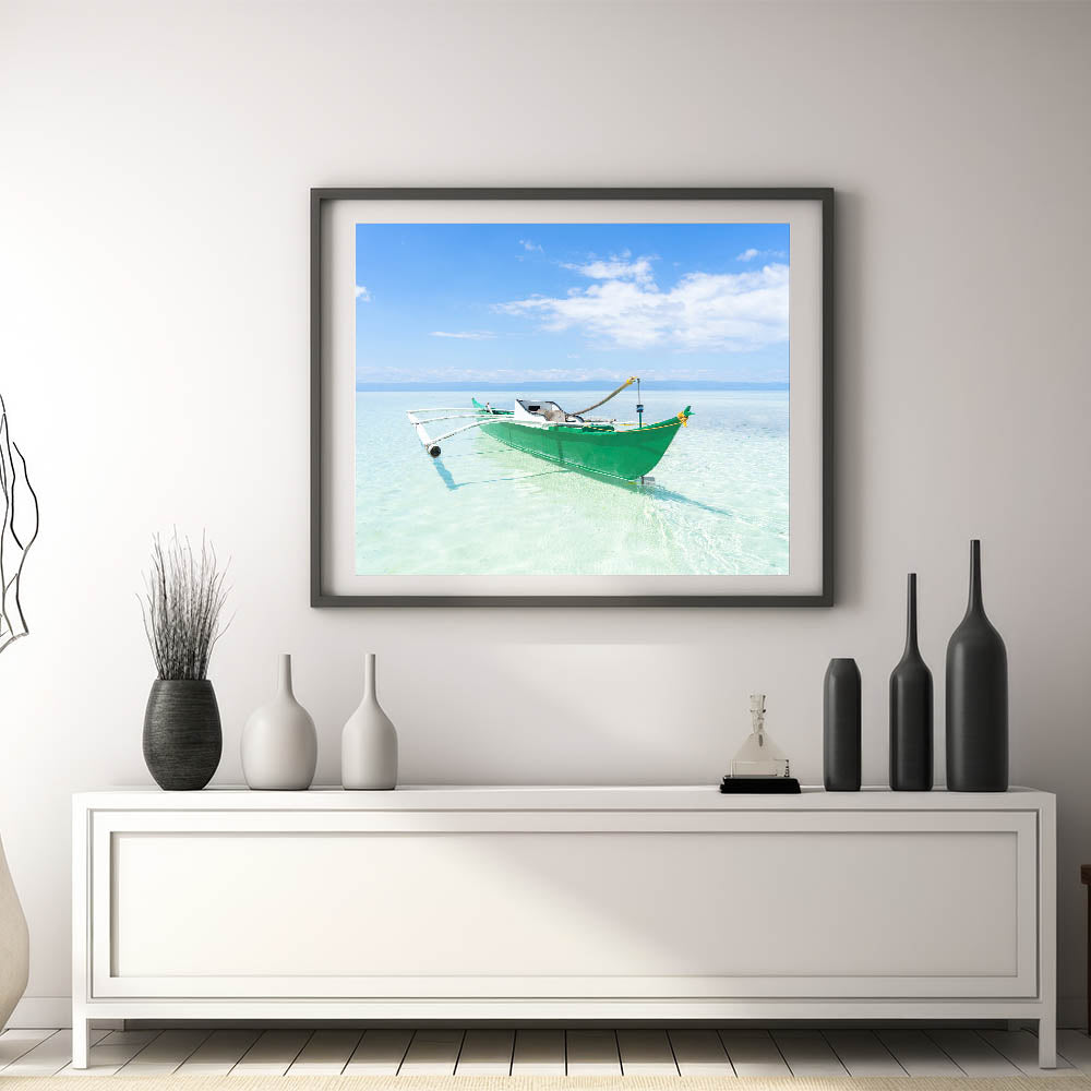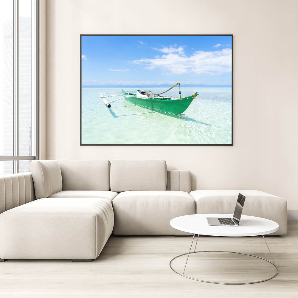 Experience the serene beauty of the Caribbean with our "Tranquil Sea Prints." This captivating wall art showcases a solitary green boat floating on the crystal-clear waters under a wide-open blue sky. It's a perfect representation of peaceful solitude and the stunning clarity of Caribbean waters.