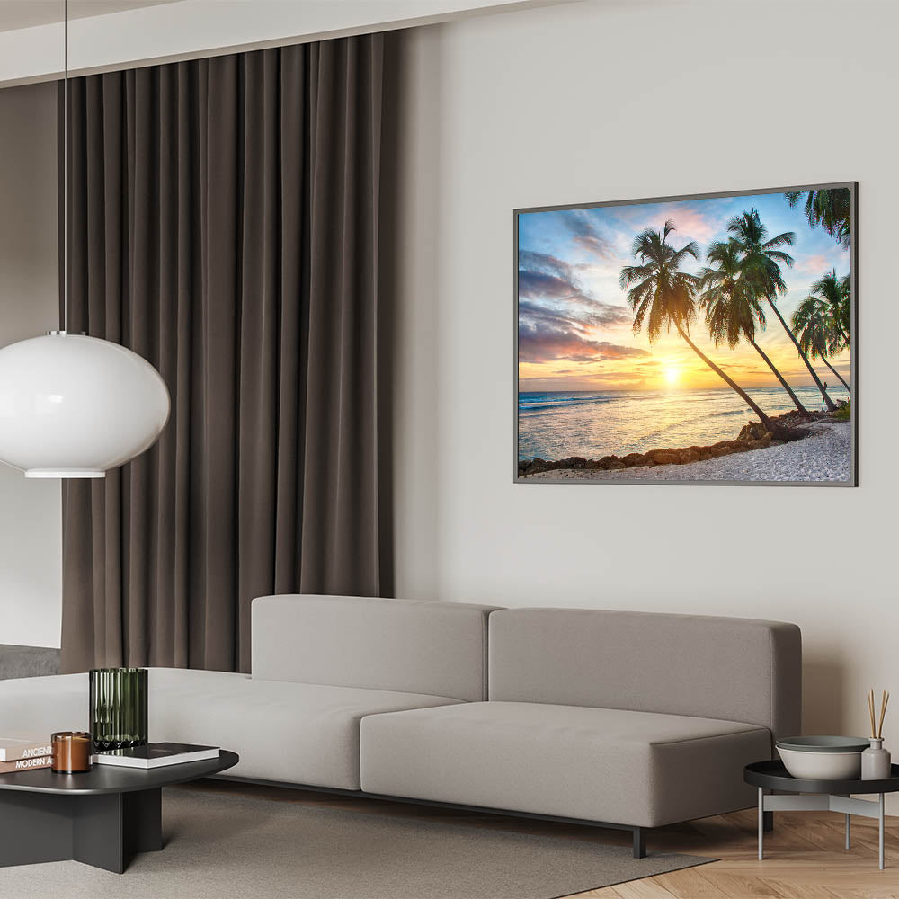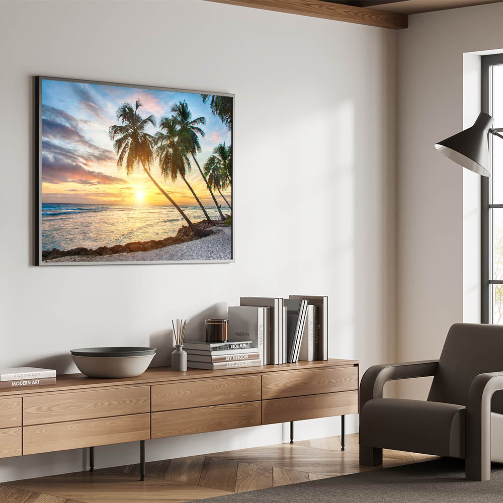 Bring the calming essence of the Caribbean into your home with this stunning Barbados wall art, featuring a captivating sunset over a tranquil beach. The palm trees leaning gently towards the serene waters and the colorful sky create a peaceful yet vibrant scene that embodies the beauty of tropical island life. Perfect for creating a coastal atmosphere in any room, this artwork adds warmth and natural charm to your home decor.