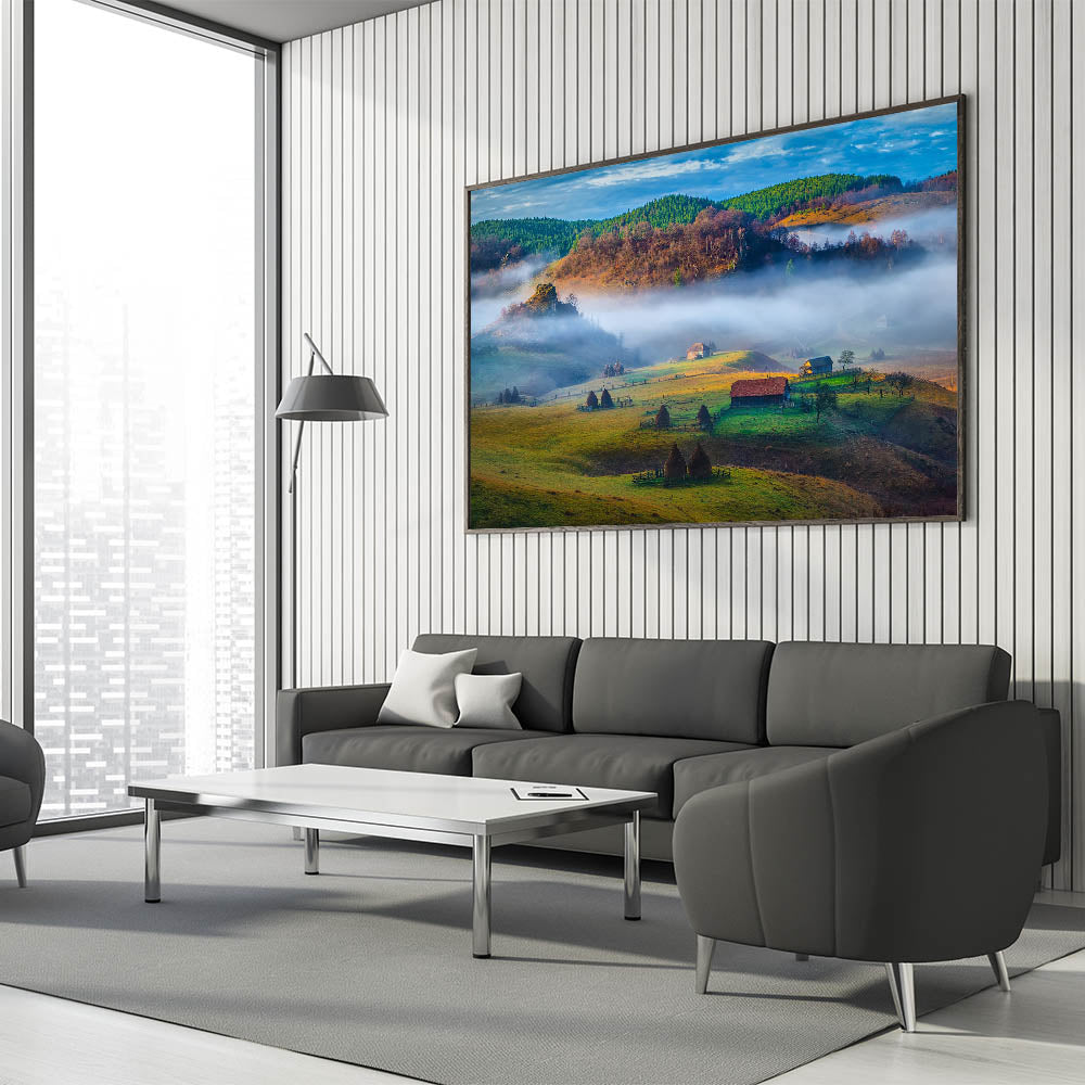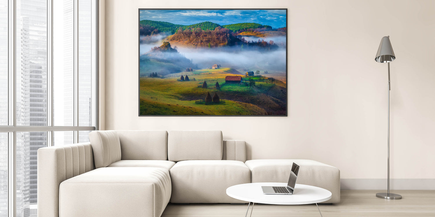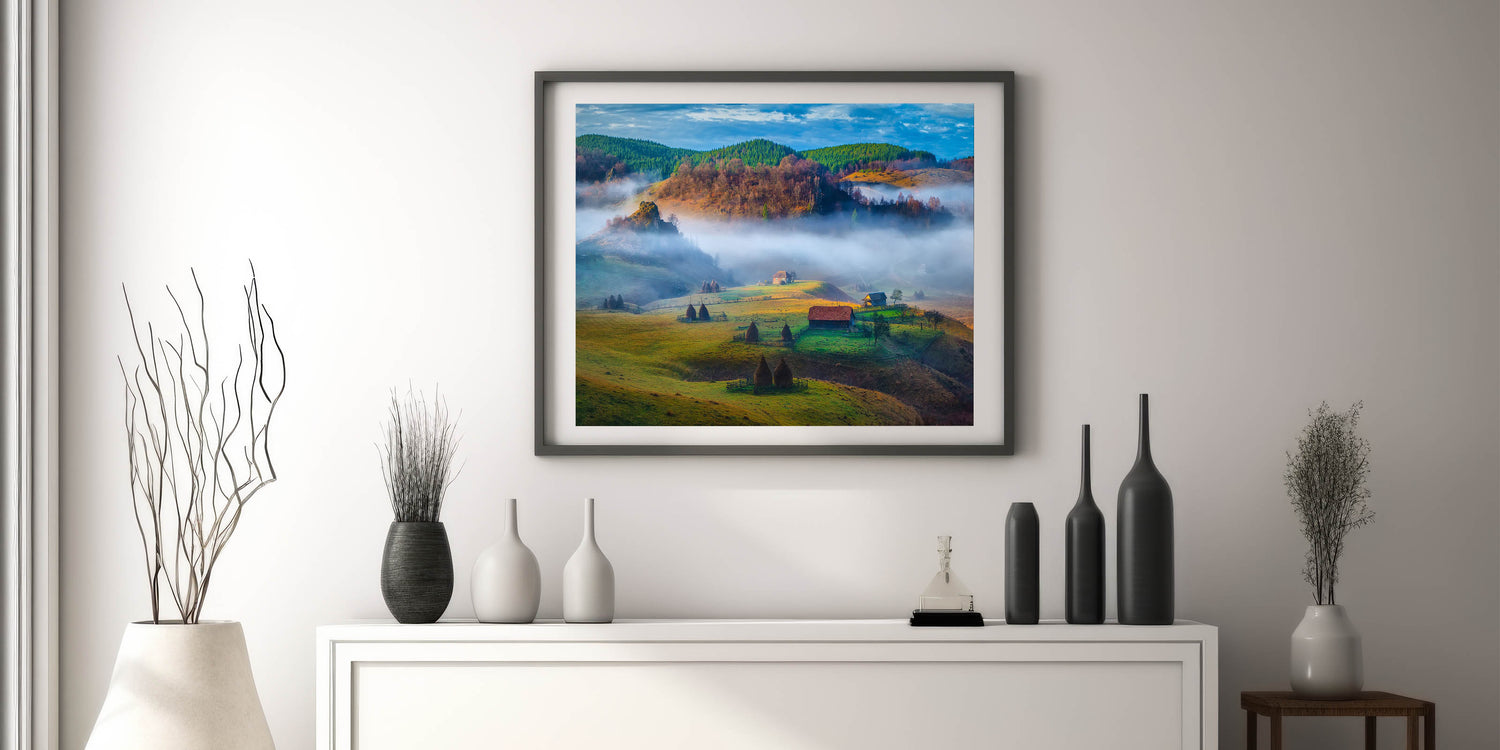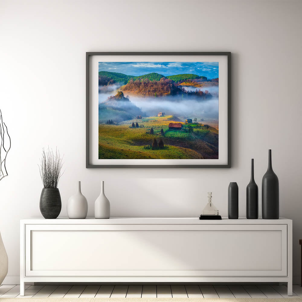 Step into the peaceful Romanian countryside with this stunning Carpathian Mountains art piece. The rolling hills, misty valleys, and serene rural landscape create a sense of calm and tranquility. The vibrant greens and soft light transport you to a traditional Romanian scene, making this print an ideal addition to any space.