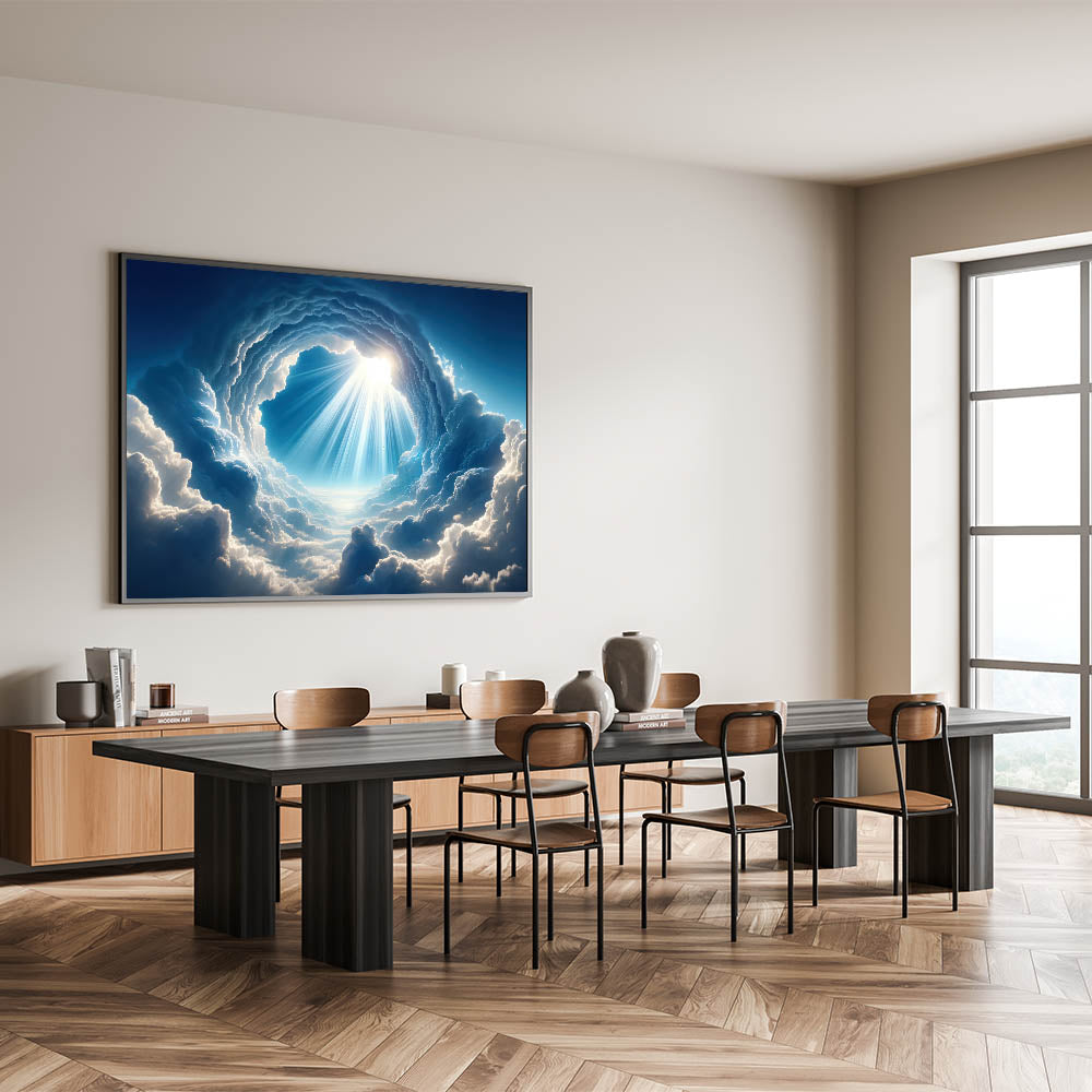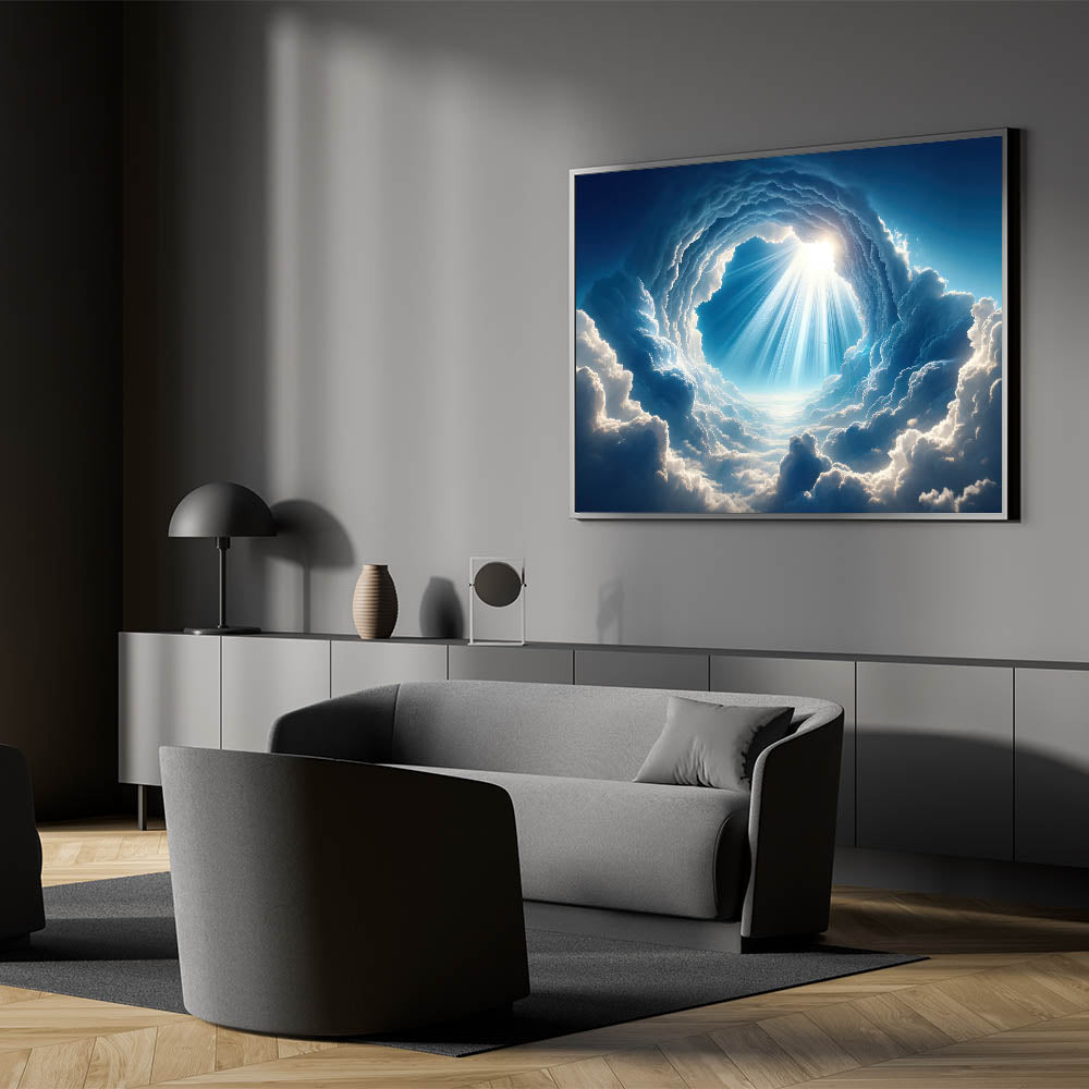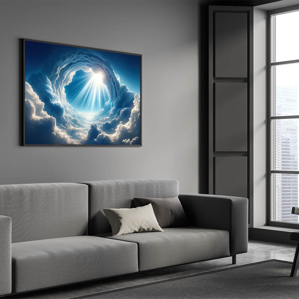 Elevate your space with this mesmerizing celestial cloudscape art, capturing the awe-inspiring beauty of sunlight piercing through the clouds. This skyscape canvas print is a perfect piece for those who appreciate the grandeur of nature and the serenity it brings. The intricate details of the clouds and the radiant beams of light create a captivating focal point in any room, whether it's a living room, bedroom, or office.