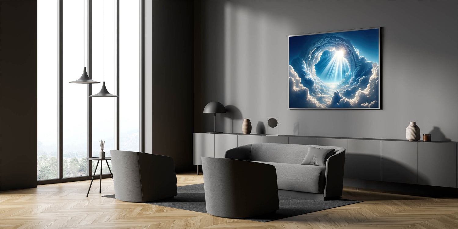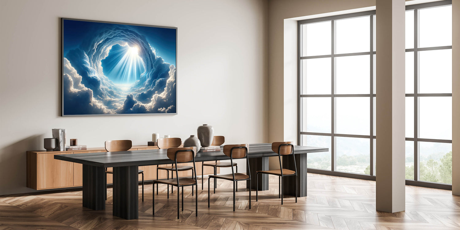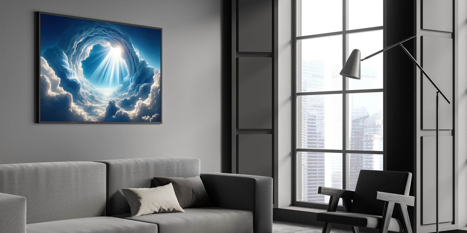 Elevate your space with this mesmerizing celestial cloudscape art, capturing the awe-inspiring beauty of sunlight piercing through the clouds. This skyscape canvas print is a perfect piece for those who appreciate the grandeur of nature and the serenity it brings. The intricate details of the clouds and the radiant beams of light create a captivating focal point in any room, whether it's a living room, bedroom, or office.
