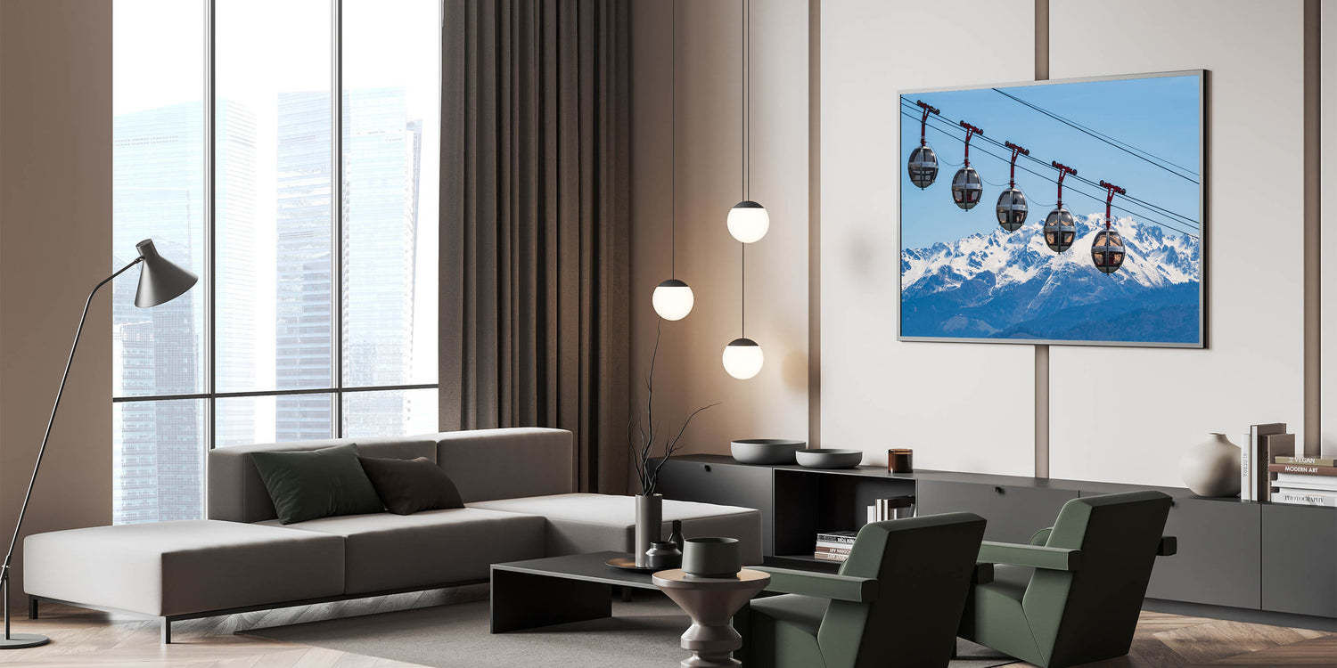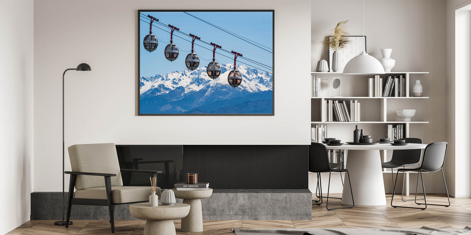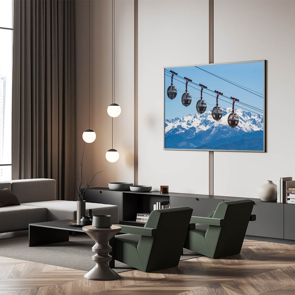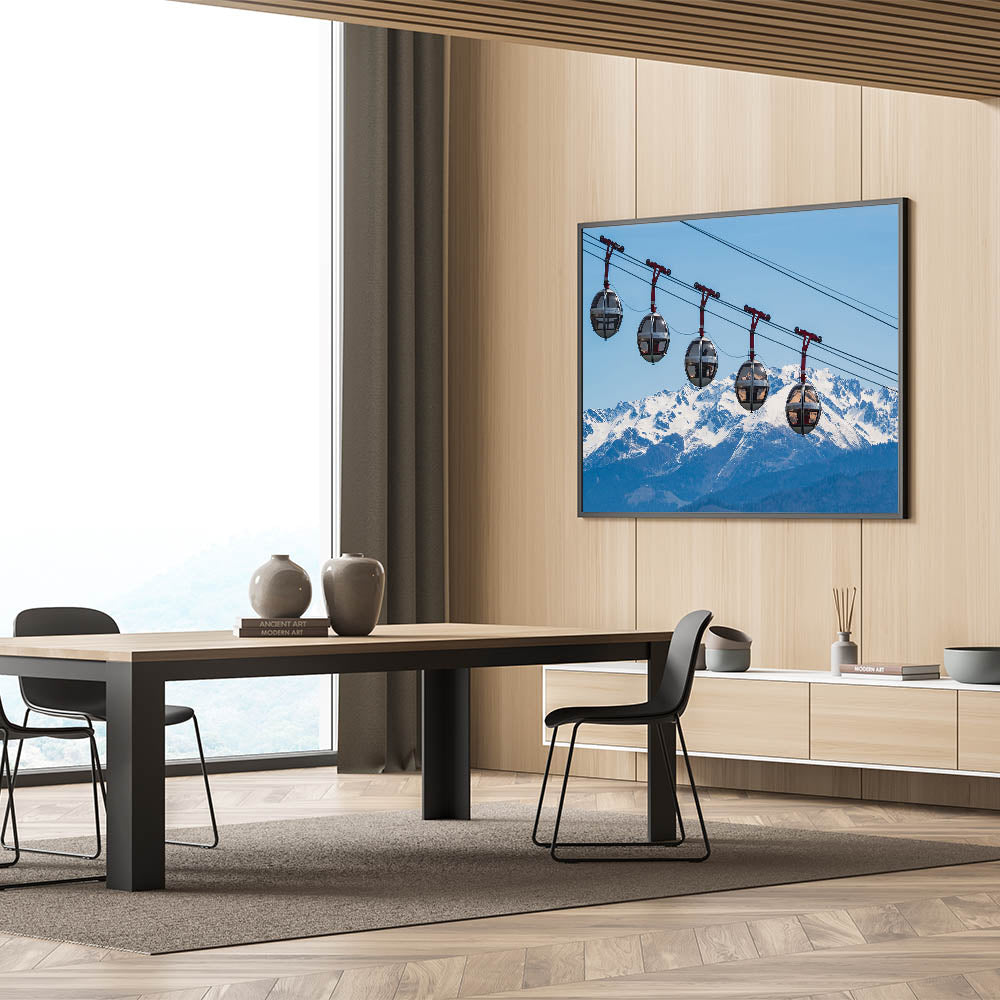Add a touch of adventure to your space with this stunning French Alps wall art, featuring the iconic cable cars of the Chamonix Mont Blanc region. The bold red cable cars stand out against the crisp blue sky and majestic snow-covered peaks, creating a dynamic and thrilling scene. This art piece perfectly captures the essence of alpine life, where nature’s beauty meets the excitement of mountain exploration.