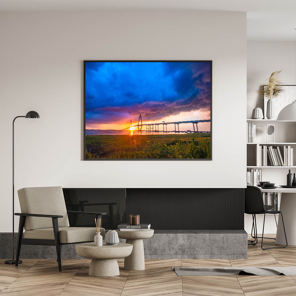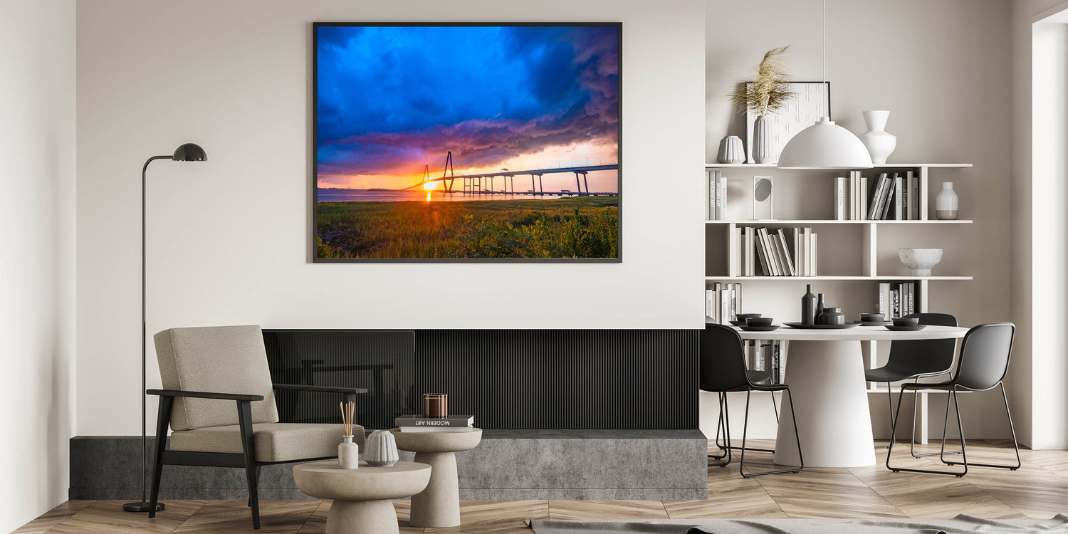Bring the vibrant colors of a Charleston sunset into your home with this stunning photograph of the Ravenel Bridge. This Charleston scenic art captures the beauty of the setting sun as it dips behind the iconic bridge, painting the sky with brilliant shades of blue, purple, and orange. The dramatic clouds and glowing horizon create a breathtaking contrast, making this artwork the perfect statement piece for any room.