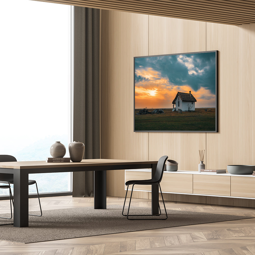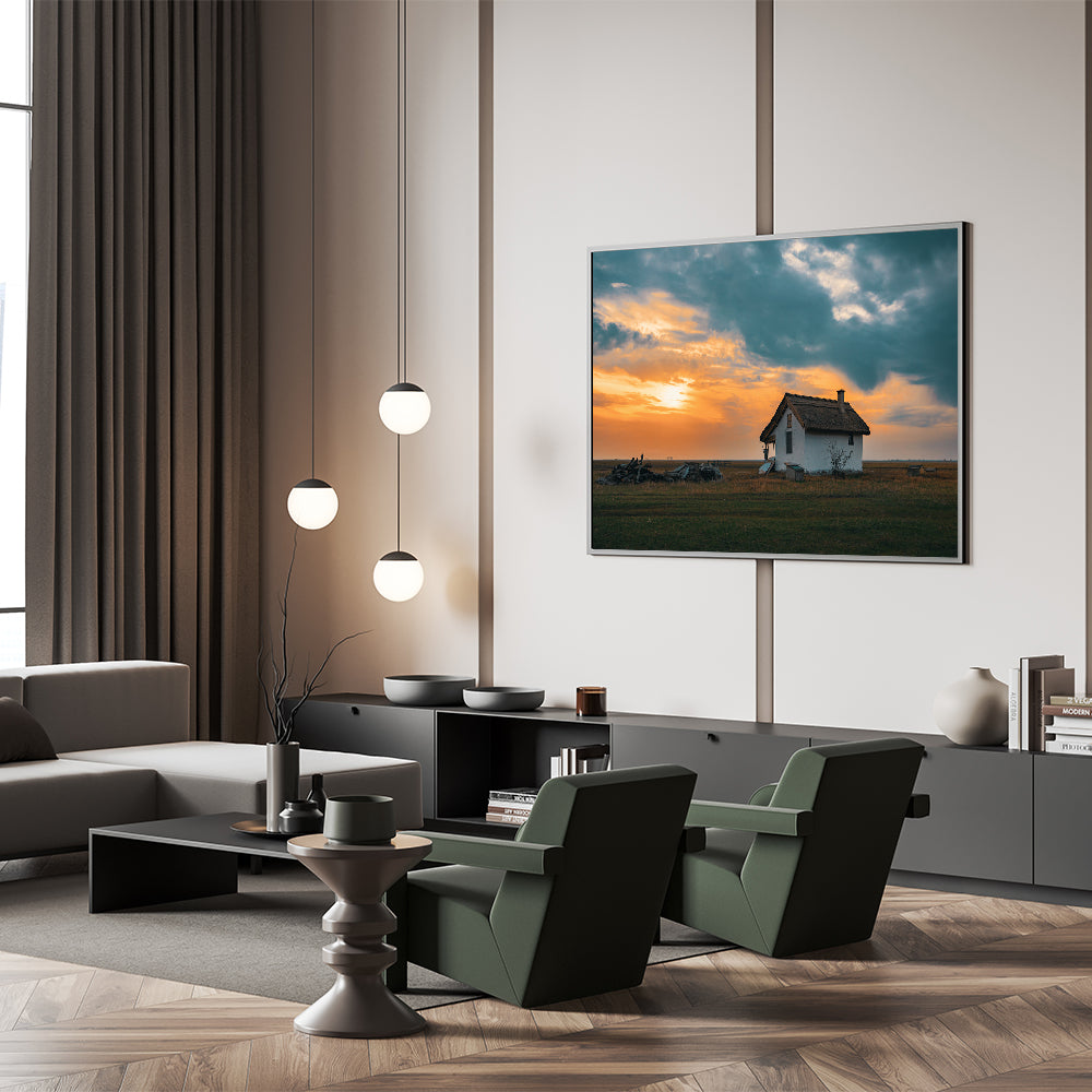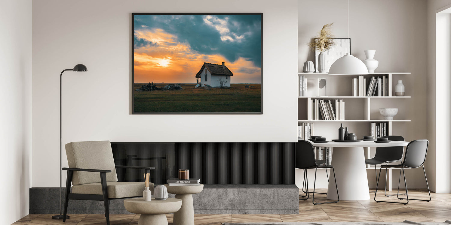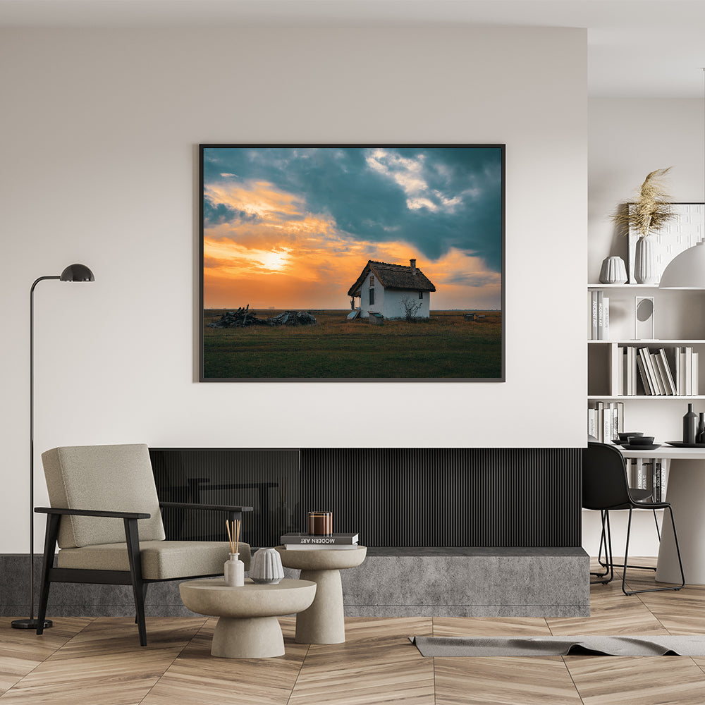 Bring the serene beauty of rural architecture into your home with this captivating piece of house wall art. This stunning design showcases a charming, rustic house set against a breathtaking sunset, with warm hues of orange and yellow blending seamlessly into the cool blues of the evening sky. The peaceful landscape is the perfect embodiment of architectural house art, making it an ideal addition to any space in need of a modern house decor touch.