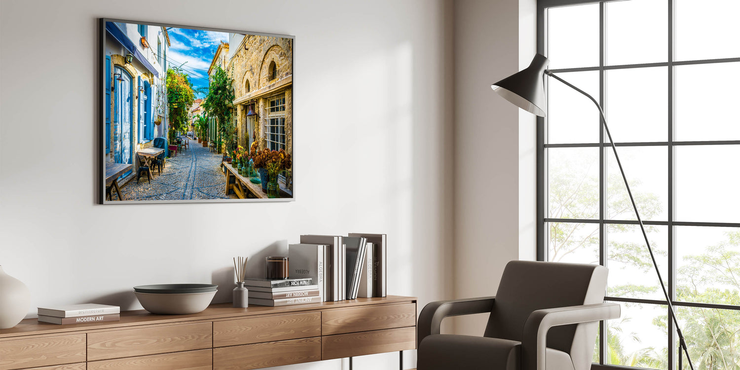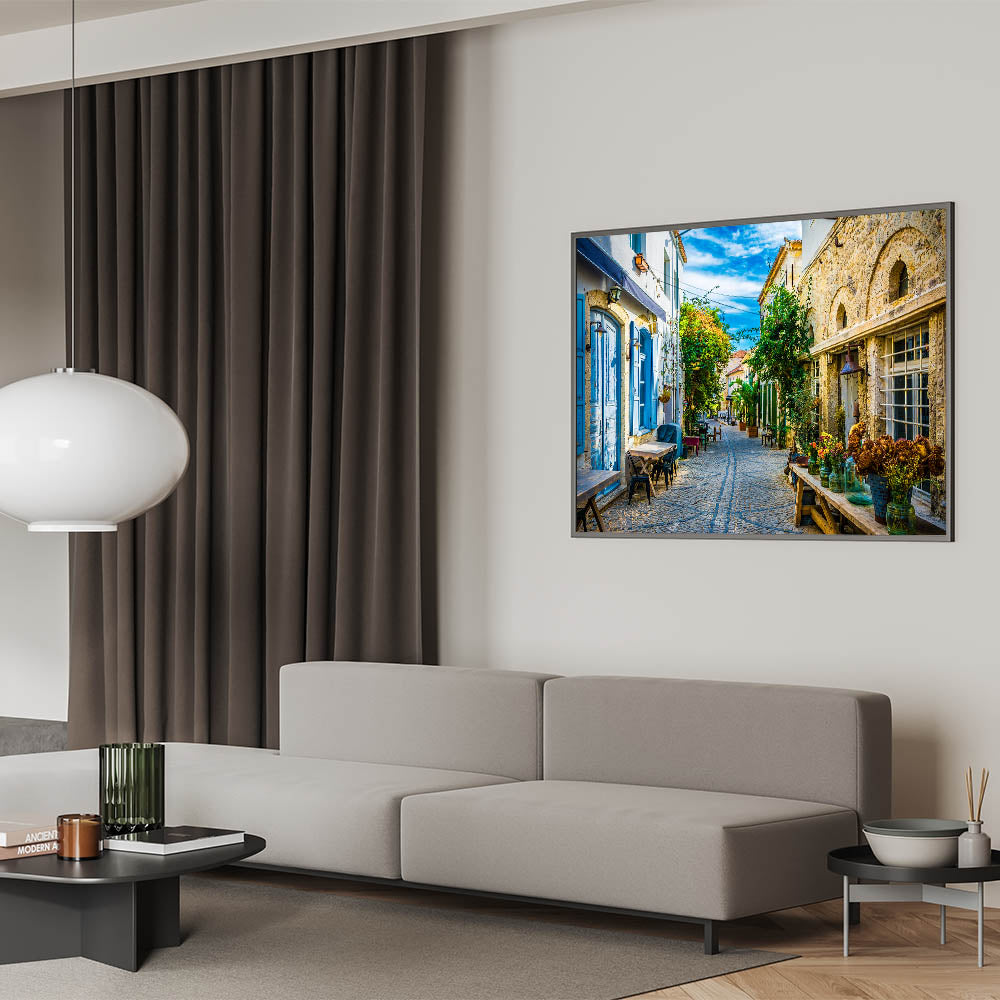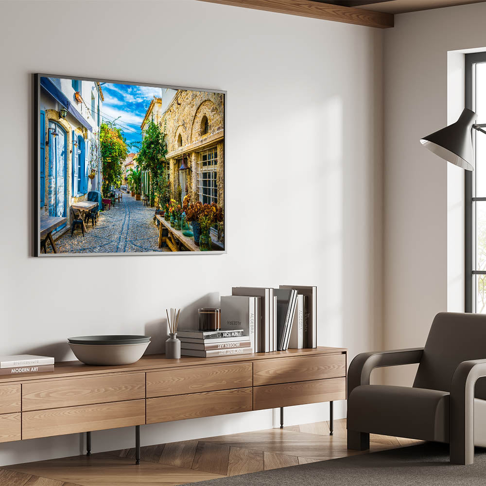 This charming Mediterranean streetscape canvas artwork is an excellent choice for bringing the beauty and warmth of a Mediterranean village into your home. It’s perfect for creating a welcoming and vibrant atmosphere in any space.