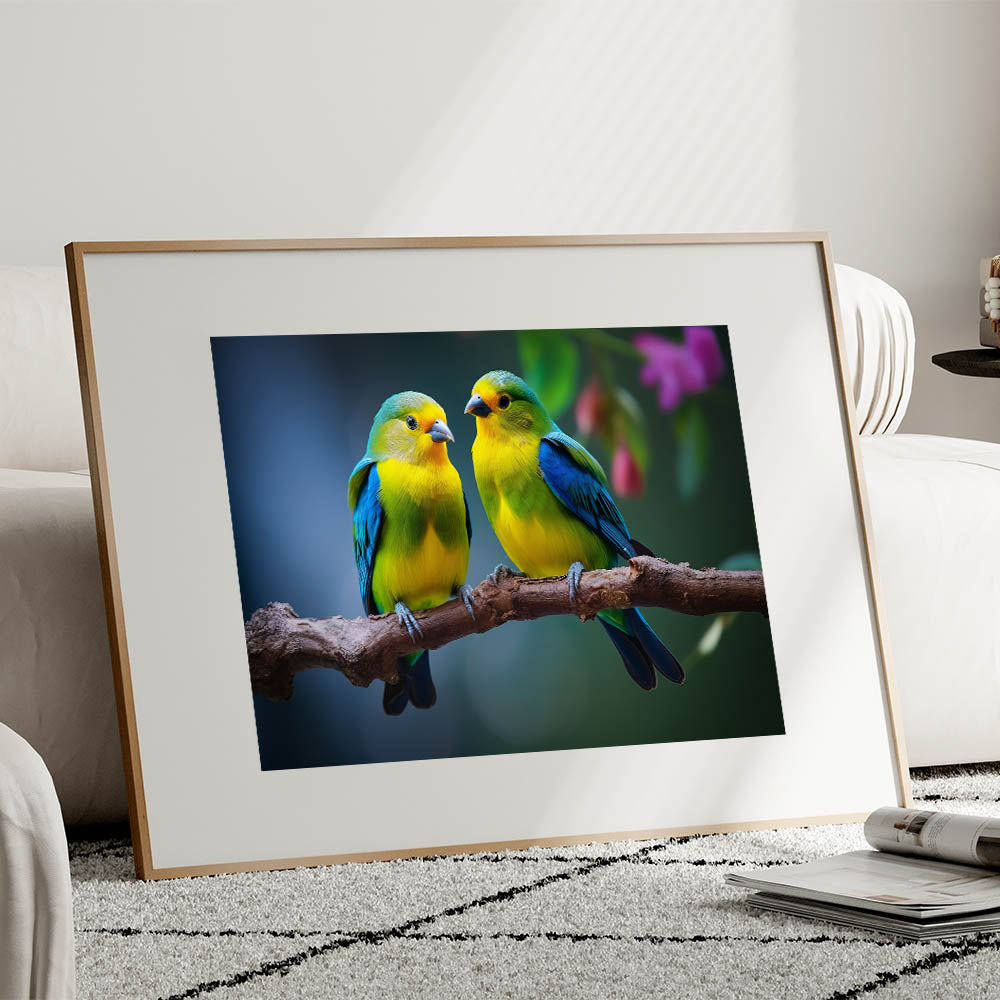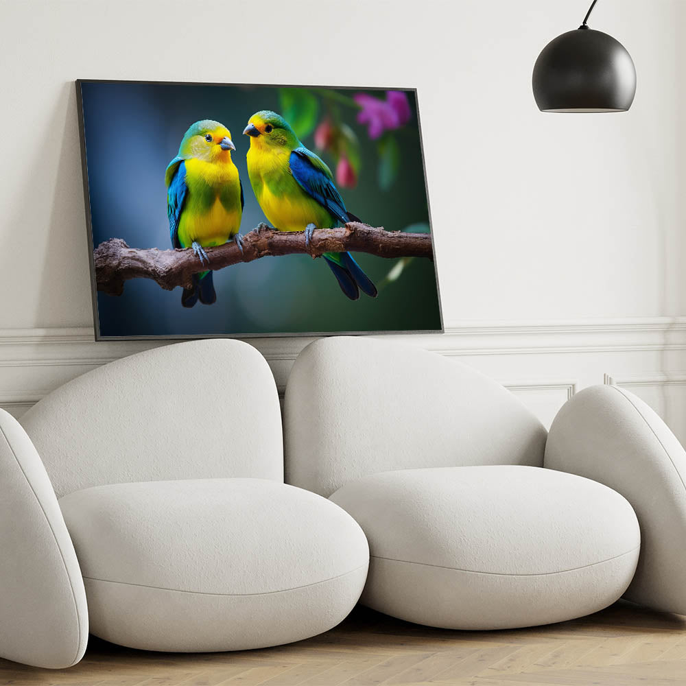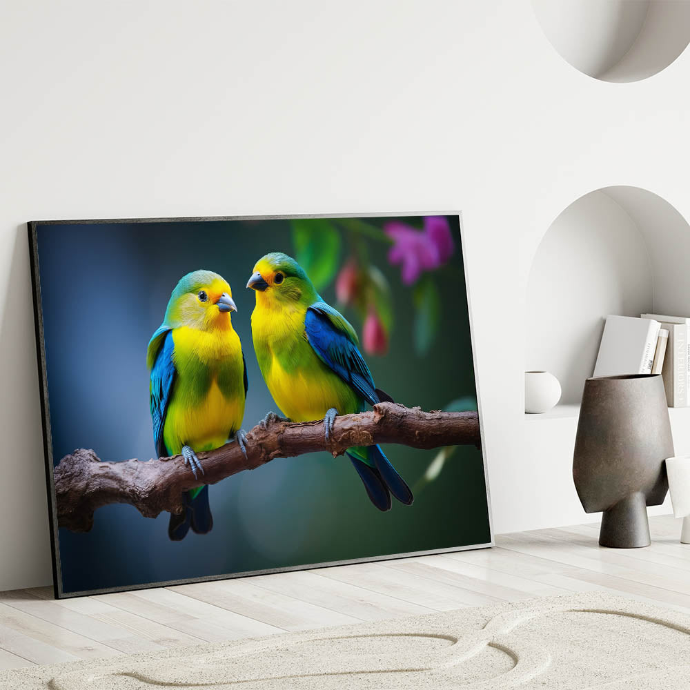 Brighten your space with the delightful charm of this Charming Tropical Bird Pair Wall Art. This artwork captures a beautiful moment between two tropical birds, perched closely on a branch, with vibrant yellow and blue plumage that stands out against the soft, natural background. The intricate details and vivid colors make this piece a perfect addition to any room that could use a touch of color and warmth.