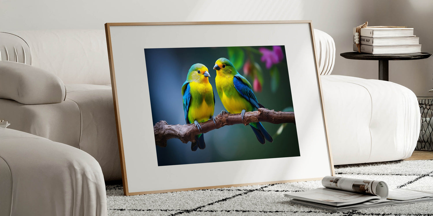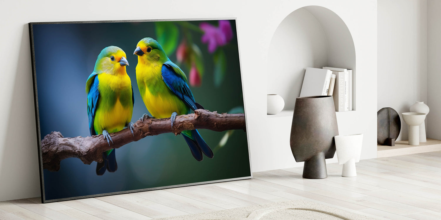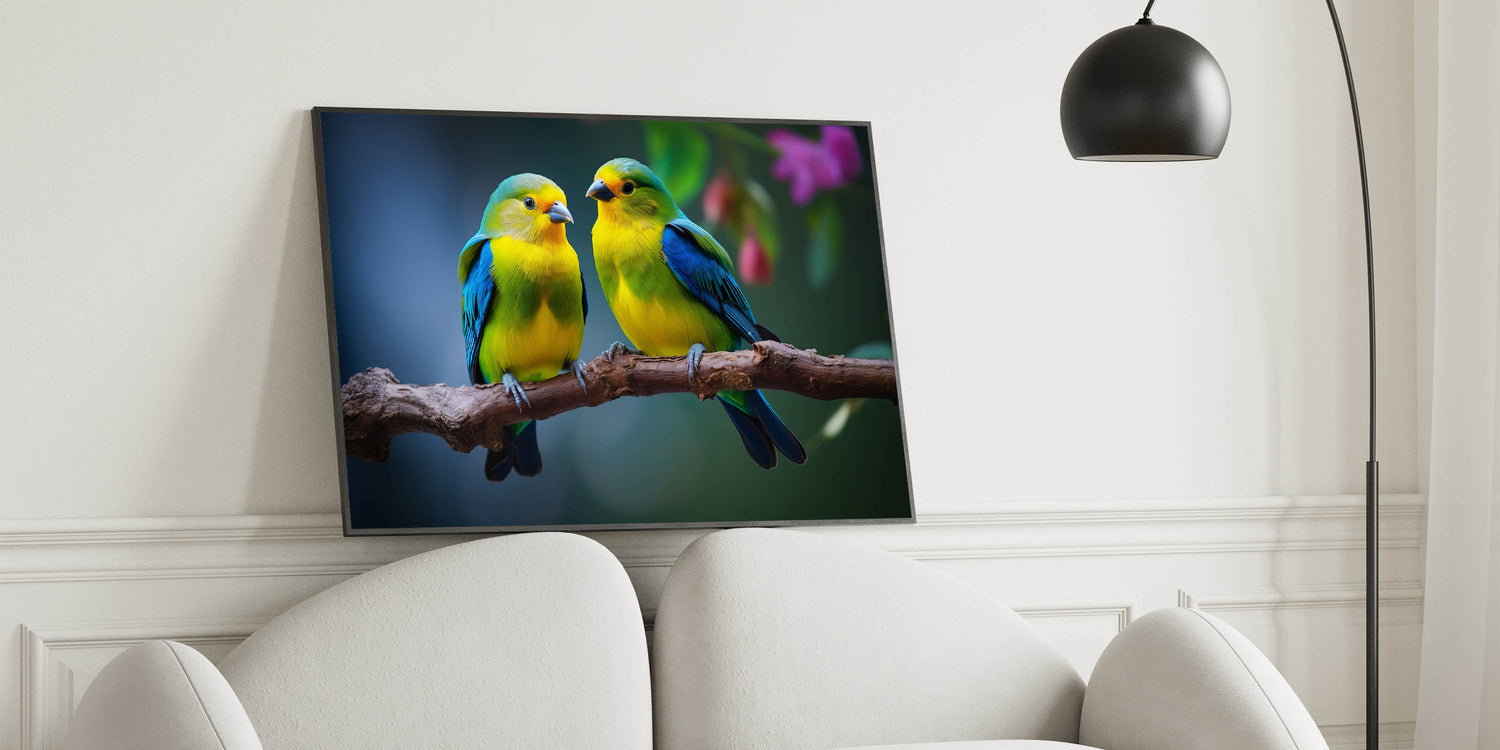 Brighten your space with the delightful charm of this Charming Tropical Bird Pair Wall Art. This artwork captures a beautiful moment between two tropical birds, perched closely on a branch, with vibrant yellow and blue plumage that stands out against the soft, natural background. The intricate details and vivid colors make this piece a perfect addition to any room that could use a touch of color and warmth.